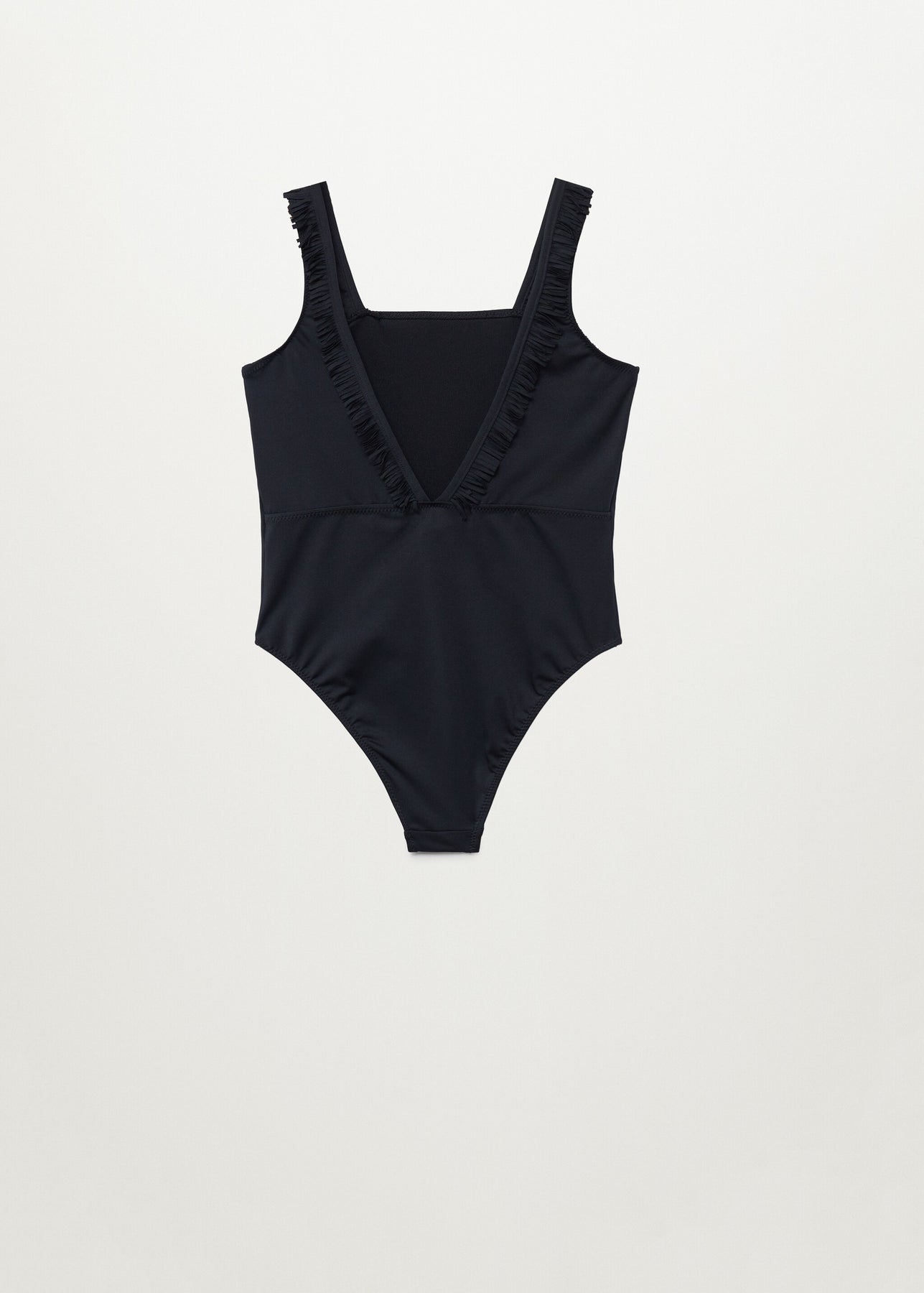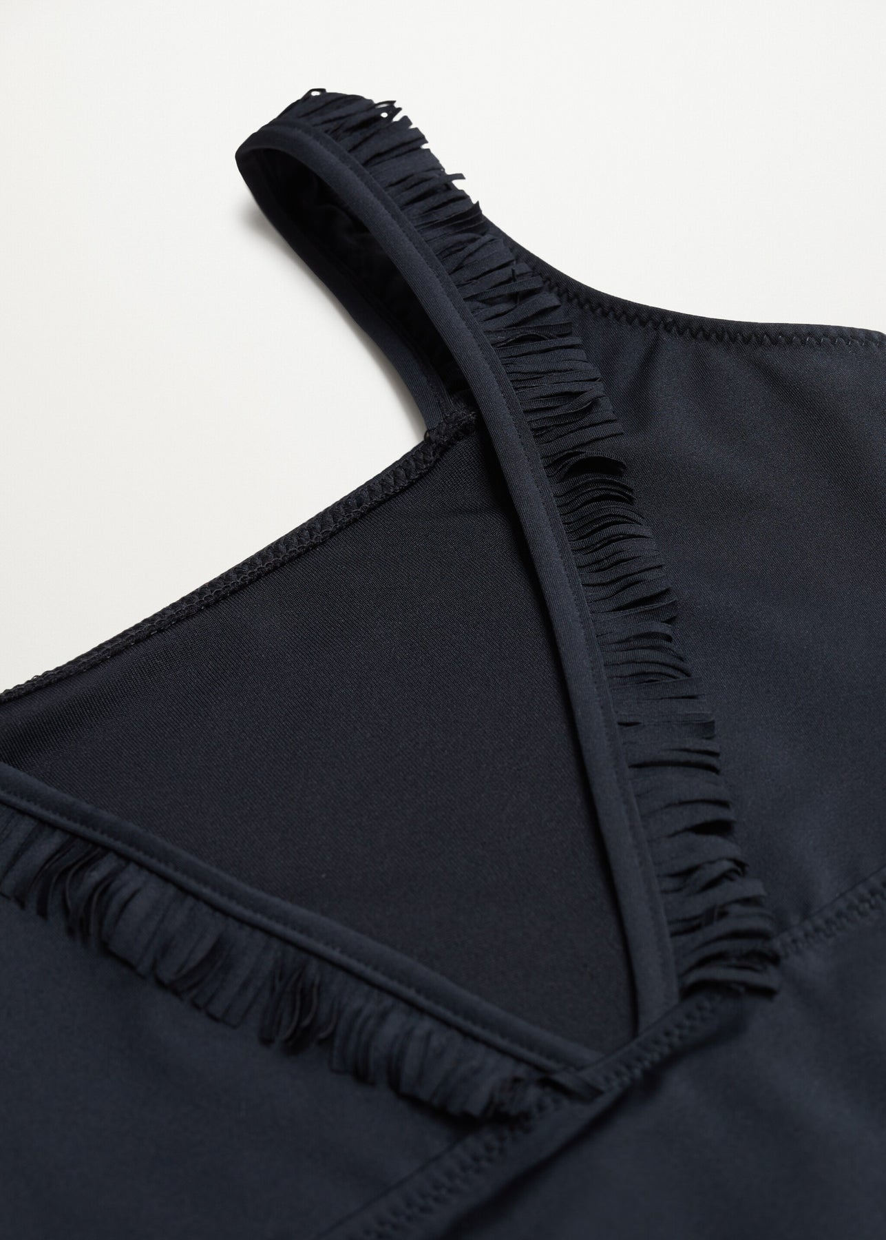 Tejido elástico. Escote cuadrado. Tirantes anchos. Flecos decorativos. Escote de pico en la parte posterior. Terminaciones elásticas. Forro interior.