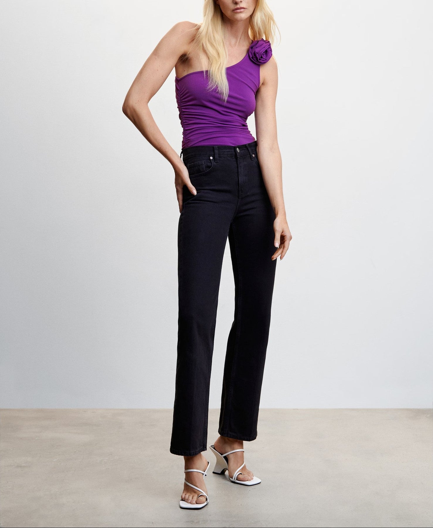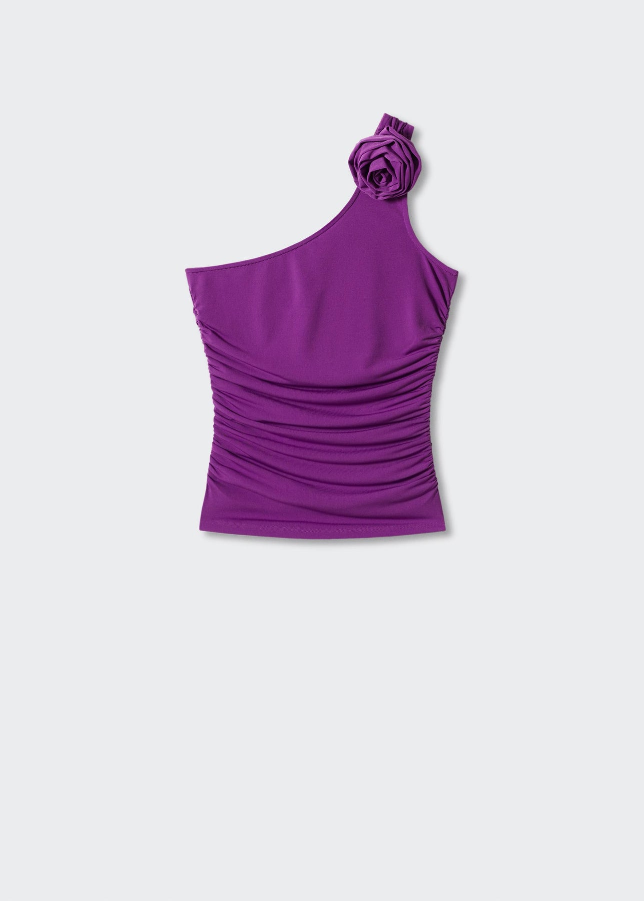 Tejido fluido. Diseño asimétrico. Diseño entallado. Maxi flor. Cuello asimétrico. Tirante ancho. Sin cierre. Detalles fruncidos. Festival Season.