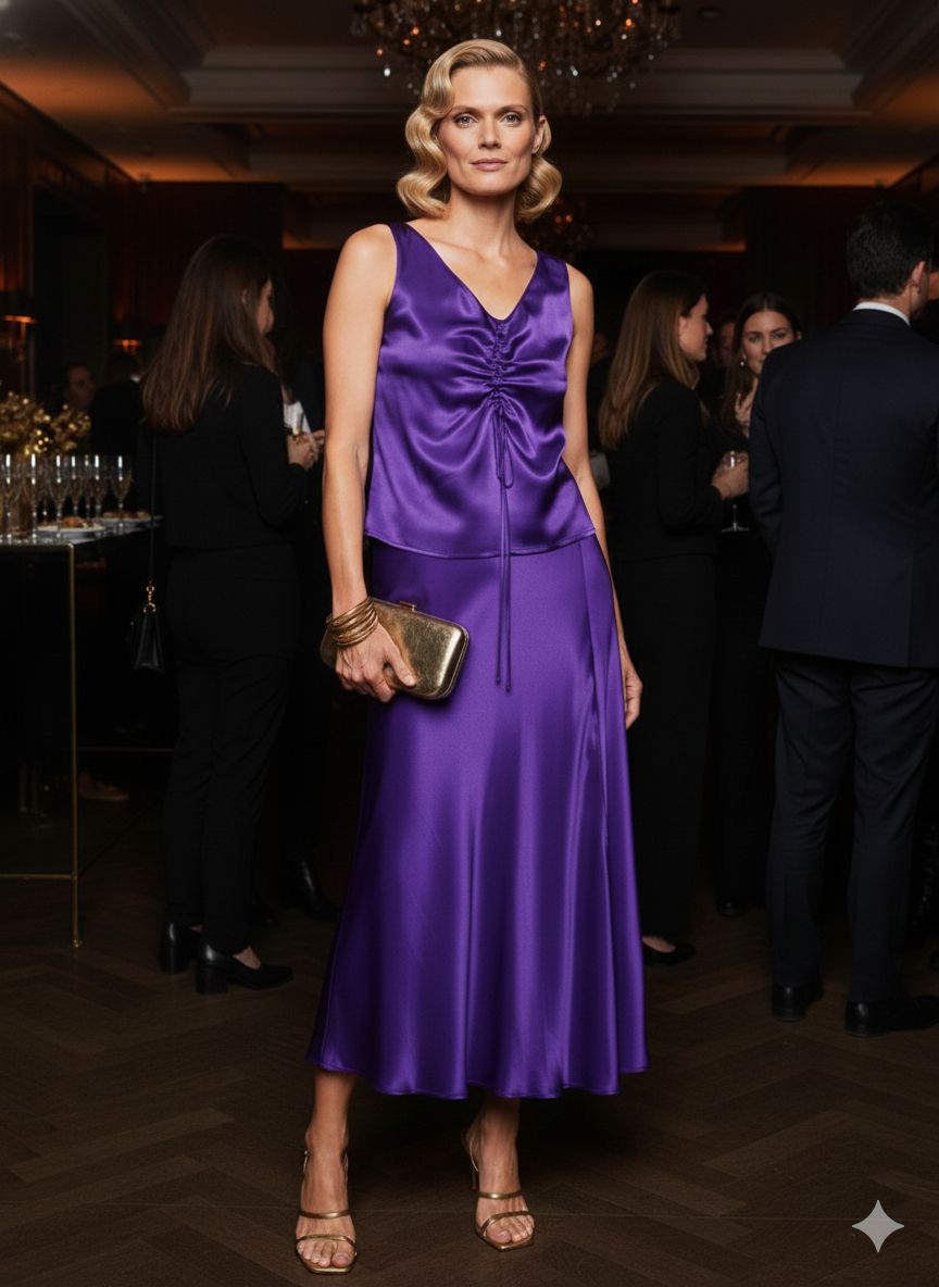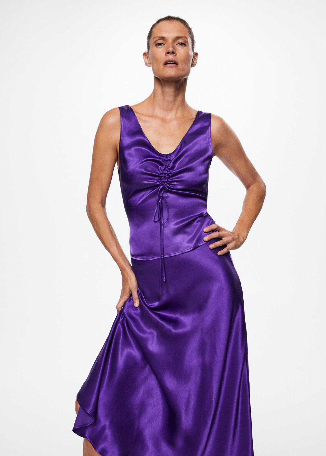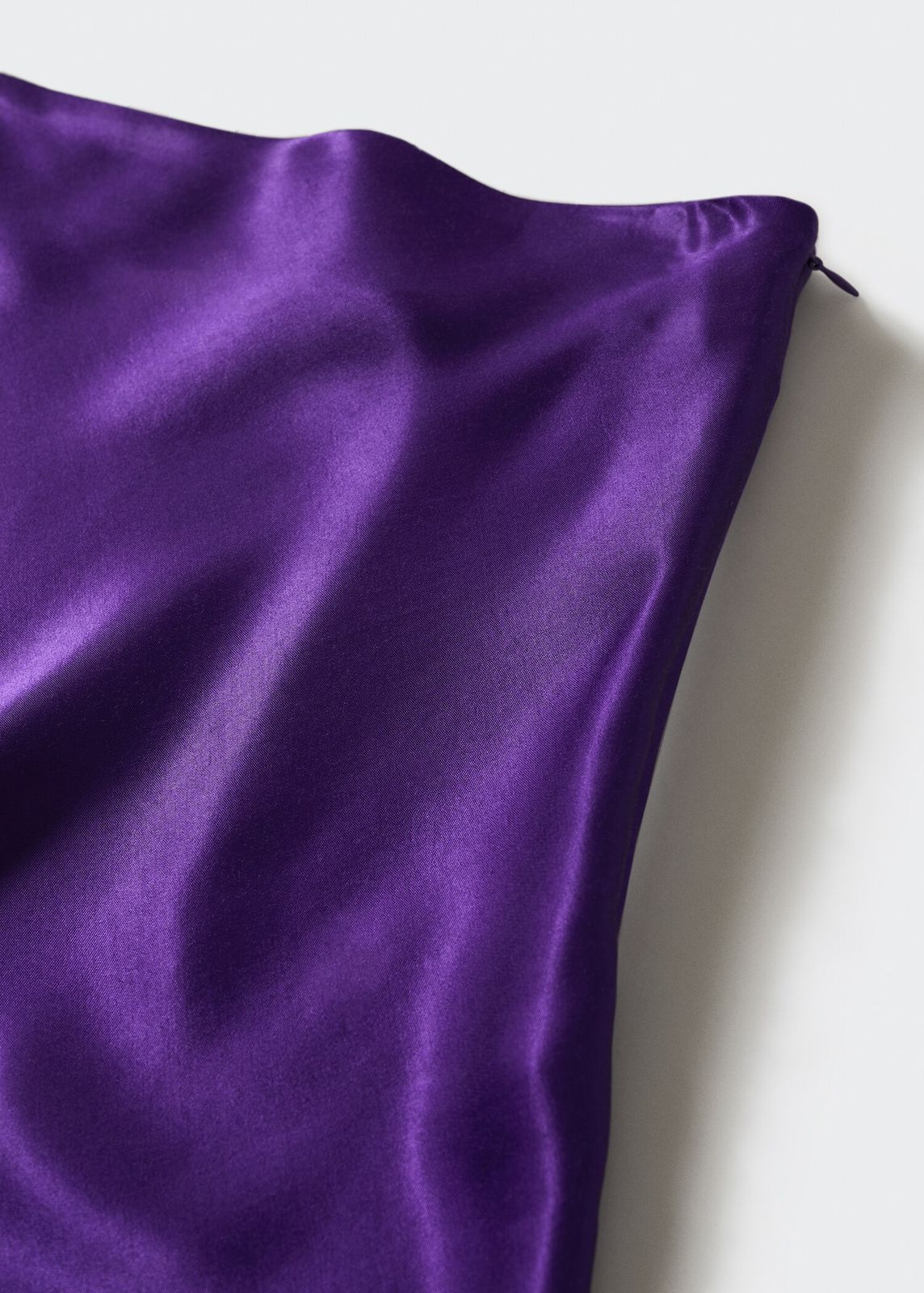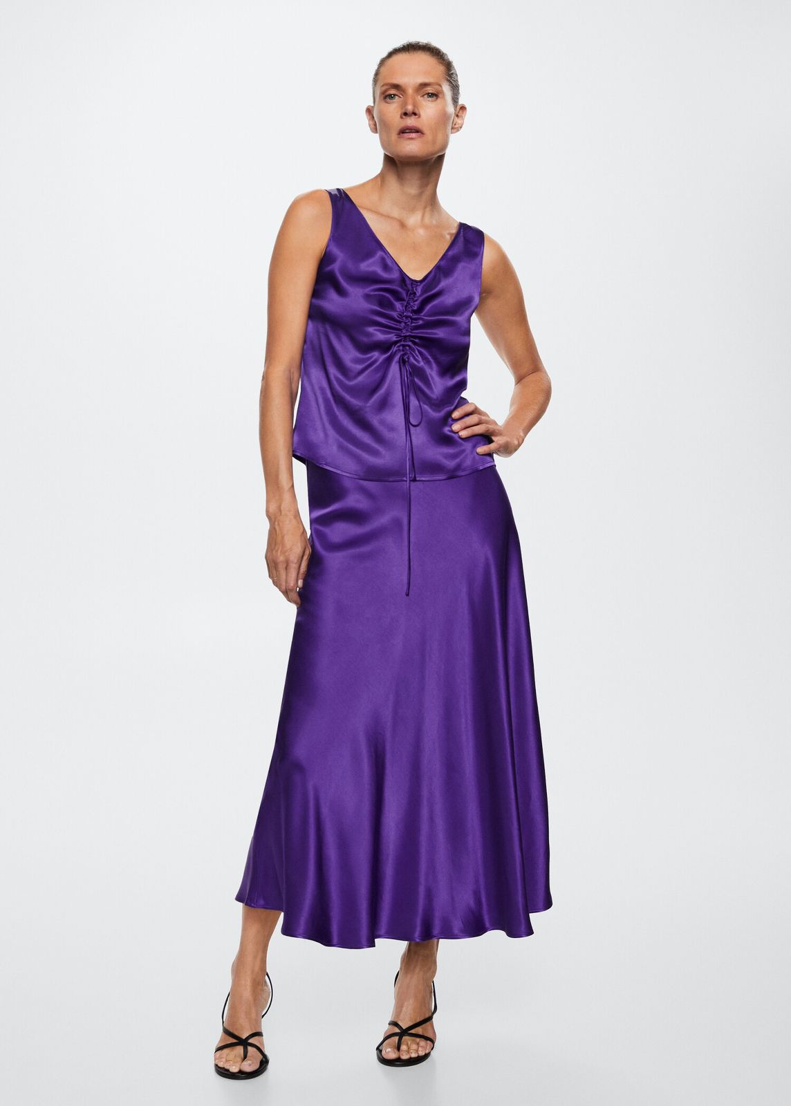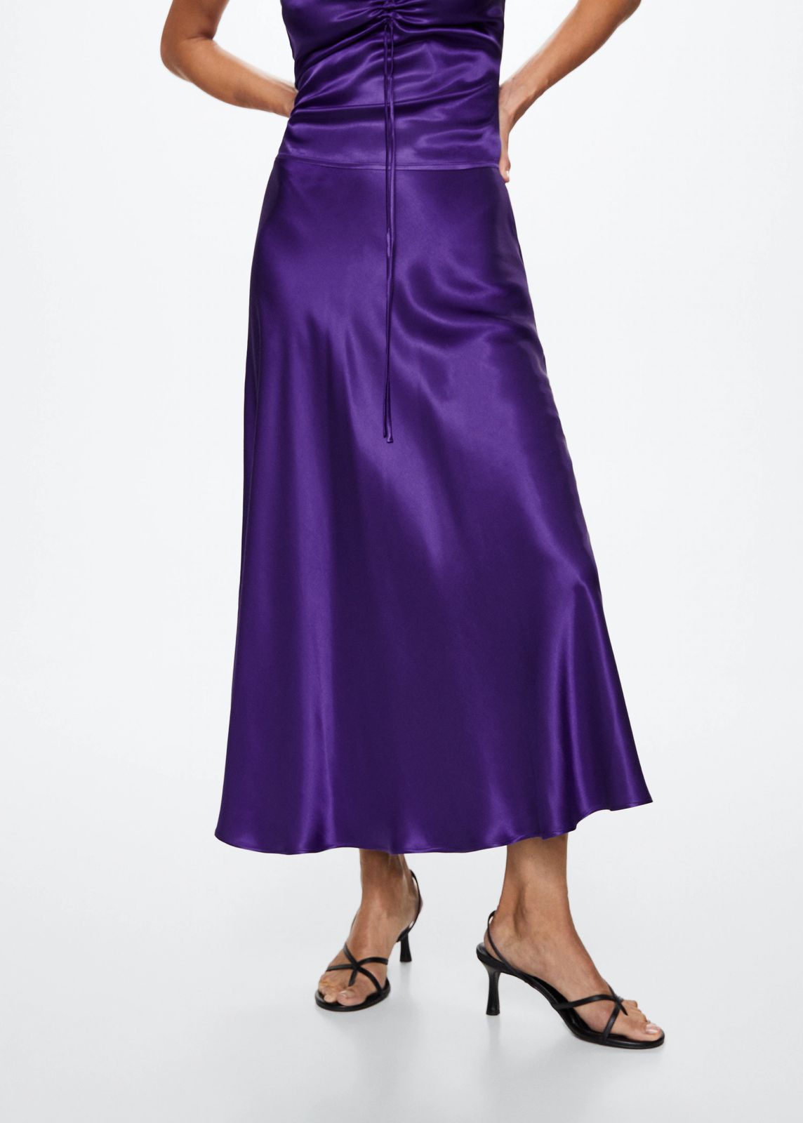 Tejido fluido. Tejido satinado. Diseño midi. Diseño evasé. Cierre cremallera invisible en el lateral. Colección fiesta y ceremonia.