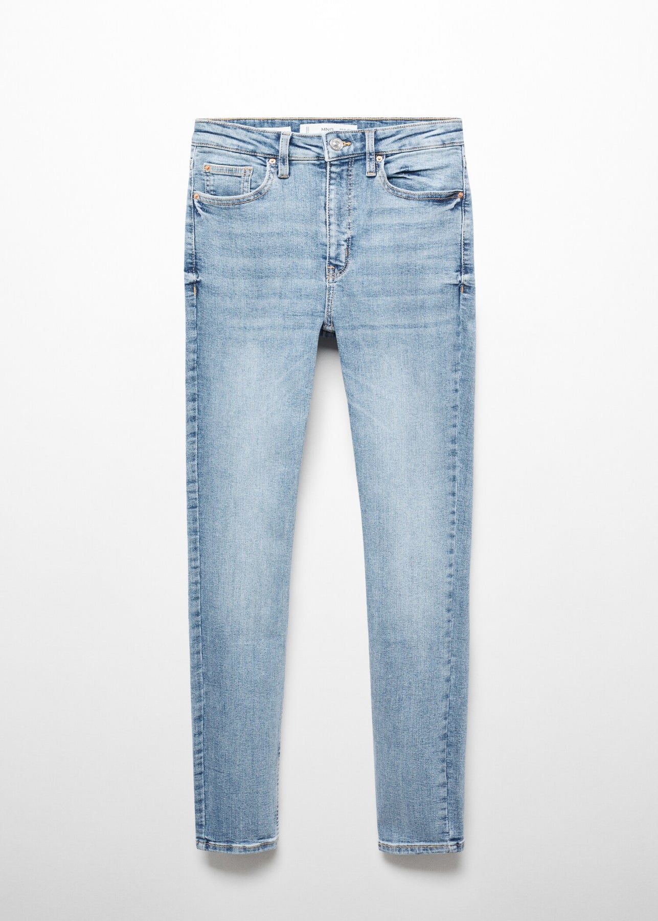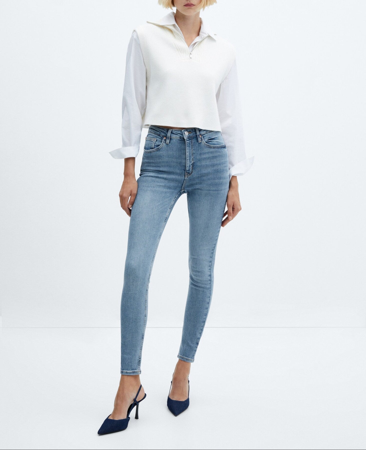 Tejido de algodón estilo tejano vaquero. Corte skinny. Diseño entallado. Tiro alto. Trabillas. Cinco bolsillos. Cierre de cremallera y botón. Largo interior 76 cm. Full length.