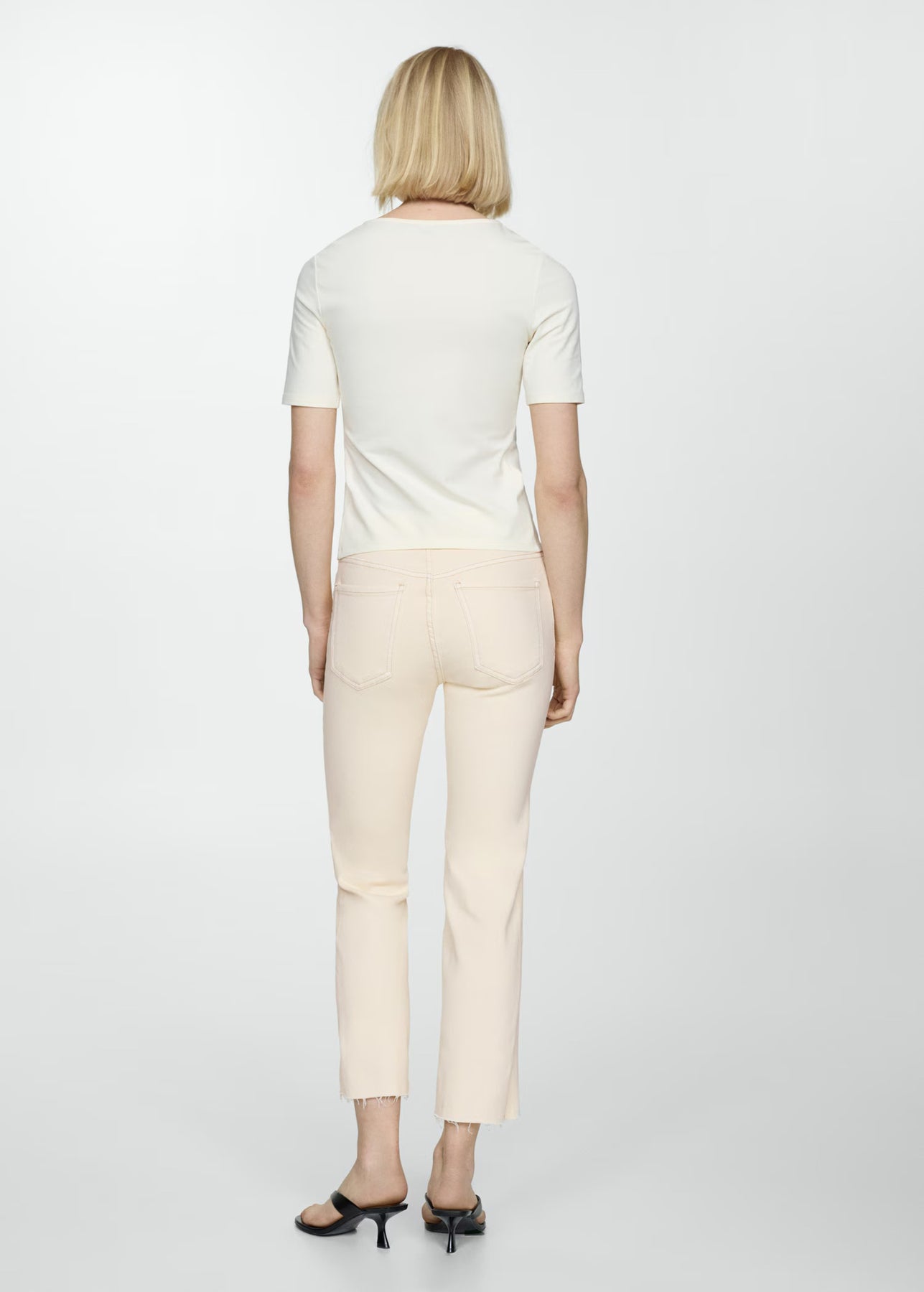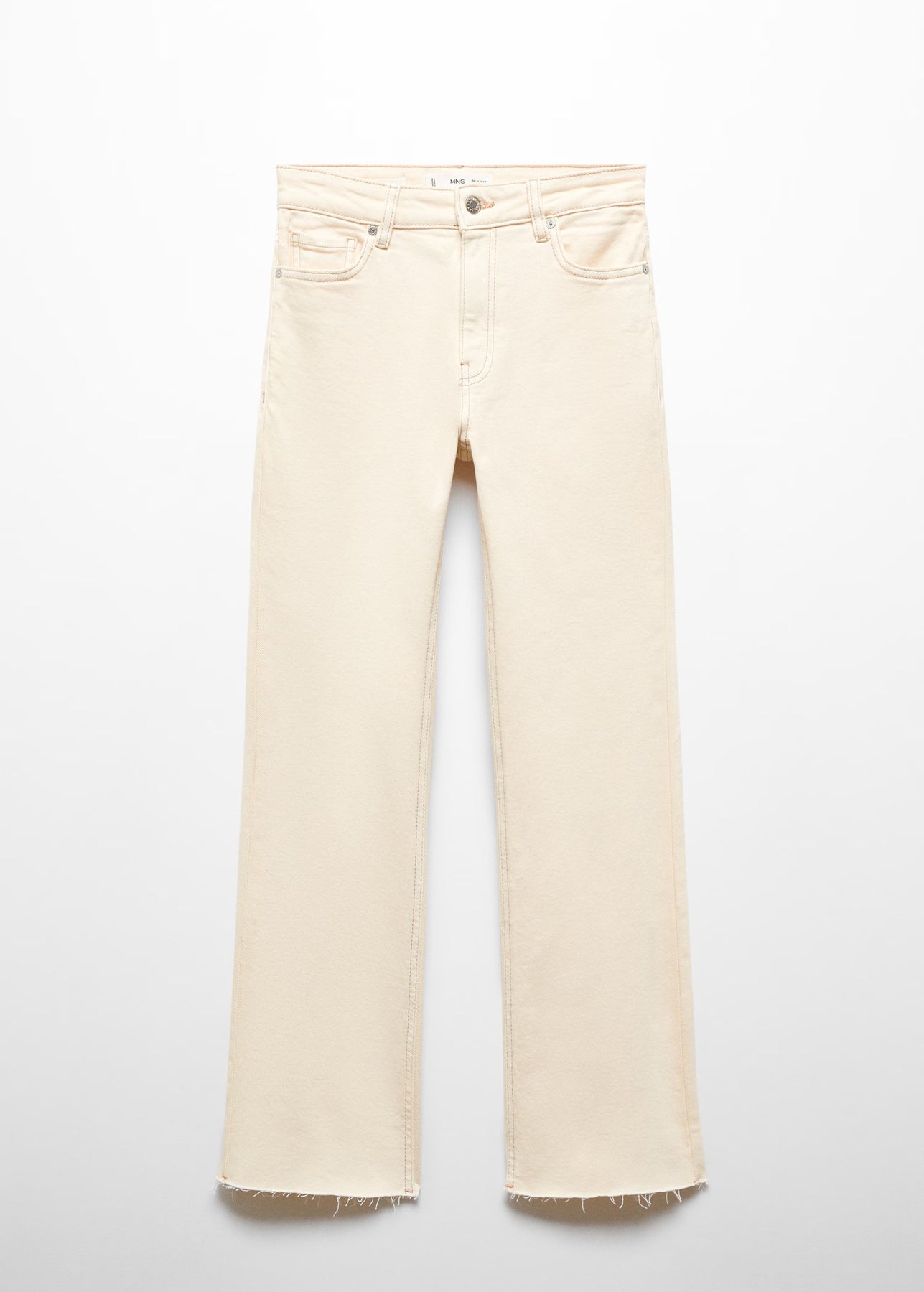 Tejido de algodón estilo tejano vaquero. Tejido elástico. Diseño acampanado. Estilo flare. Diseño crop. Tiro alto. Trabillas. Cinco bolsillos. Cierre de cremallera y botón. Largo interior 68 cm. Tejido mezcla de algodón reciclado. Bajo deshilachado.
