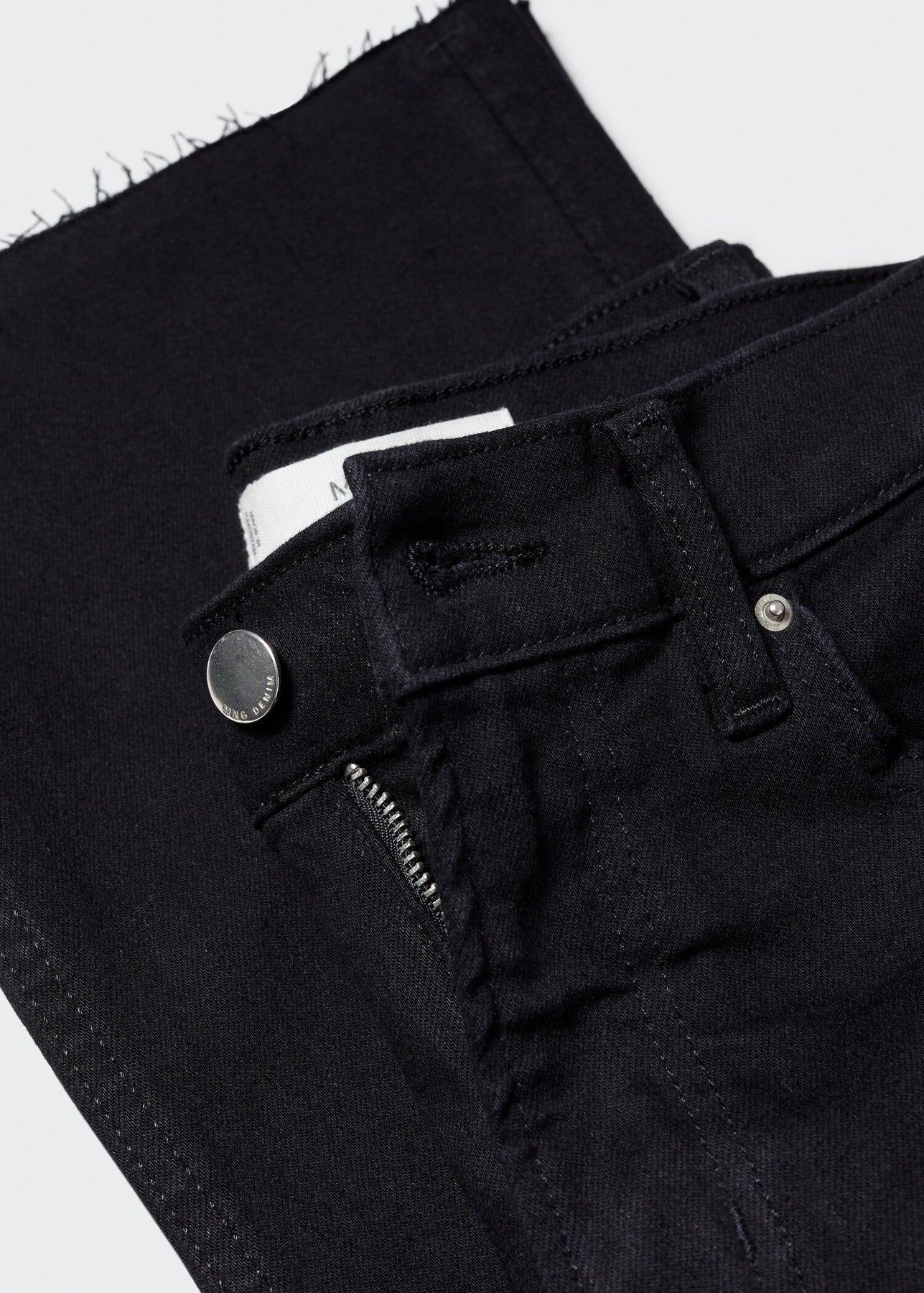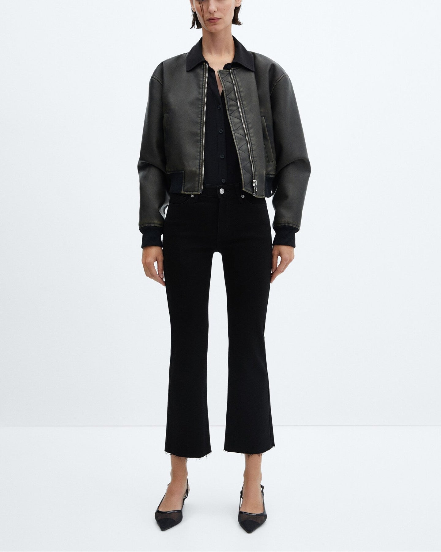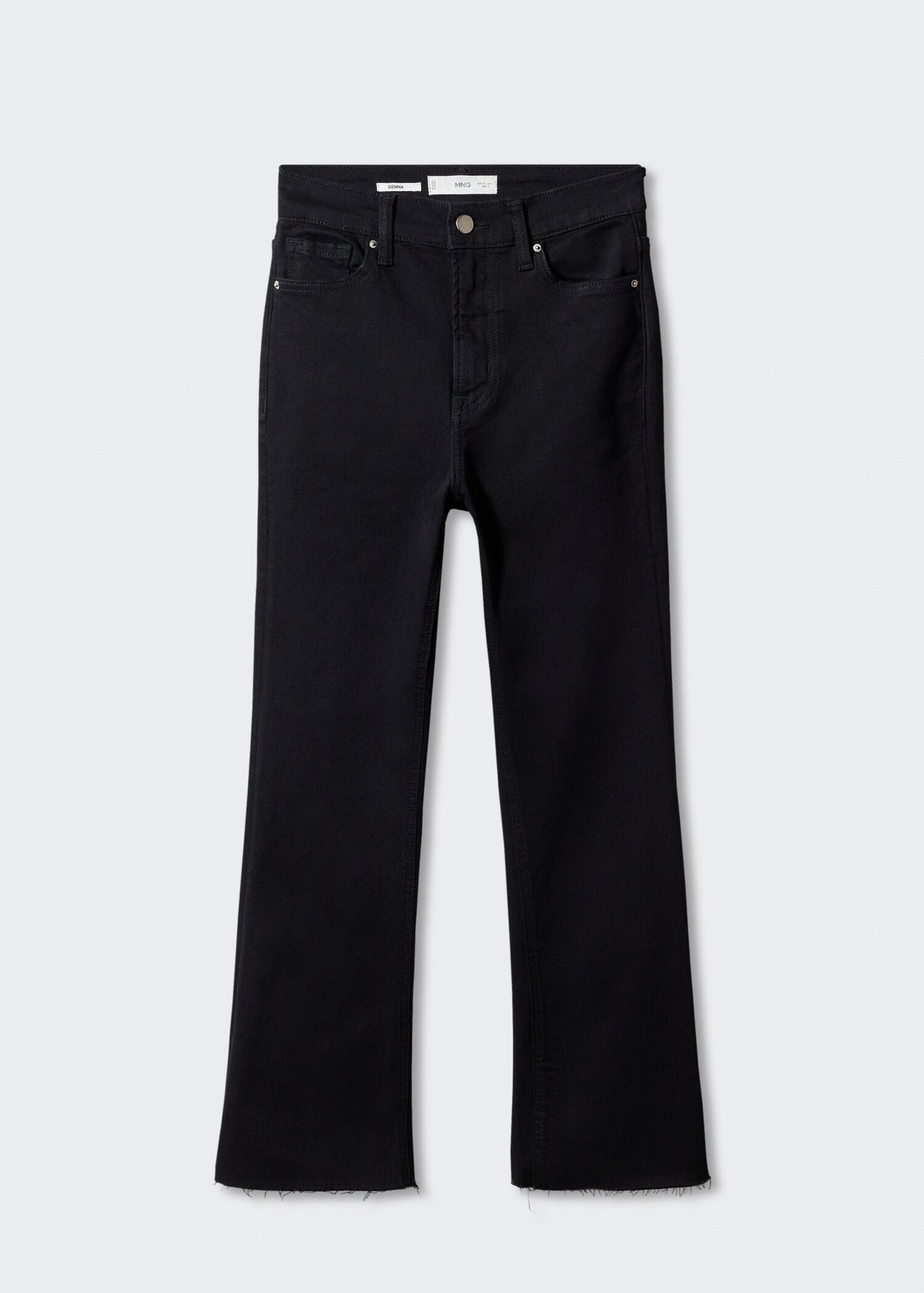 Tejido de algodón estilo tejano vaquero. Tejido mezcla de algodón reciclado. Tejido elástico. Diseño acampanado. Estilo flare. Diseño crop. Bajo deshilachado. Tiro alto. Trabillas. Cinco bolsillos. Cierre de cremallera y botón. Largo interior 68 cm.