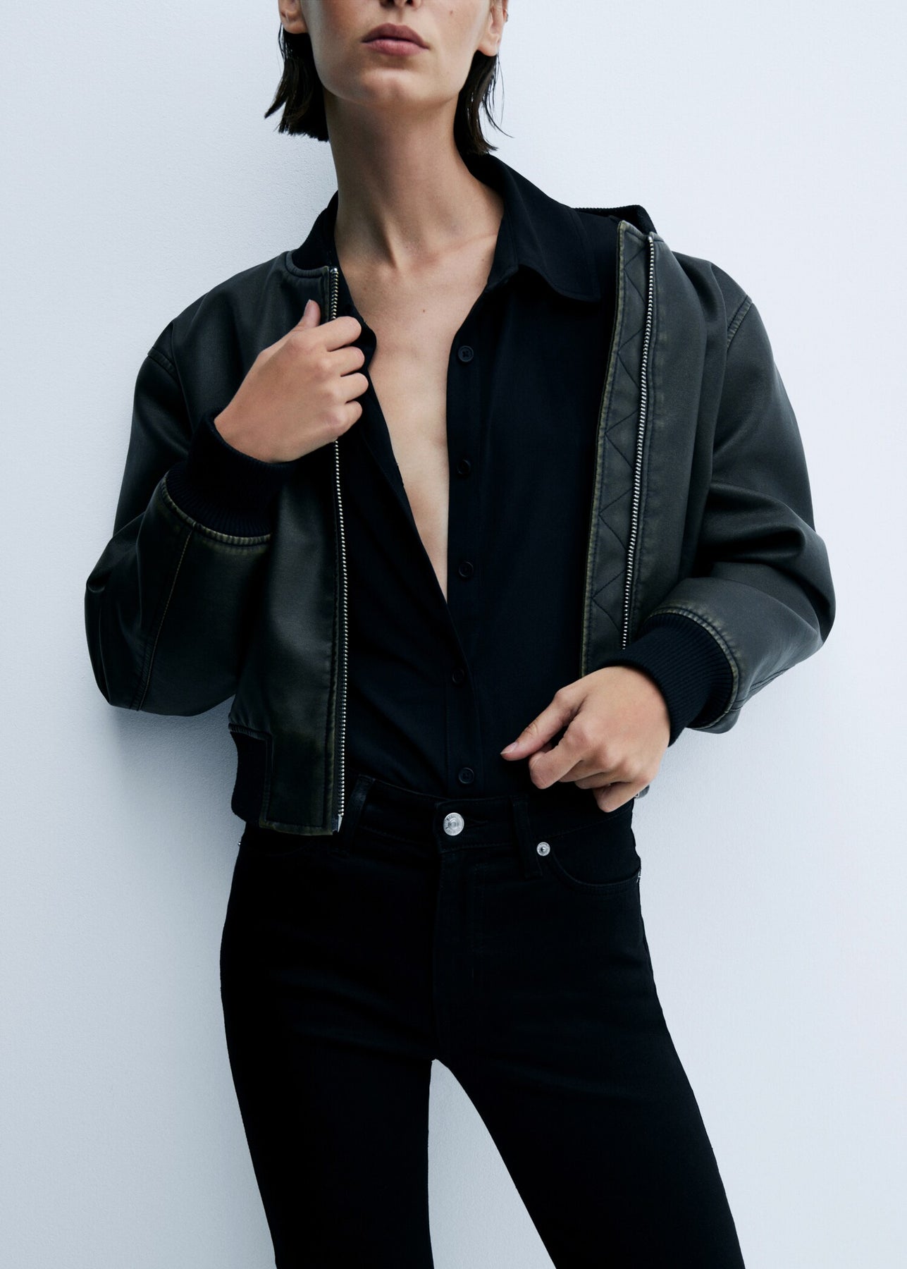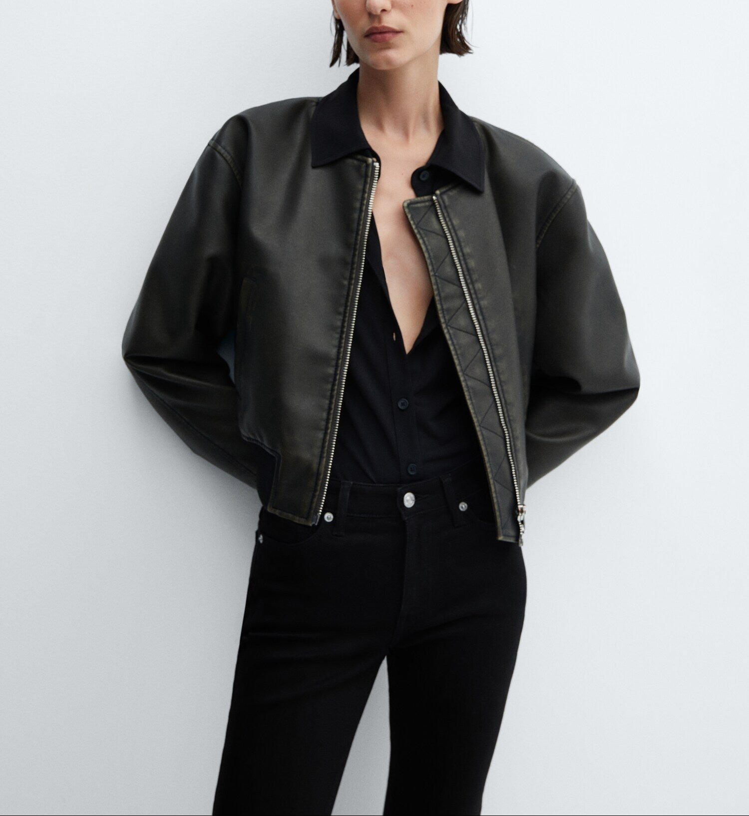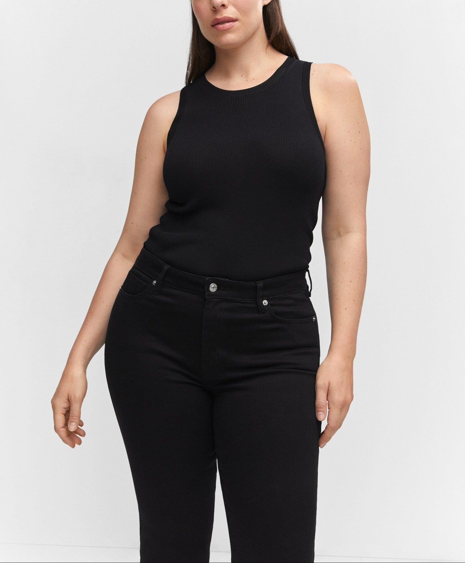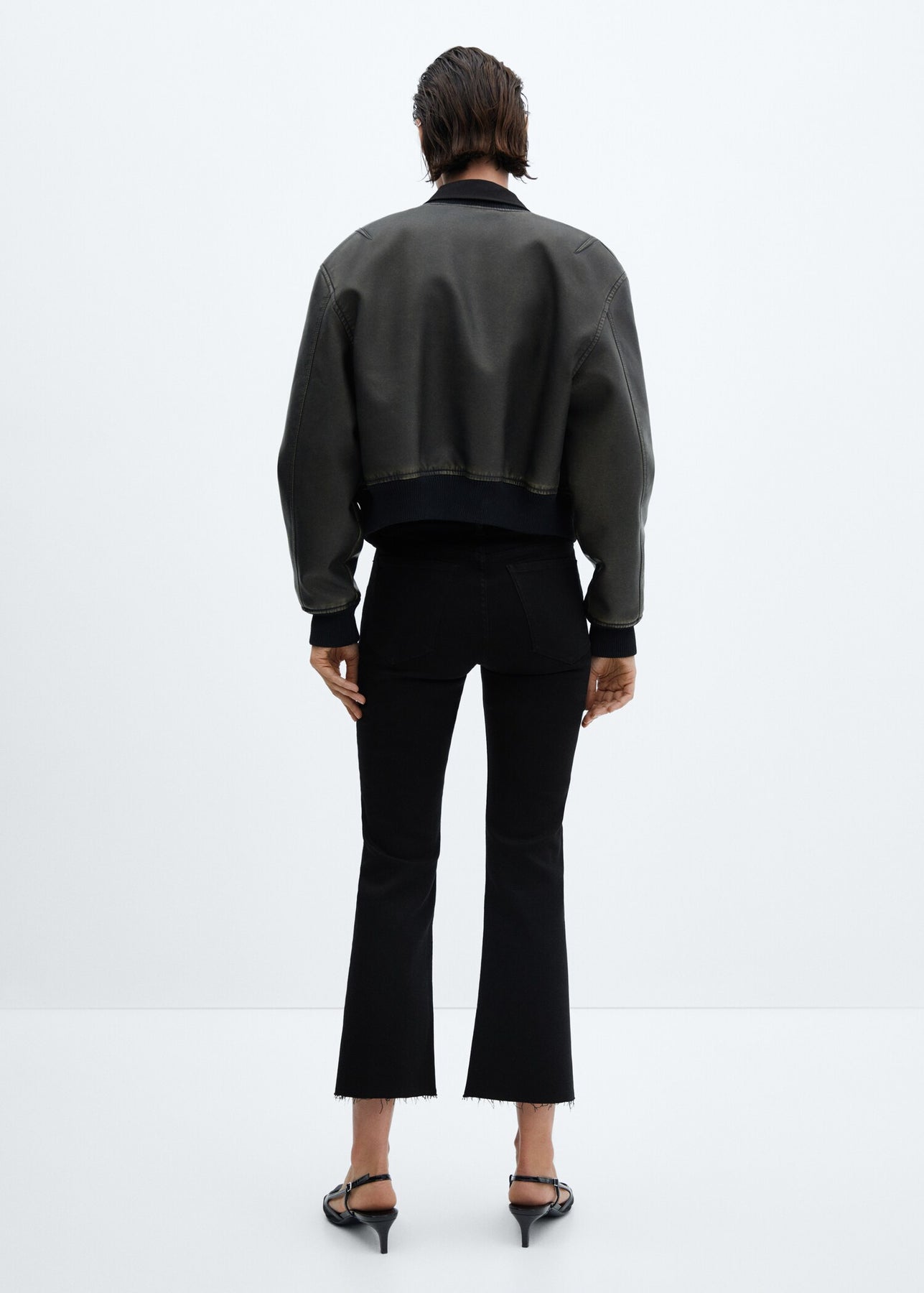 Tejido de algodón estilo tejano vaquero. Tejido mezcla de algodón reciclado. Tejido elástico. Diseño acampanado. Estilo flare. Diseño crop. Bajo deshilachado. Tiro alto. Trabillas. Cinco bolsillos. Cierre de cremallera y botón. Largo interior 68 cm.