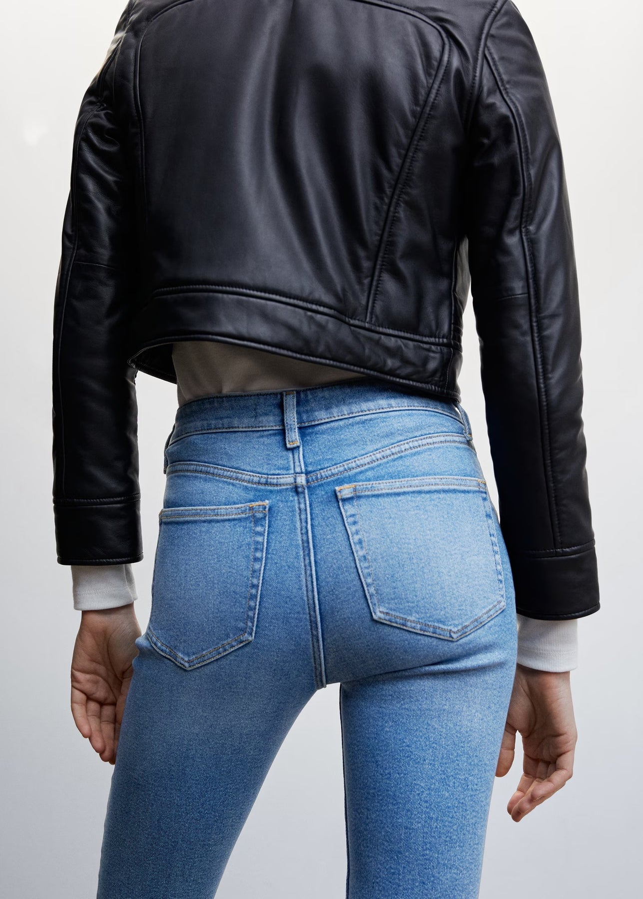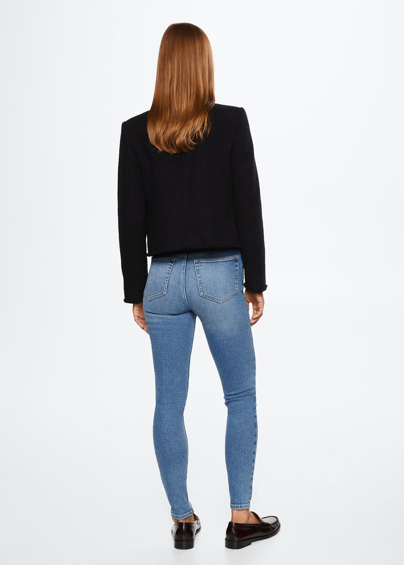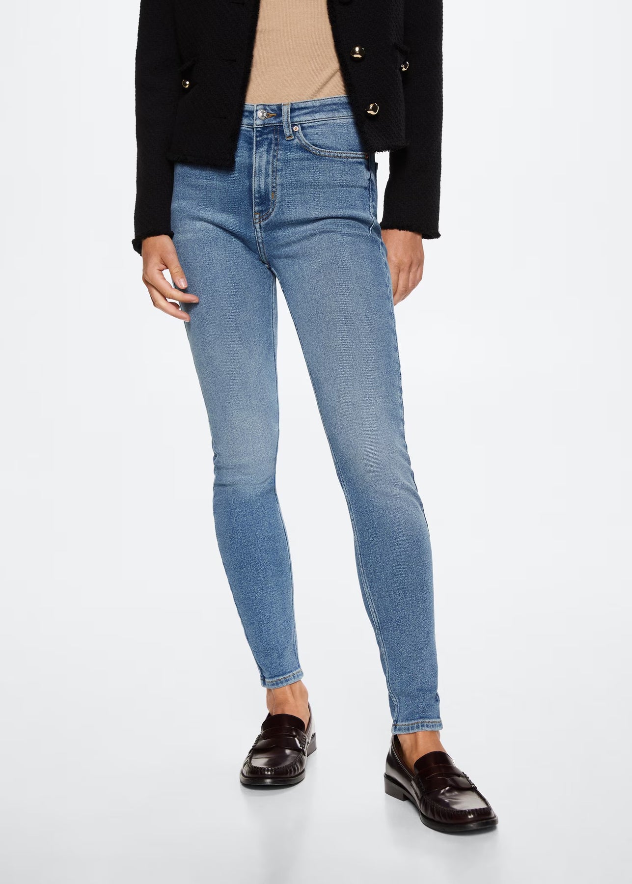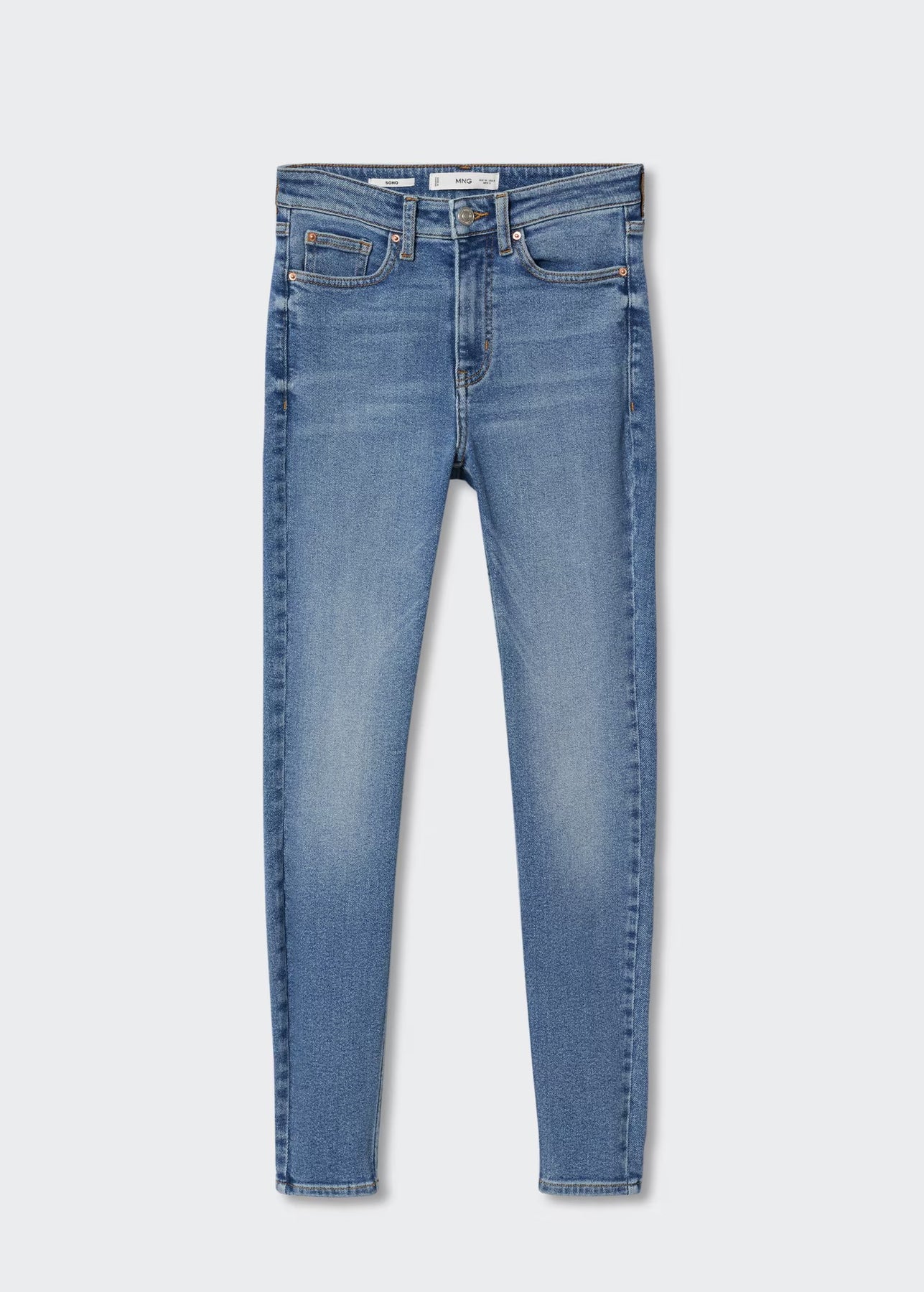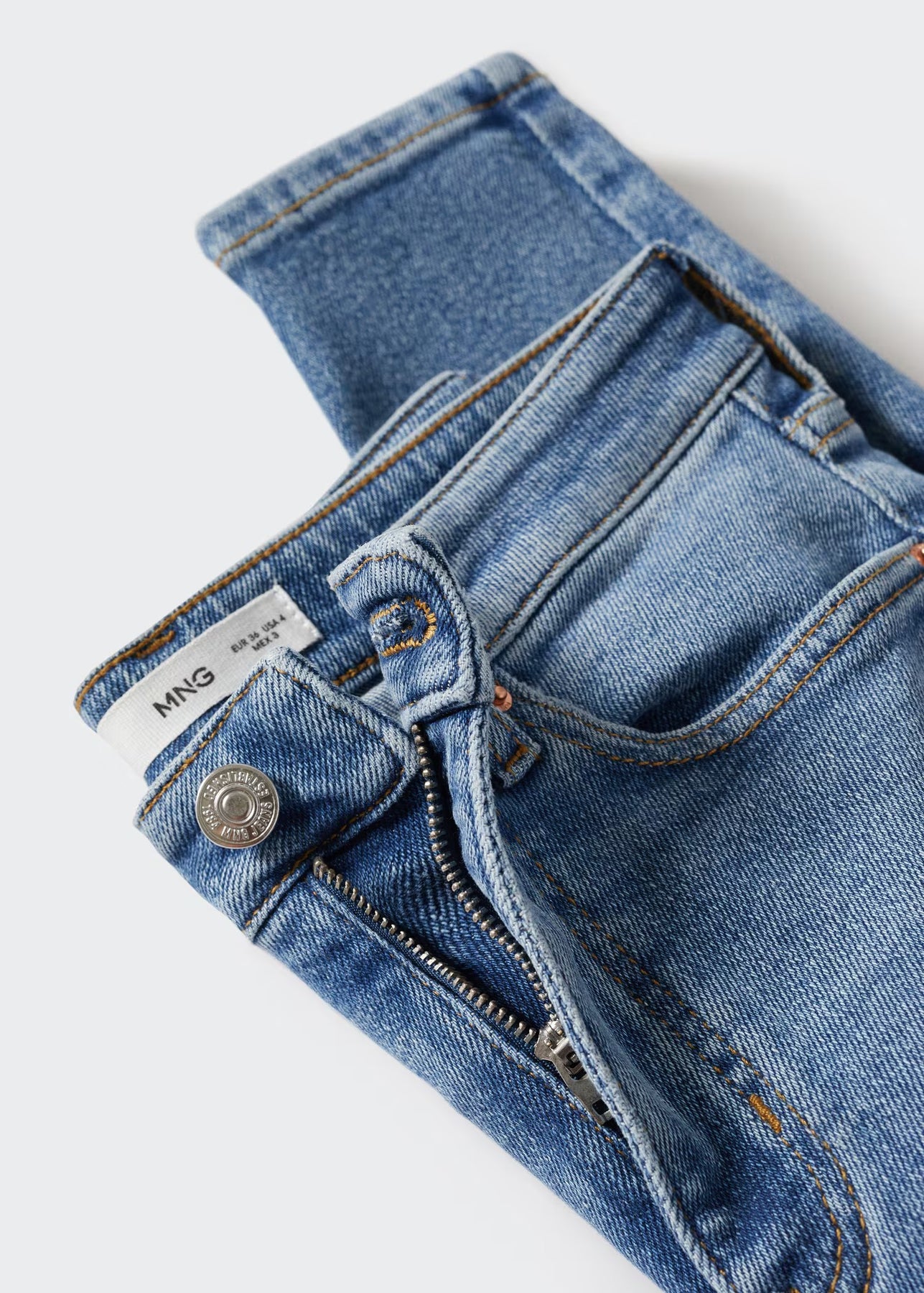 Tejido de algodón estilo tejano vaquero. Tejido elástico. Corte skinny. Tiro alto. Cinco bolsillos. Trabillas. Cierre de cremallera y botón.
