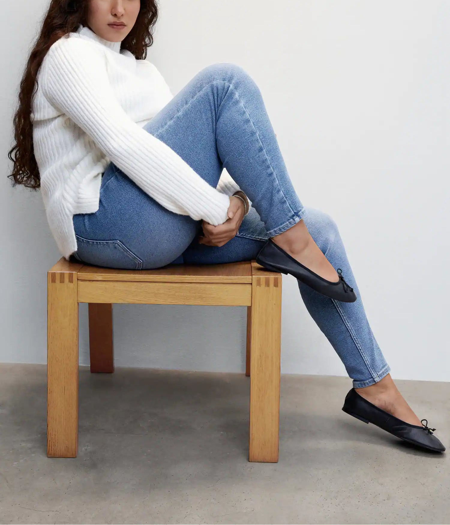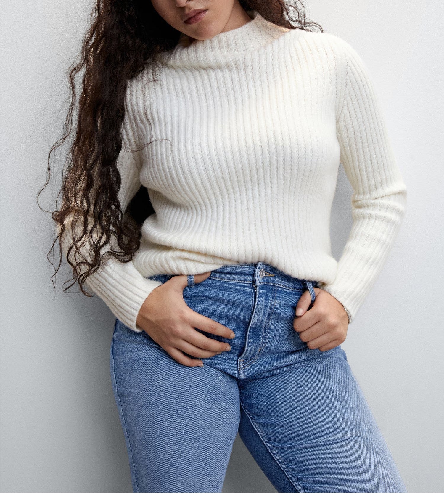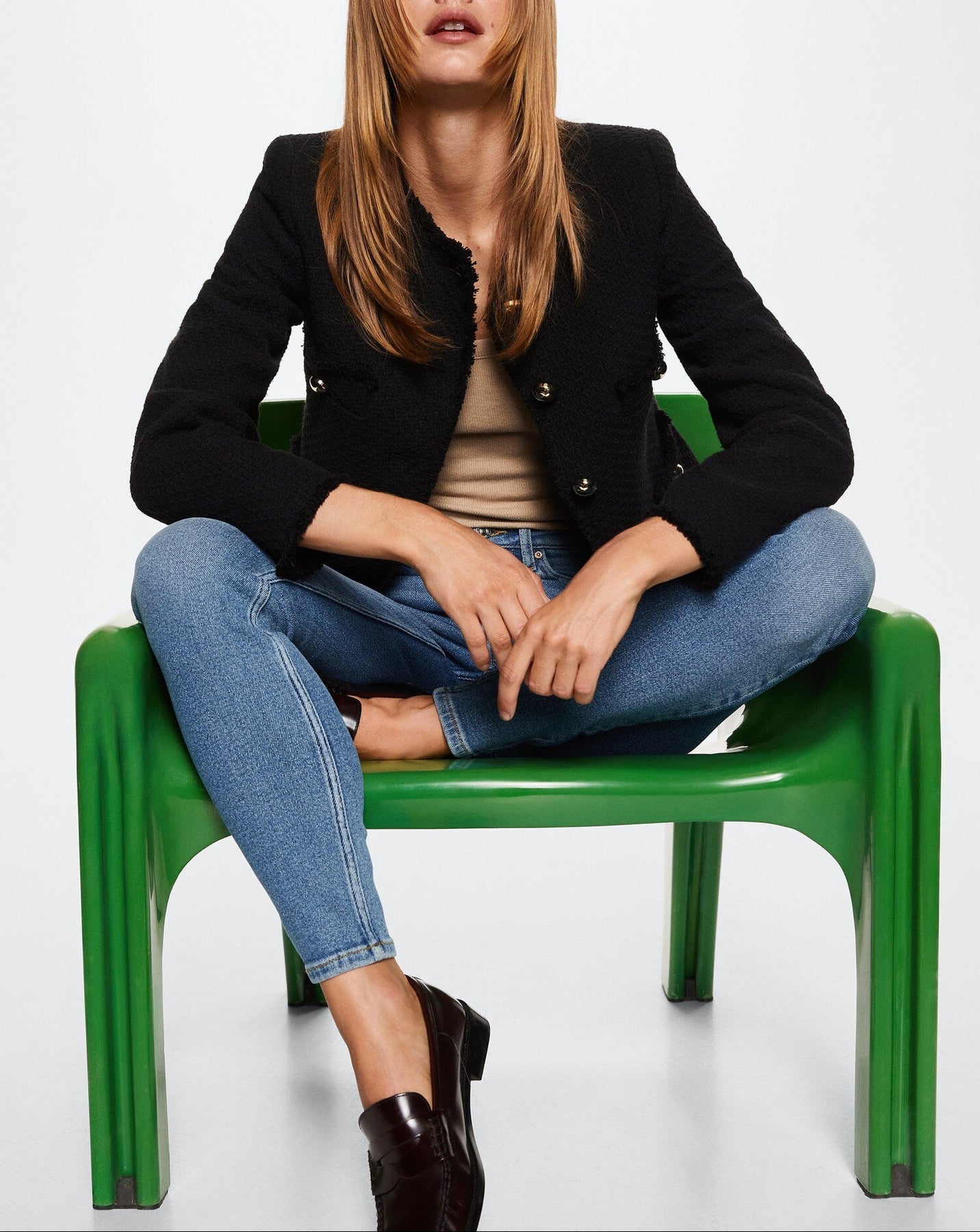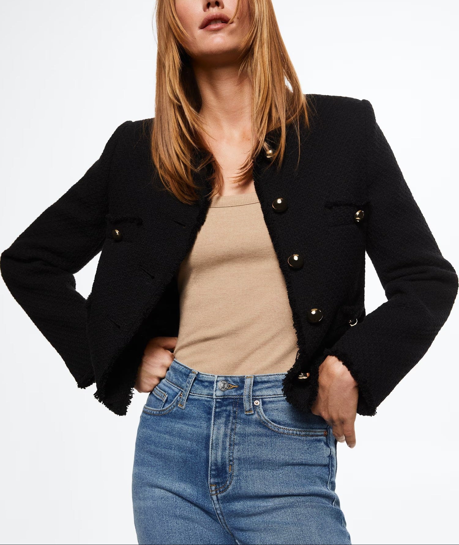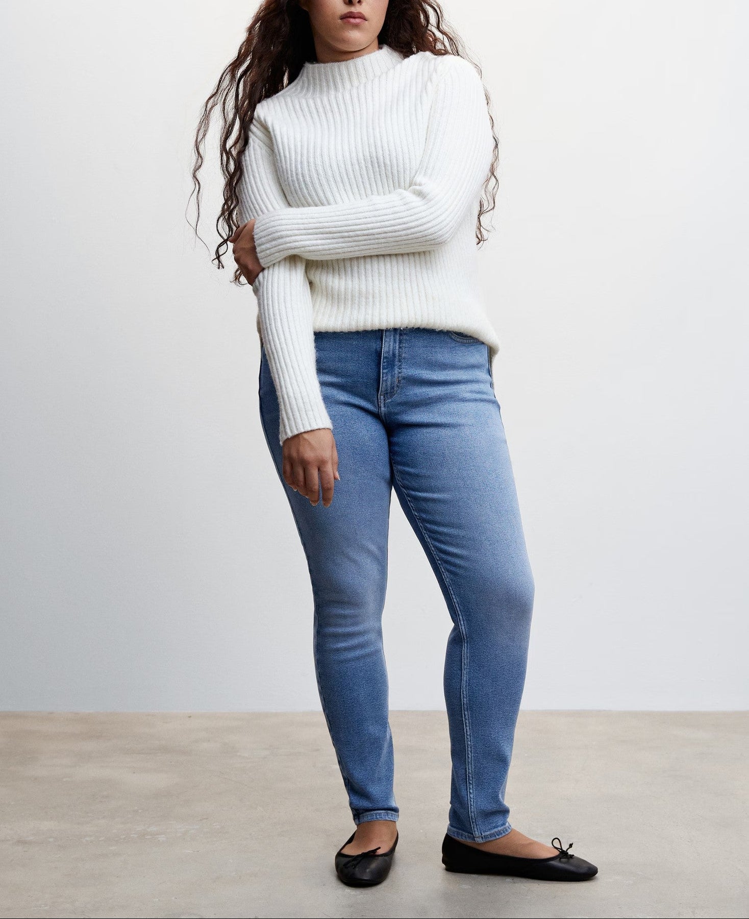 Tejido de algodón estilo tejano vaquero. Tejido elástico. Corte skinny. Tiro alto. Cinco bolsillos. Trabillas. Cierre de cremallera y botón.