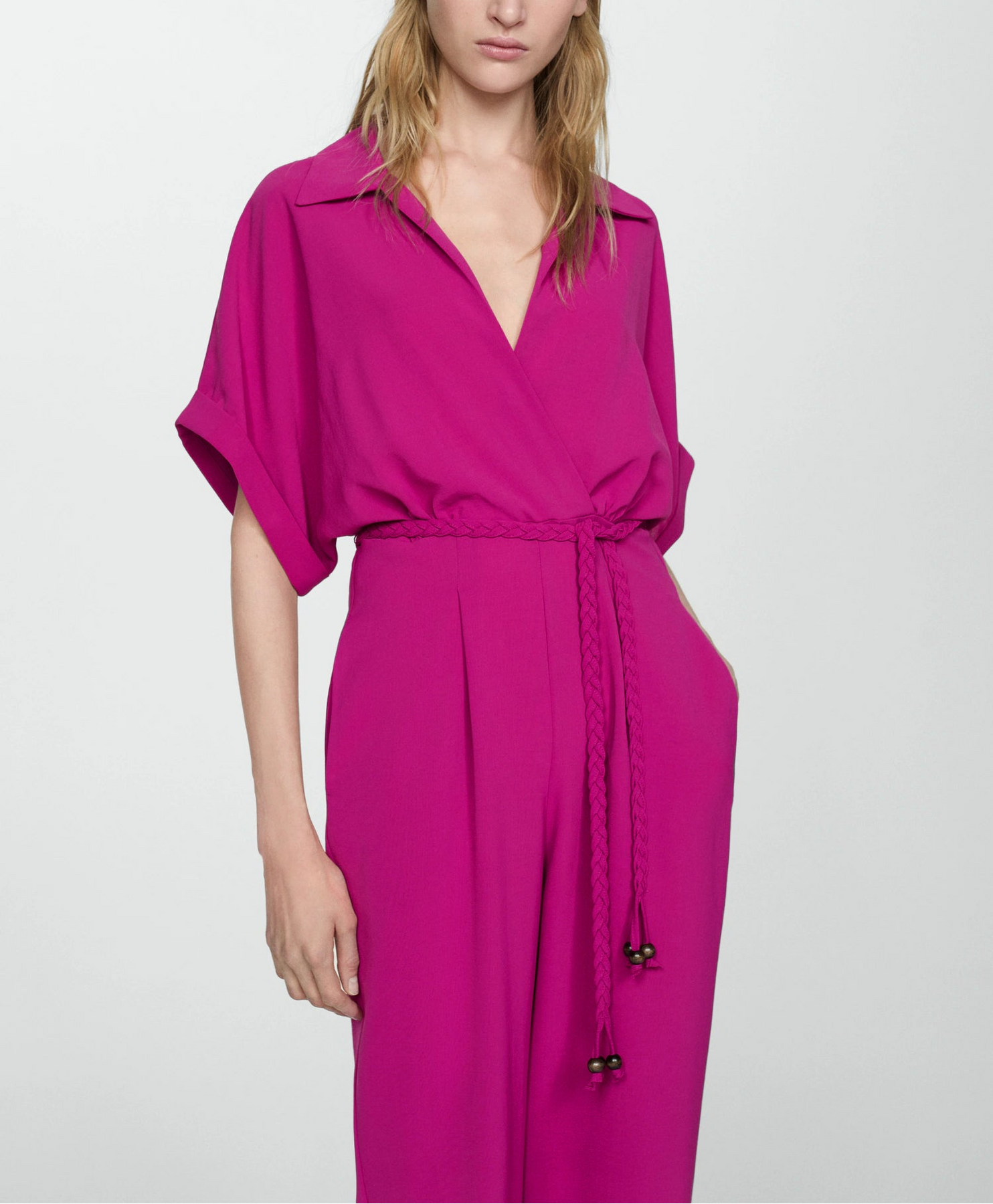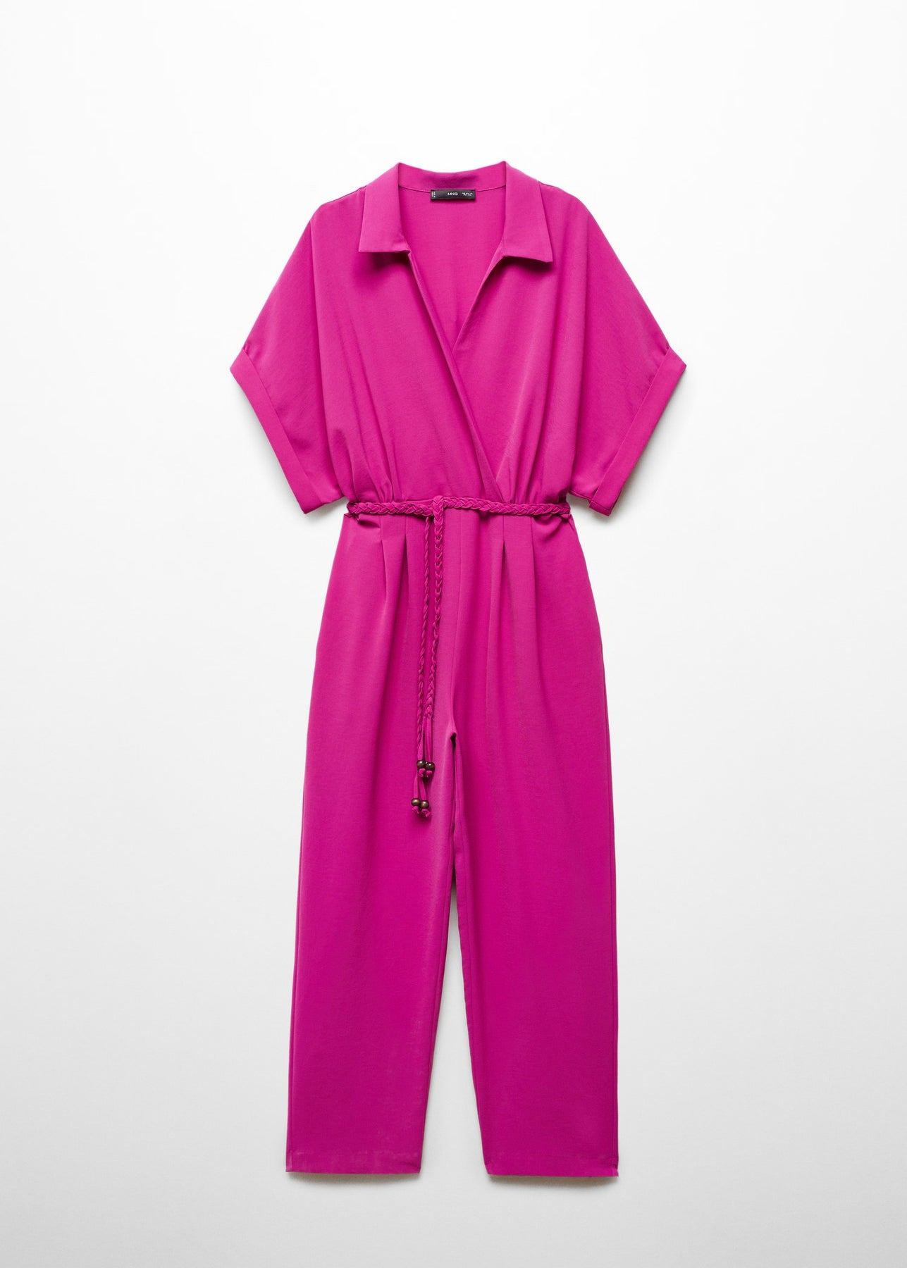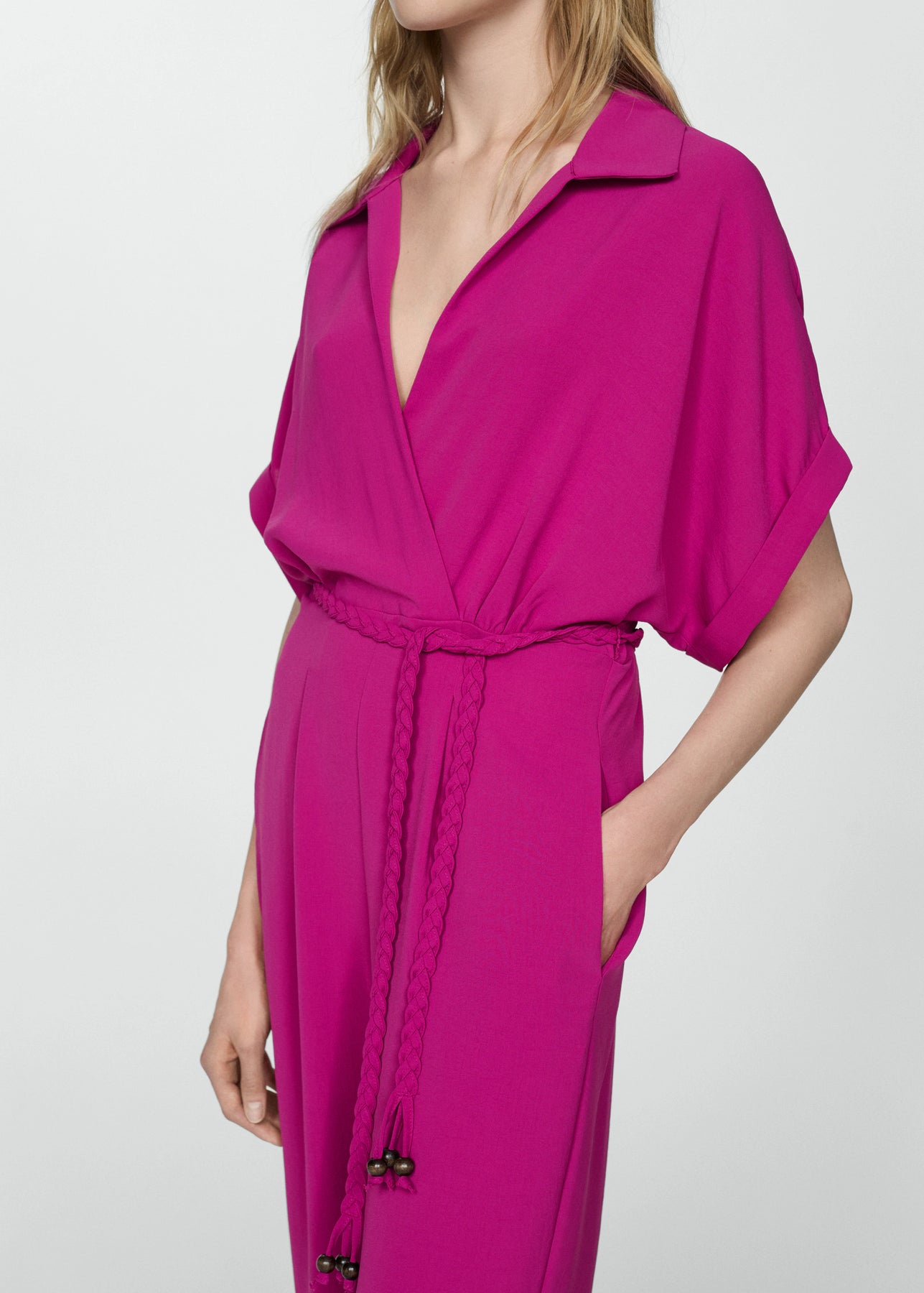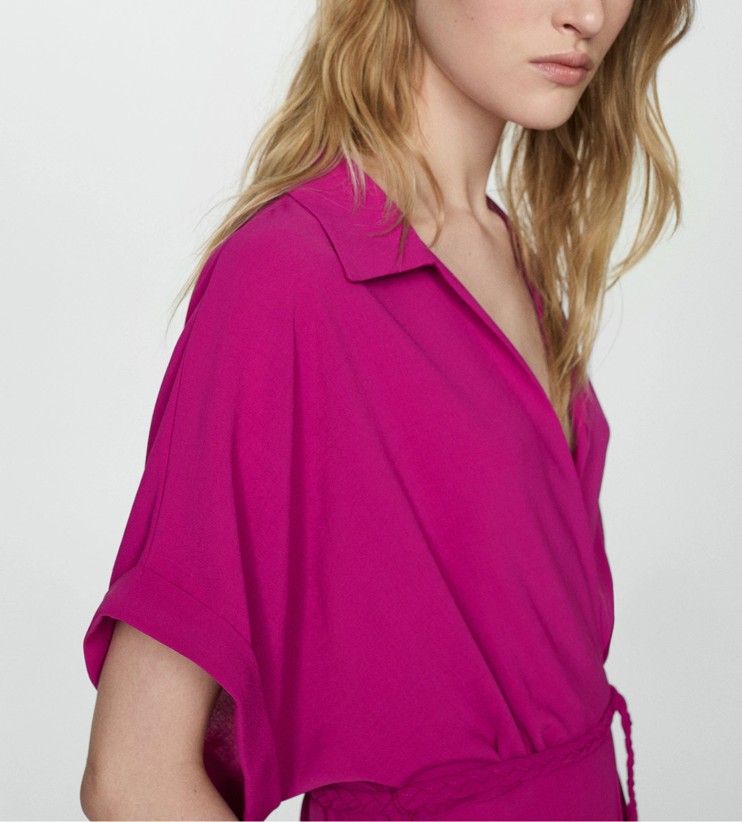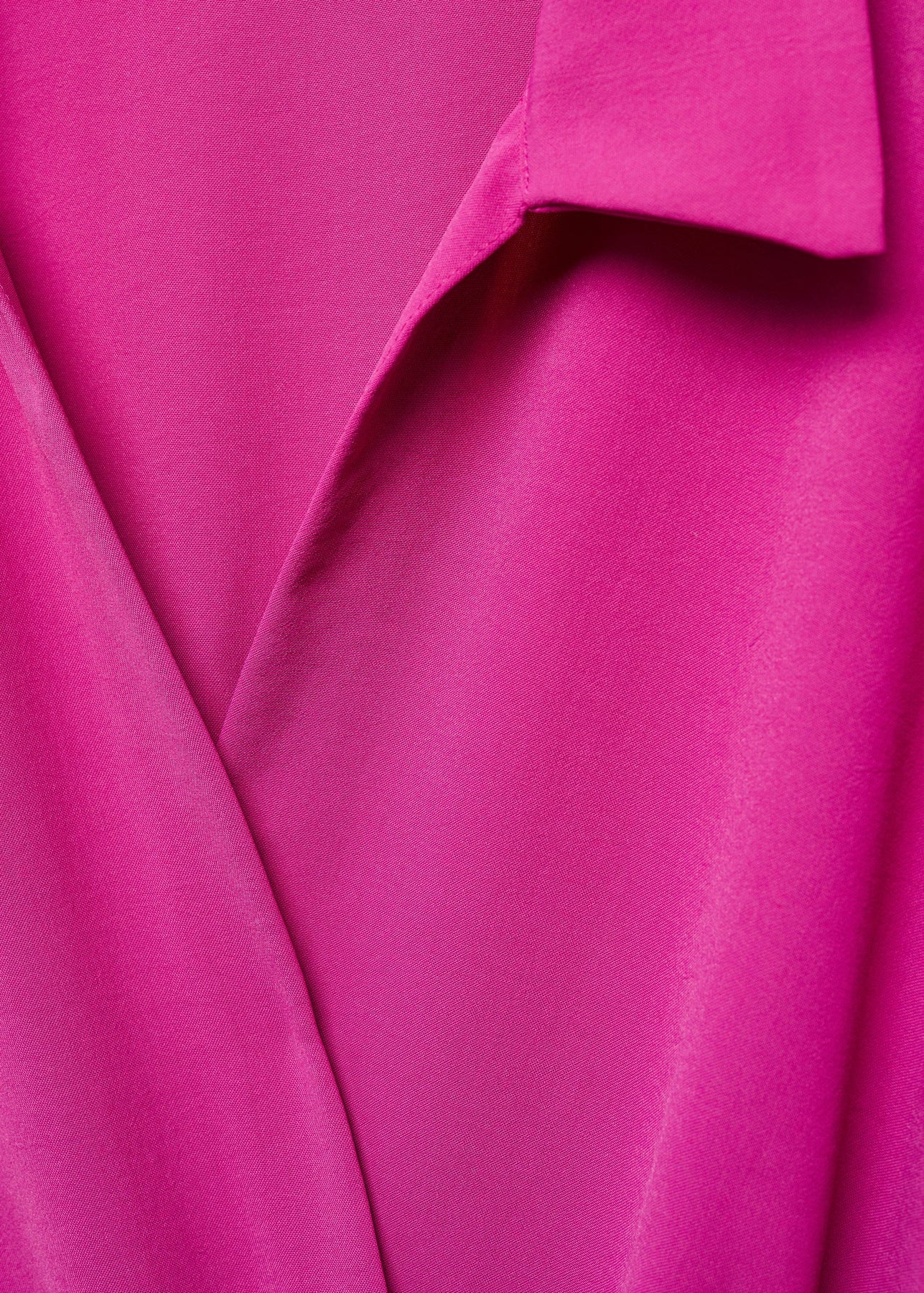 Tejido fluido. Diseño recto. Diseño largo. Cuello camisero. Escote de pico cruzado. Manga corta. Cierre de lazo ajustable. Detalle de abalorios.