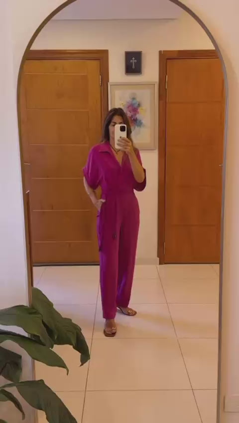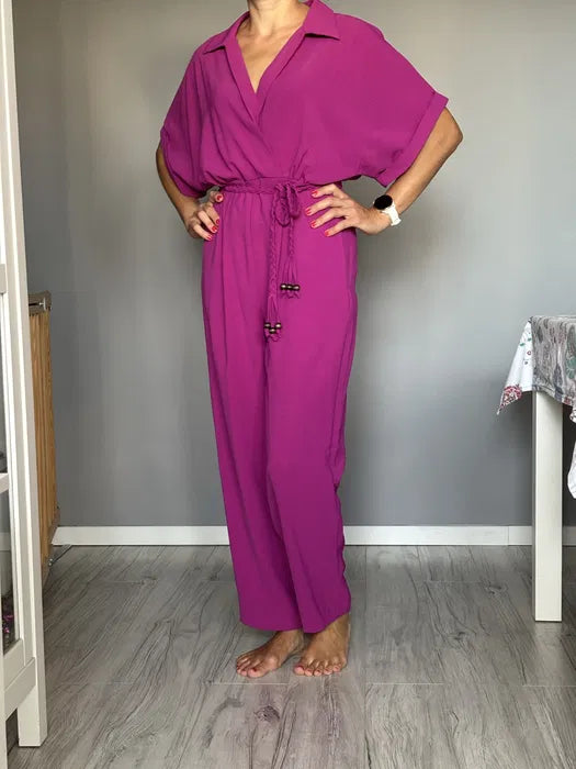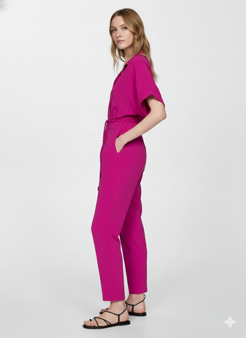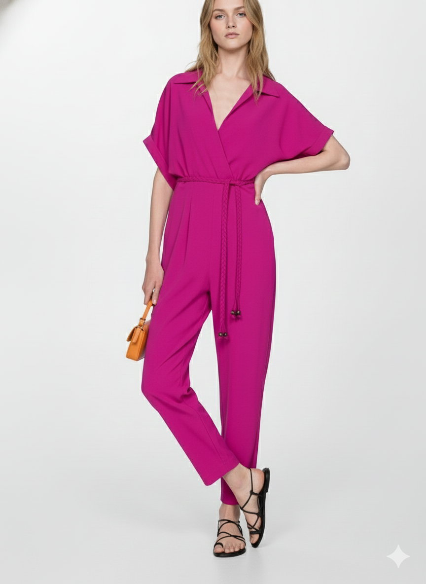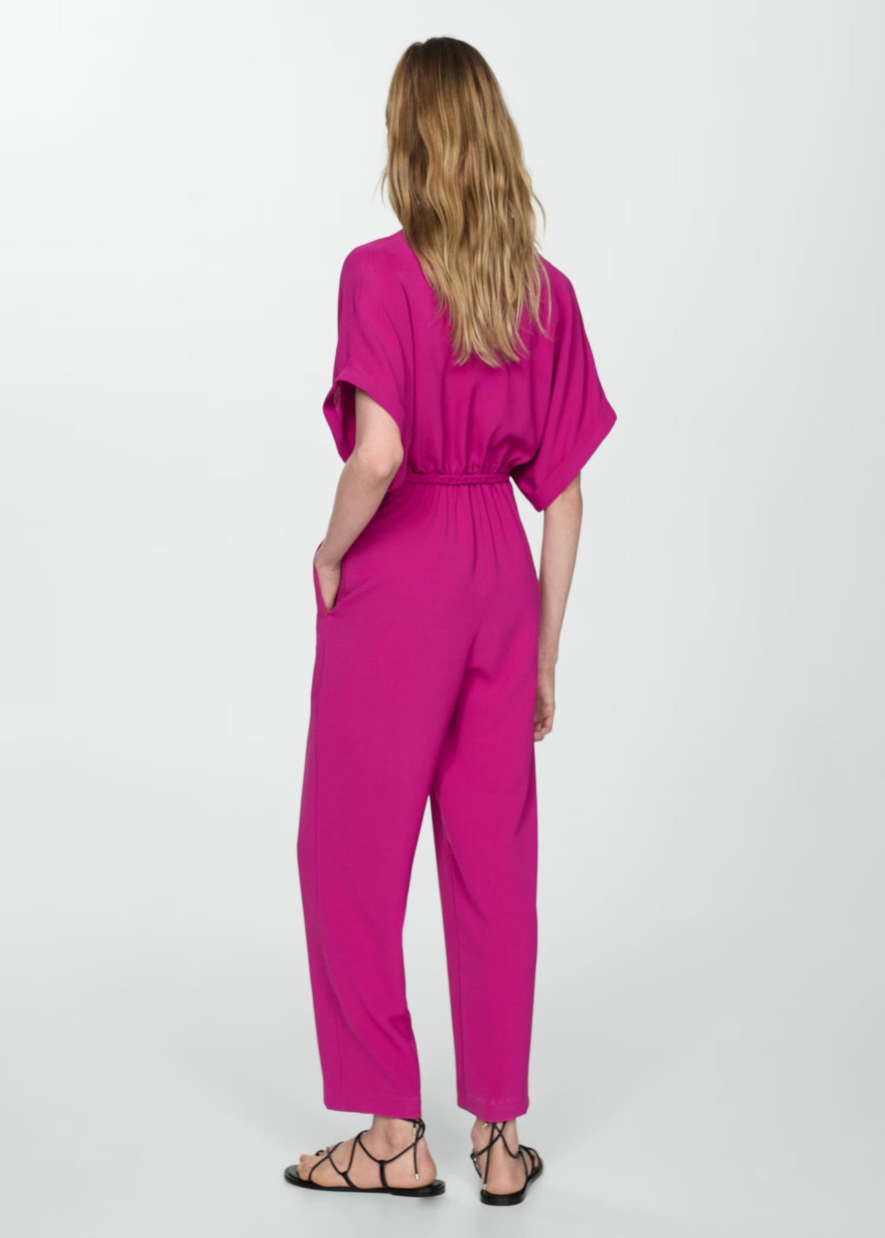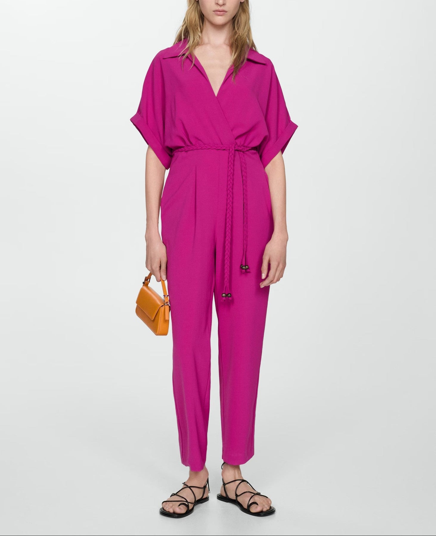 Tejido fluido. Diseño recto. Diseño largo. Cuello camisero. Escote de pico cruzado. Manga corta. Cierre de lazo ajustable. Detalle de abalorios.