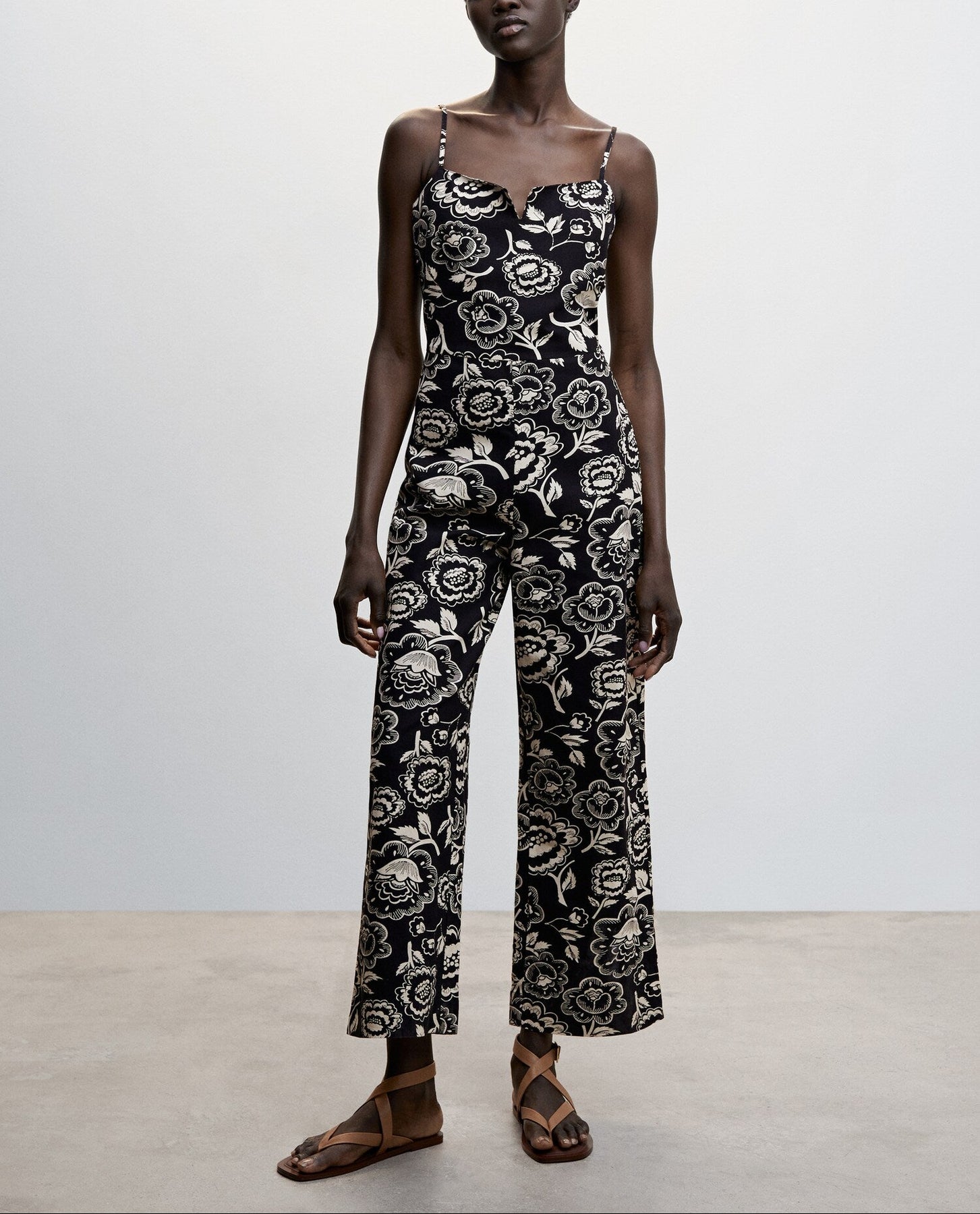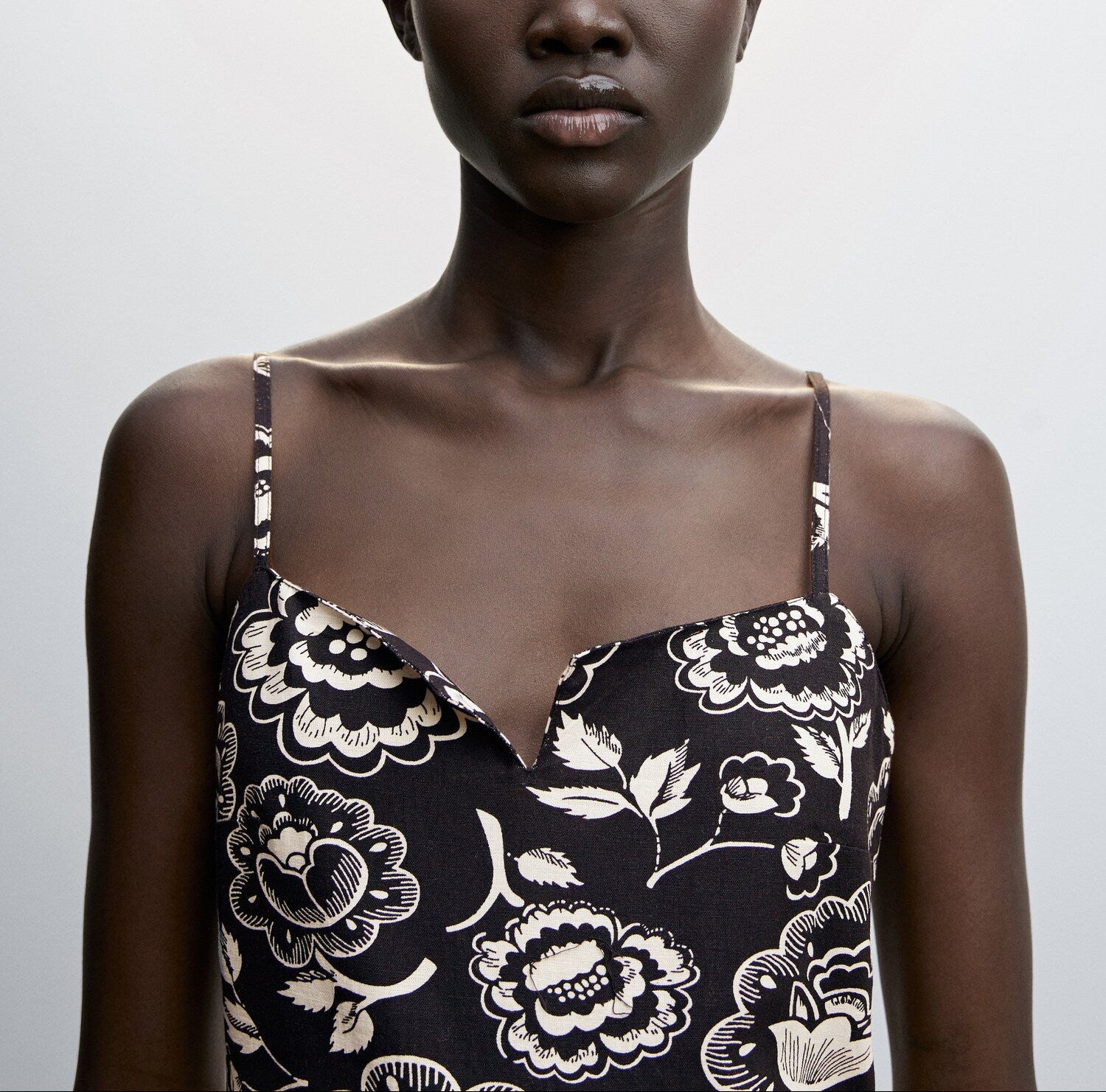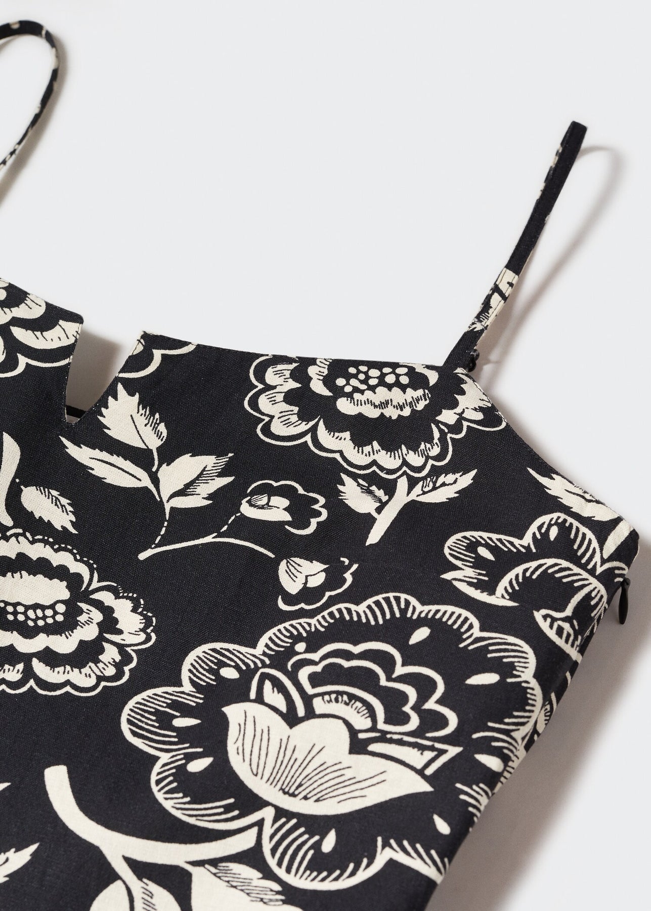Tejido mezcla de algodón. Tejido fluido. Estampado floral. Diseño largo. Diseño recto. Cuello escotado. Tirantes finos ajustables. Cierre cremallera invisible en el lateral.