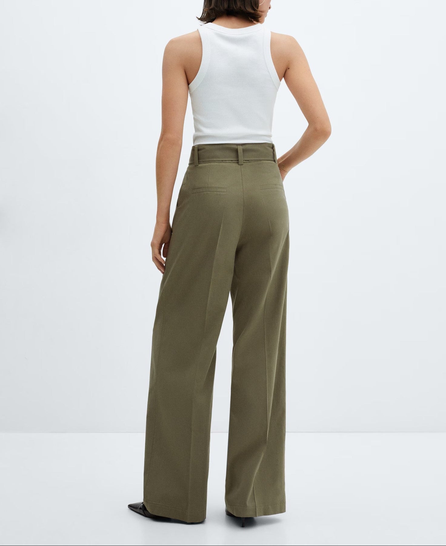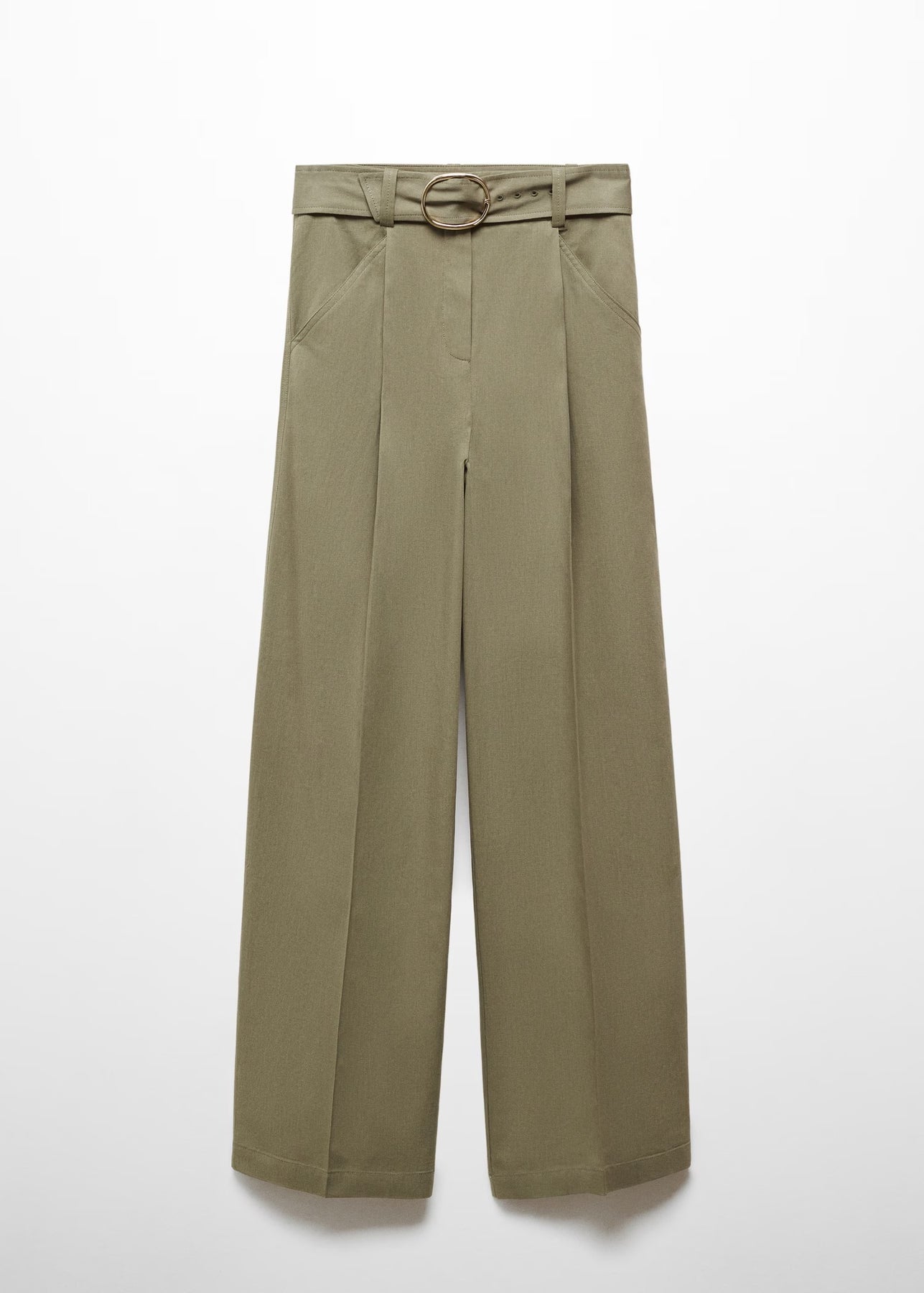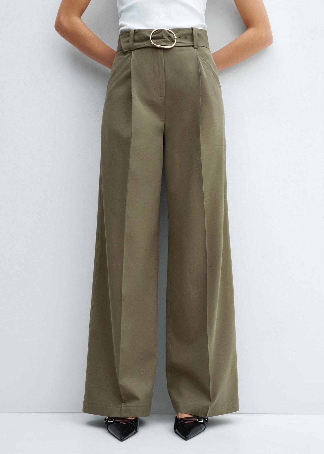 Tejido mezcla algodón y lyocell. Tejido fluido. Tiro medio. Diseño recto. Diseño wideleg. Diseño largo. Dos bolsillos laterales. Dos bolsillos de ribete en la parte posterior. Trabillas. Cierre oculto de botón, gancho y cremallera. Detalle de pinzas. Cinturón desmontable.