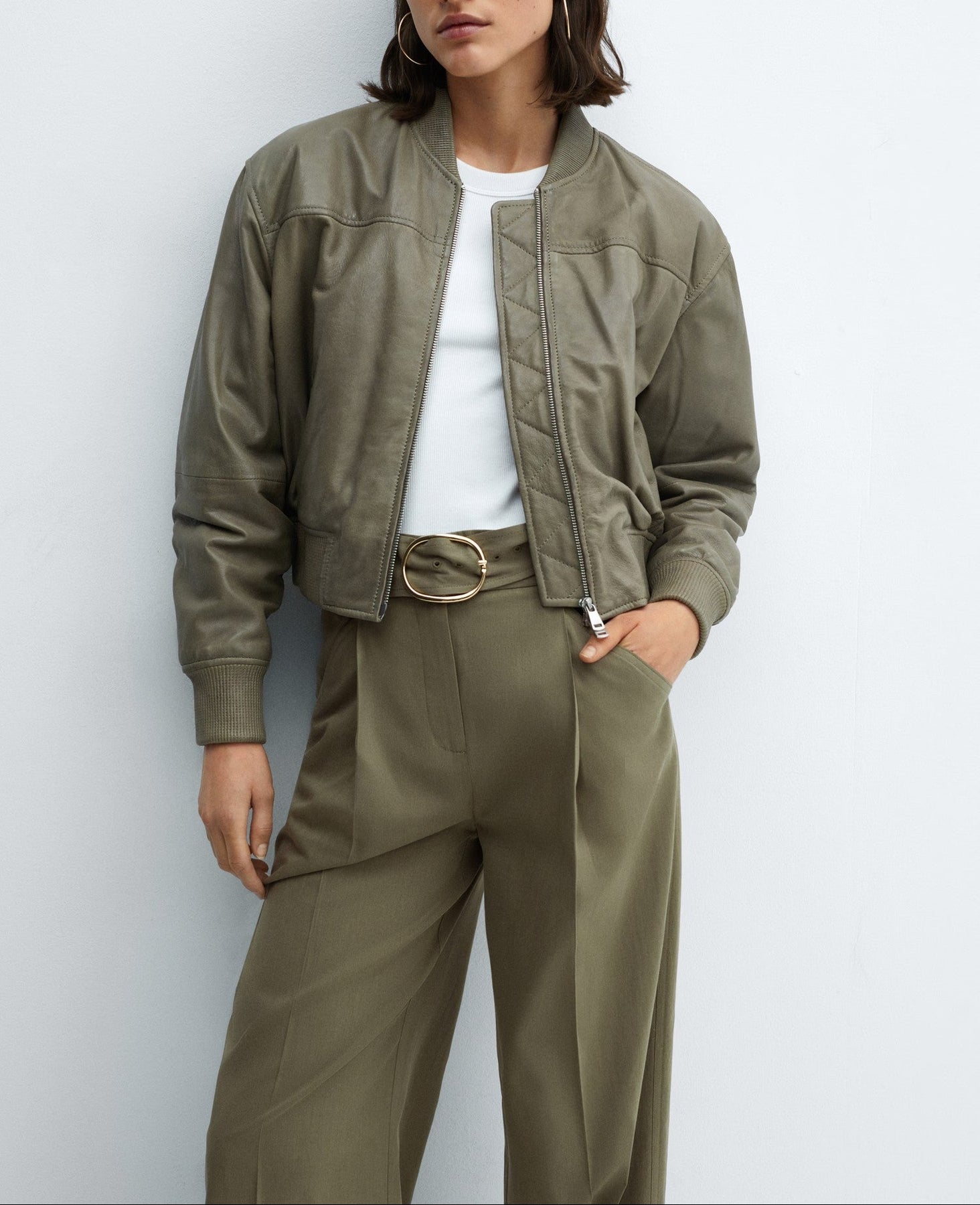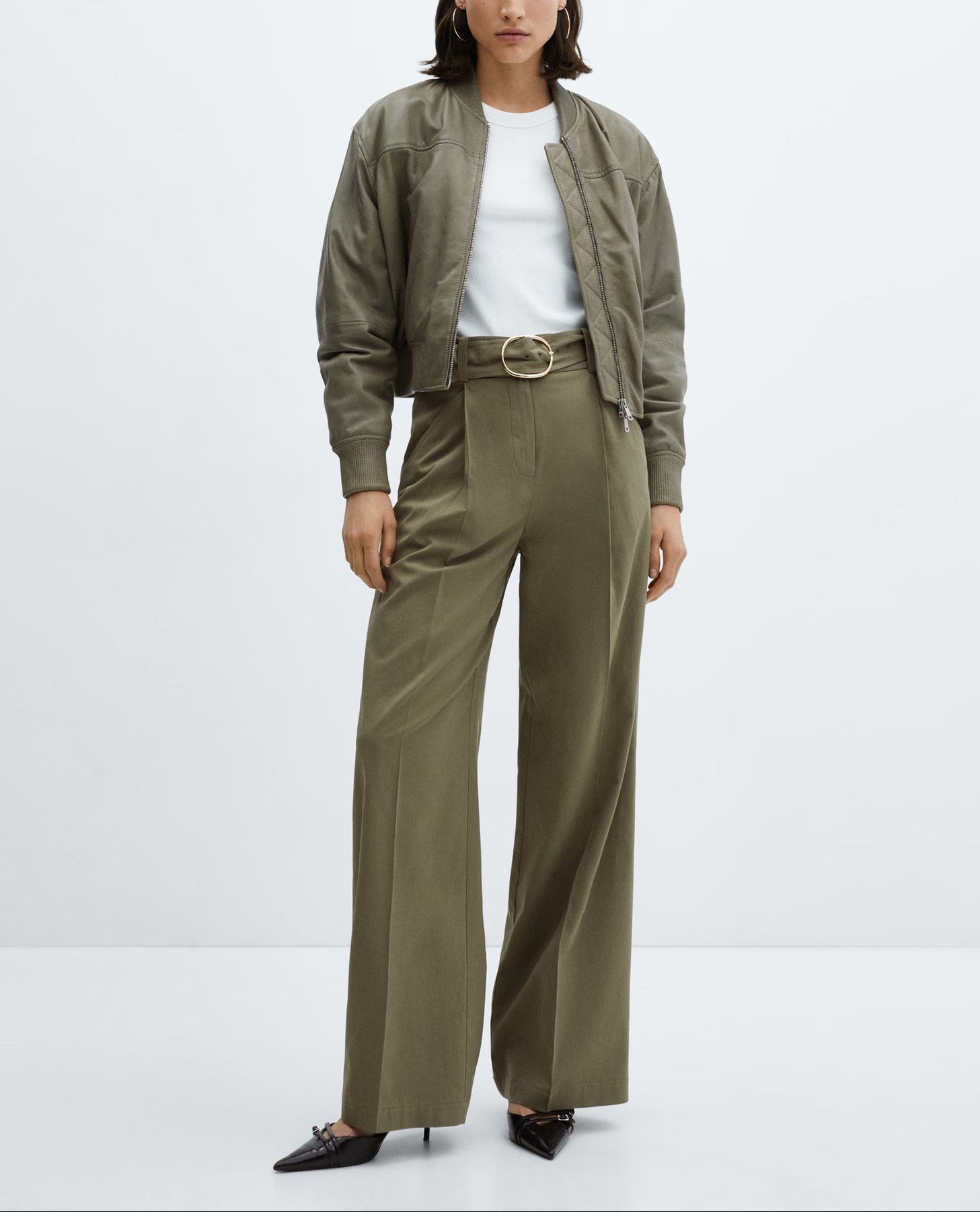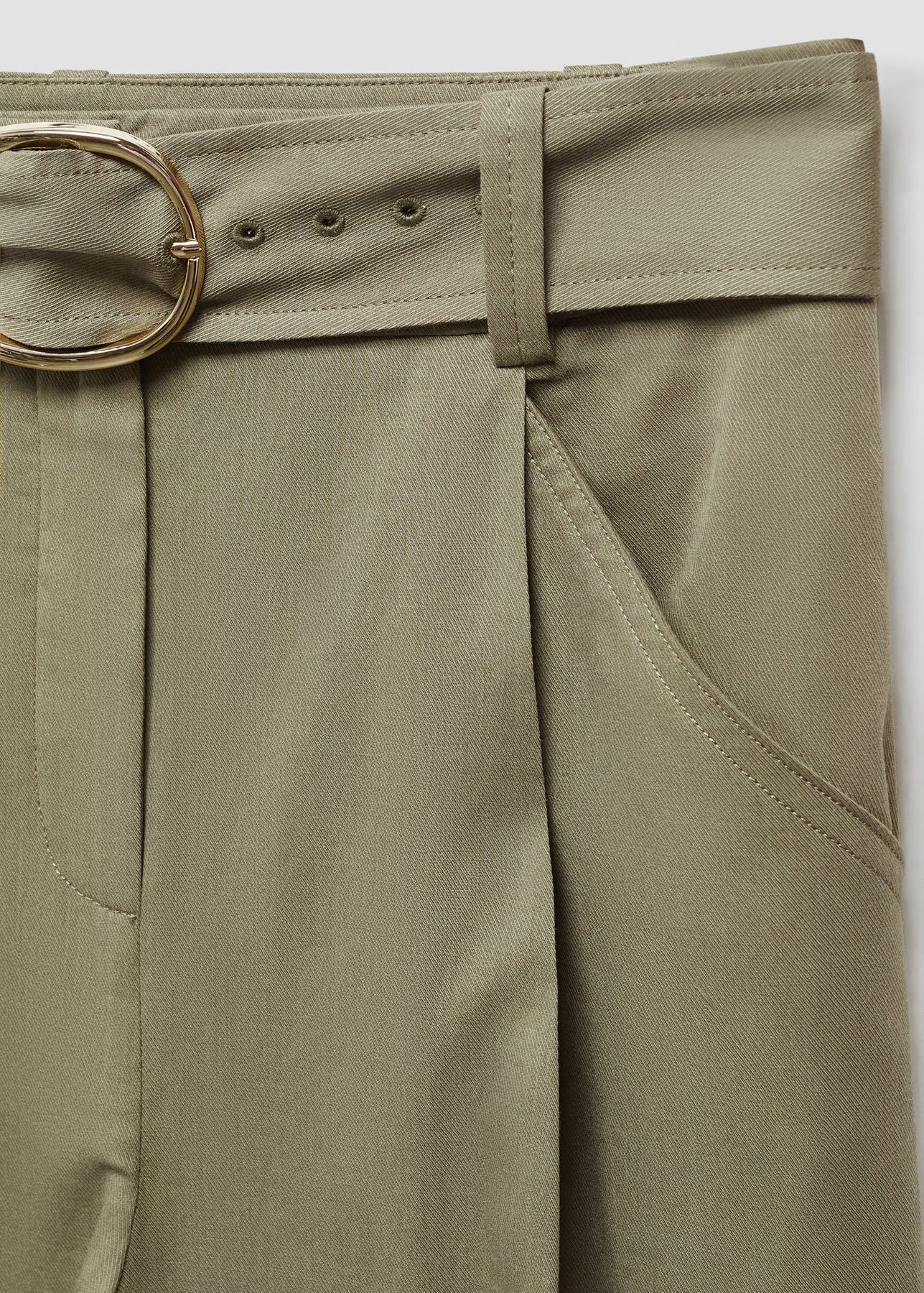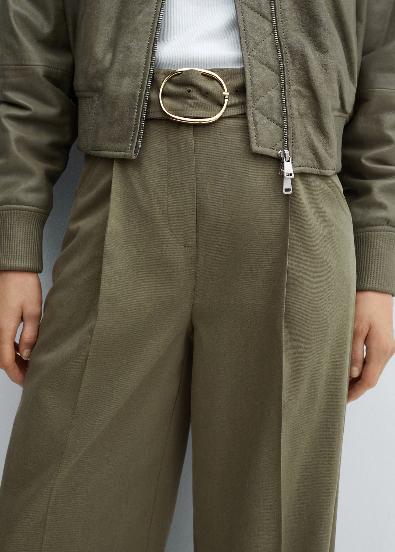 Tejido mezcla algodón y lyocell. Tejido fluido. Tiro medio. Diseño recto. Diseño wideleg. Diseño largo. Dos bolsillos laterales. Dos bolsillos de ribete en la parte posterior. Trabillas. Cierre oculto de botón, gancho y cremallera. Detalle de pinzas. Cinturón desmontable.