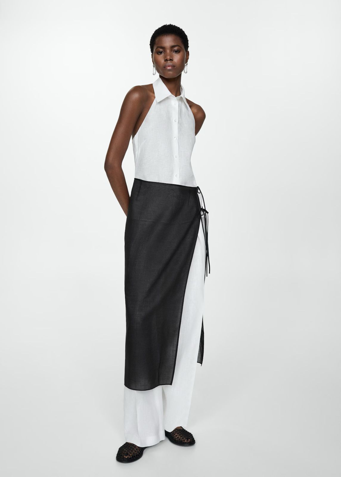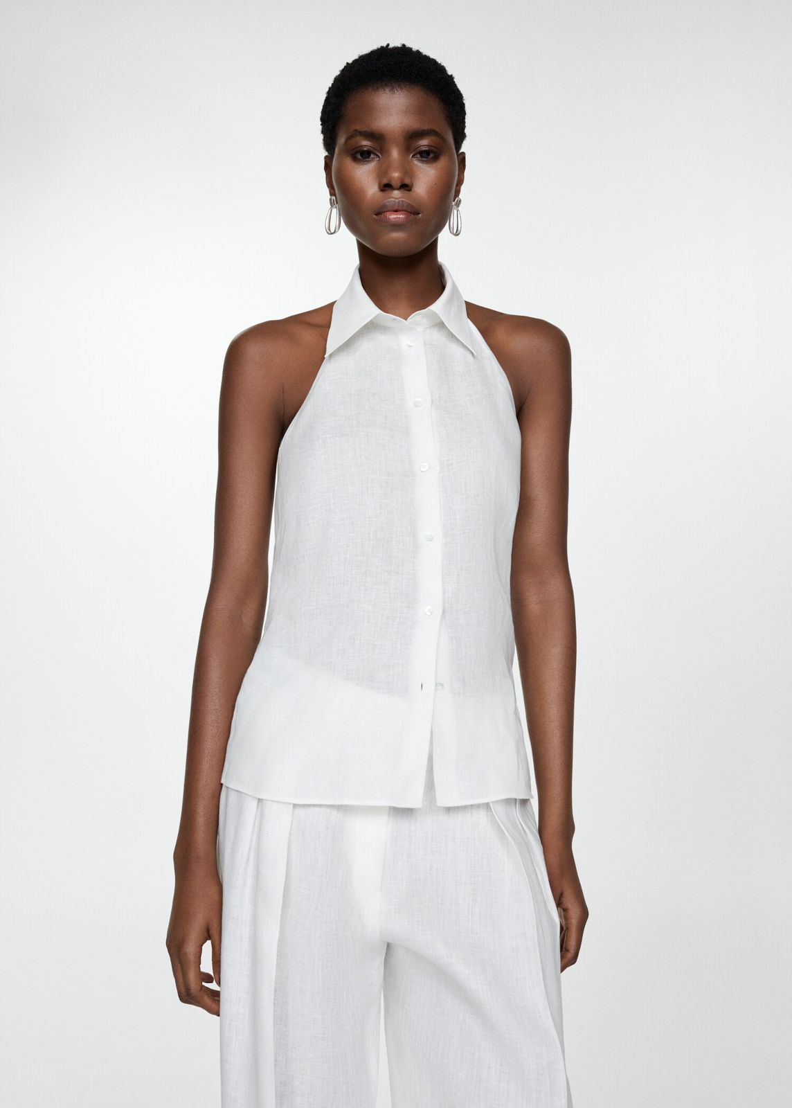 Tejido 100% lino. Diseño recto. Cuello halter. Cuello camisero. Espalda abierta. Sin mangas. Colección Selection. Cierre delantero con botones.