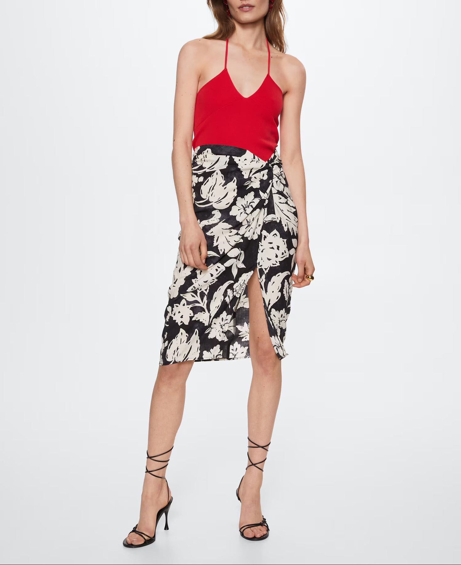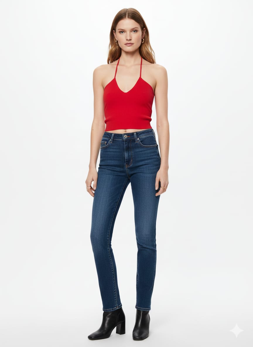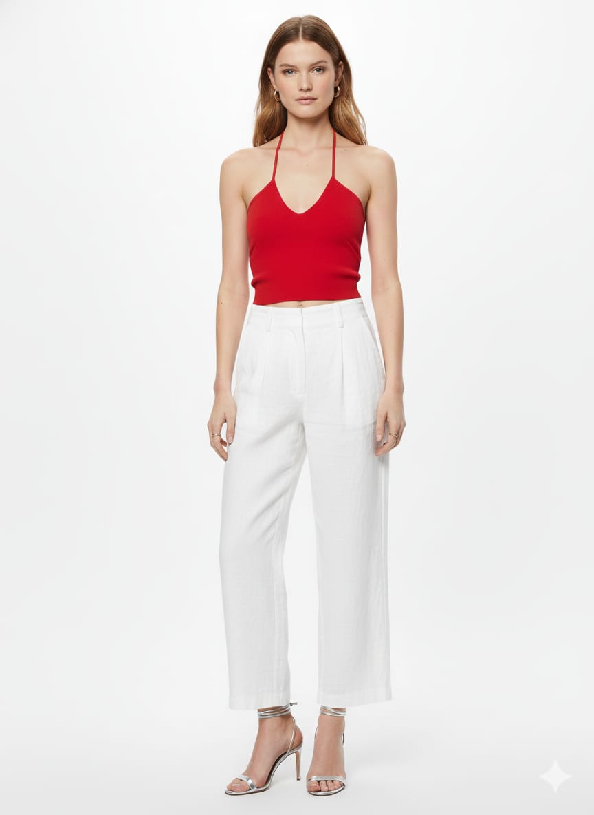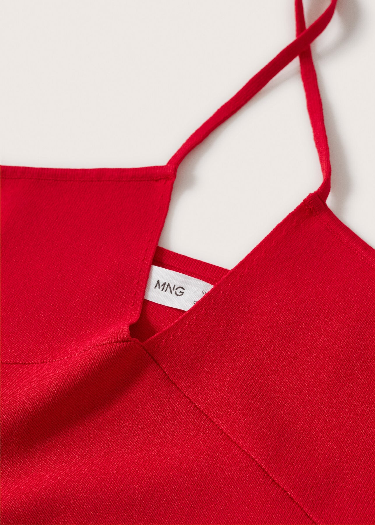 Tejido de punto fino. Diseño entallado. Diseño crop. Cuello pico. Tirantes finos. Espalda abierta. Cierre de lazo en el cuello.