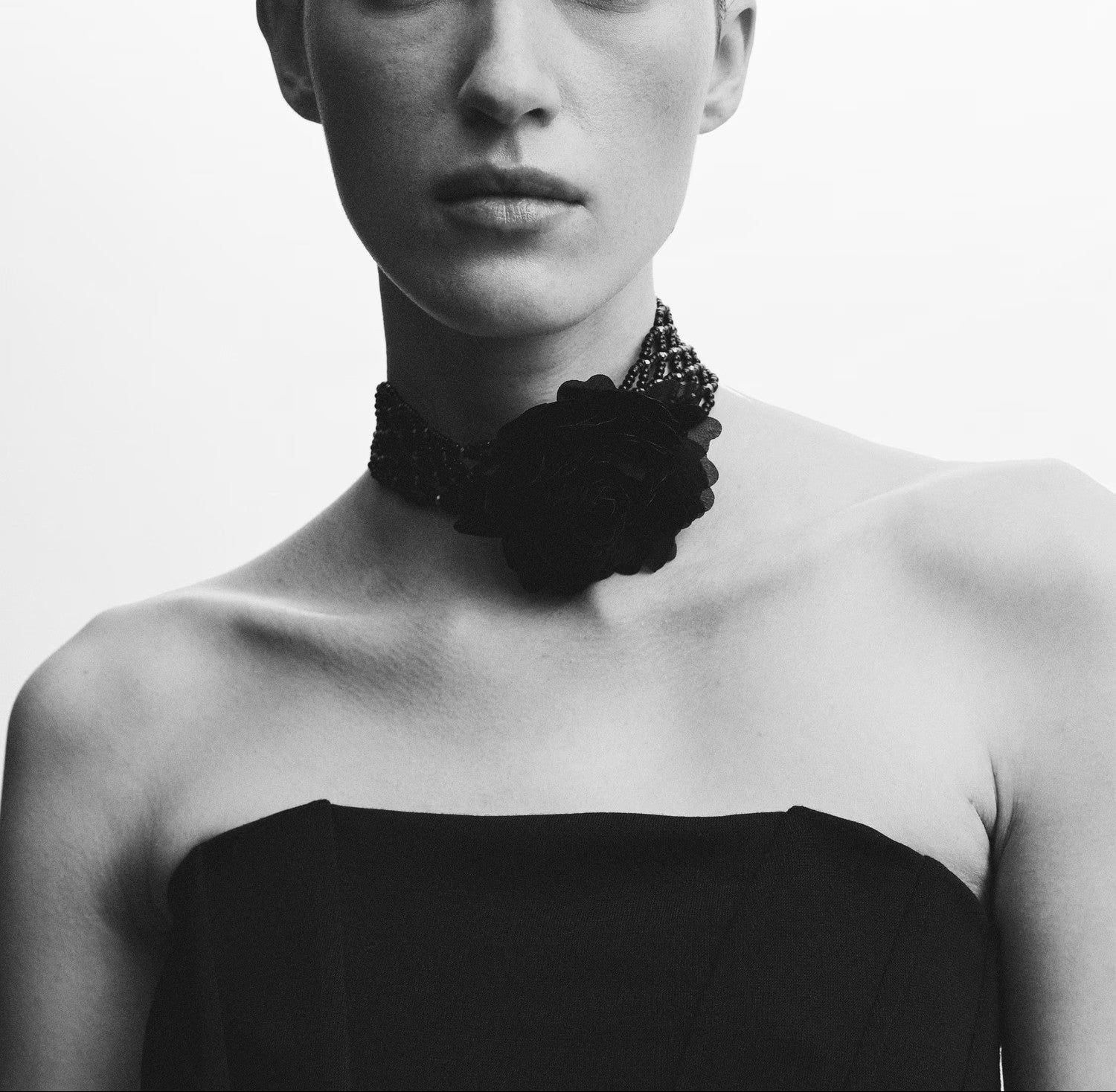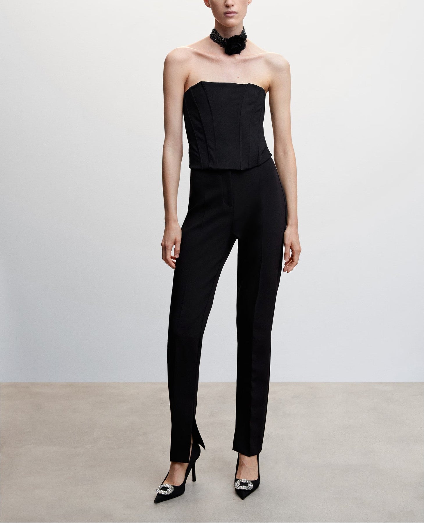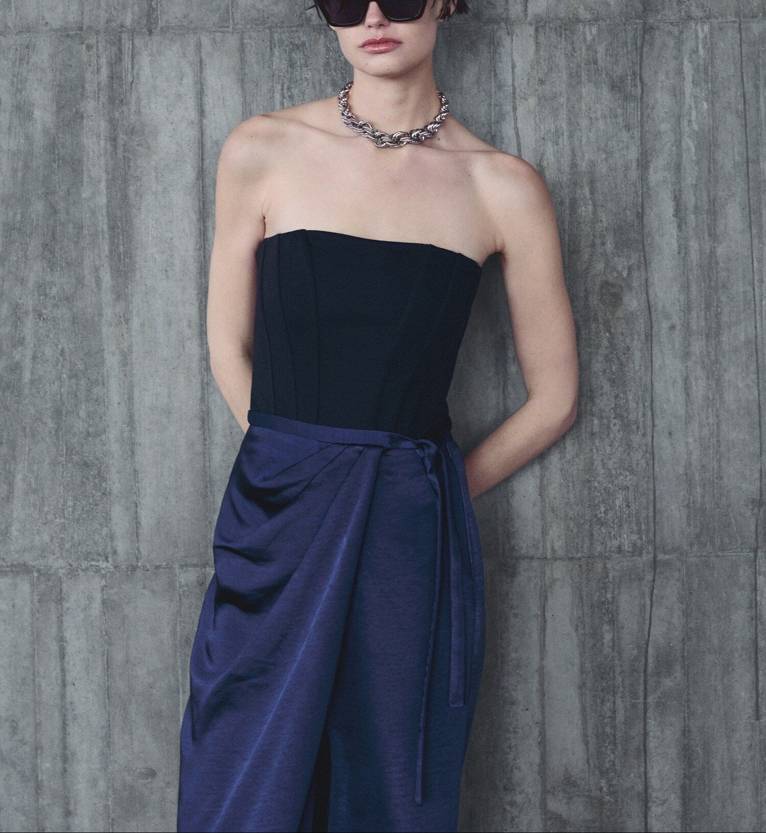Tejido de punto fino. Tejido elástico. Diseño corto. Estilo corsetero. Palabra de honor. Colección fiesta y ceremonia. Festival Season.