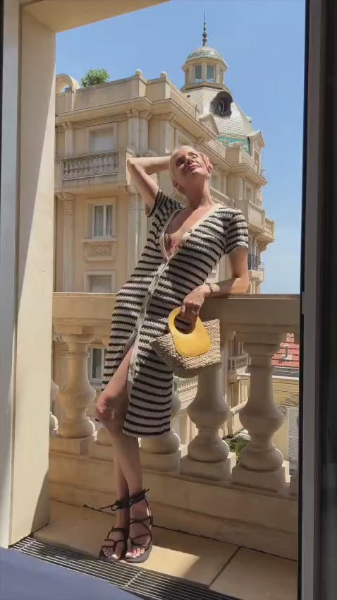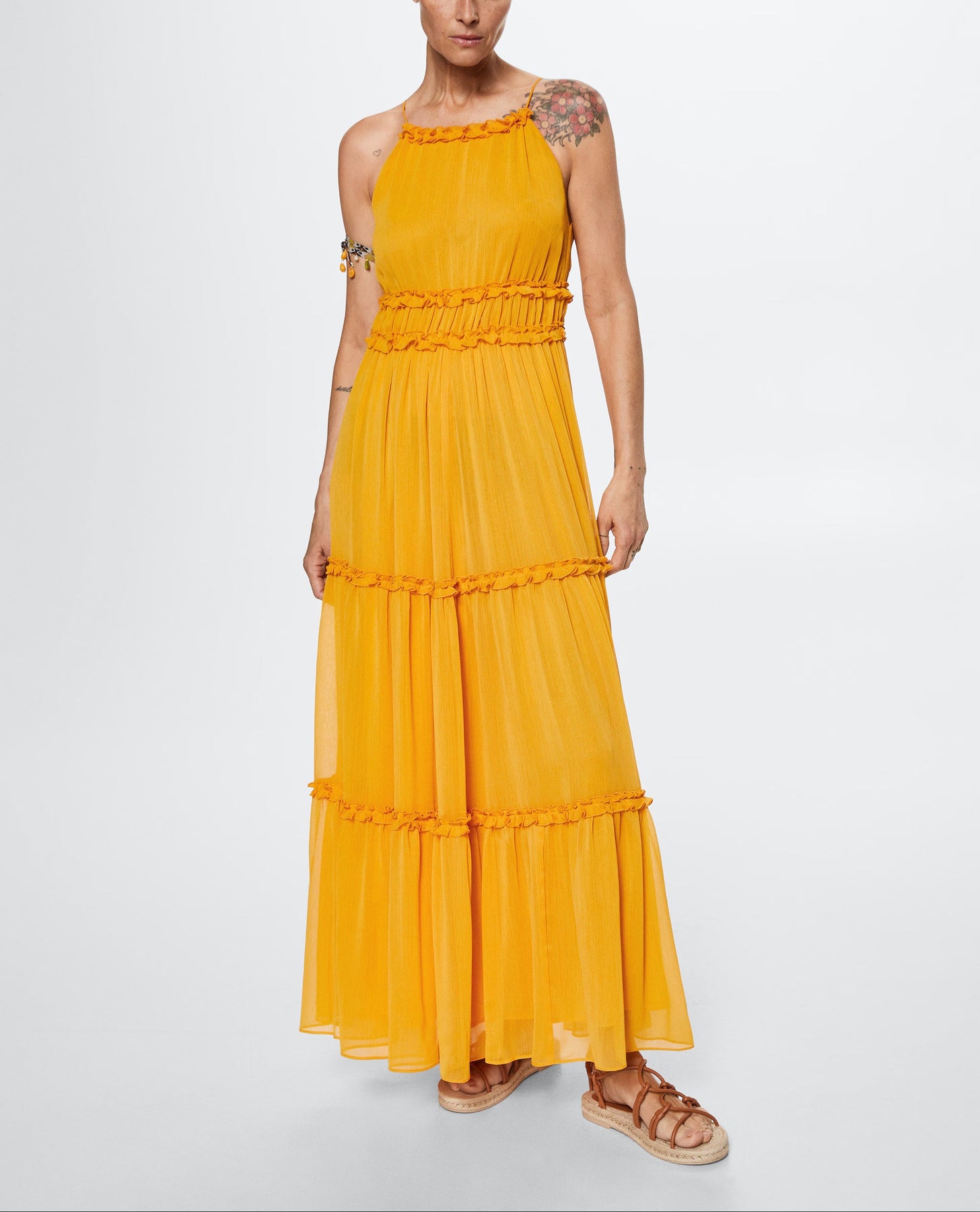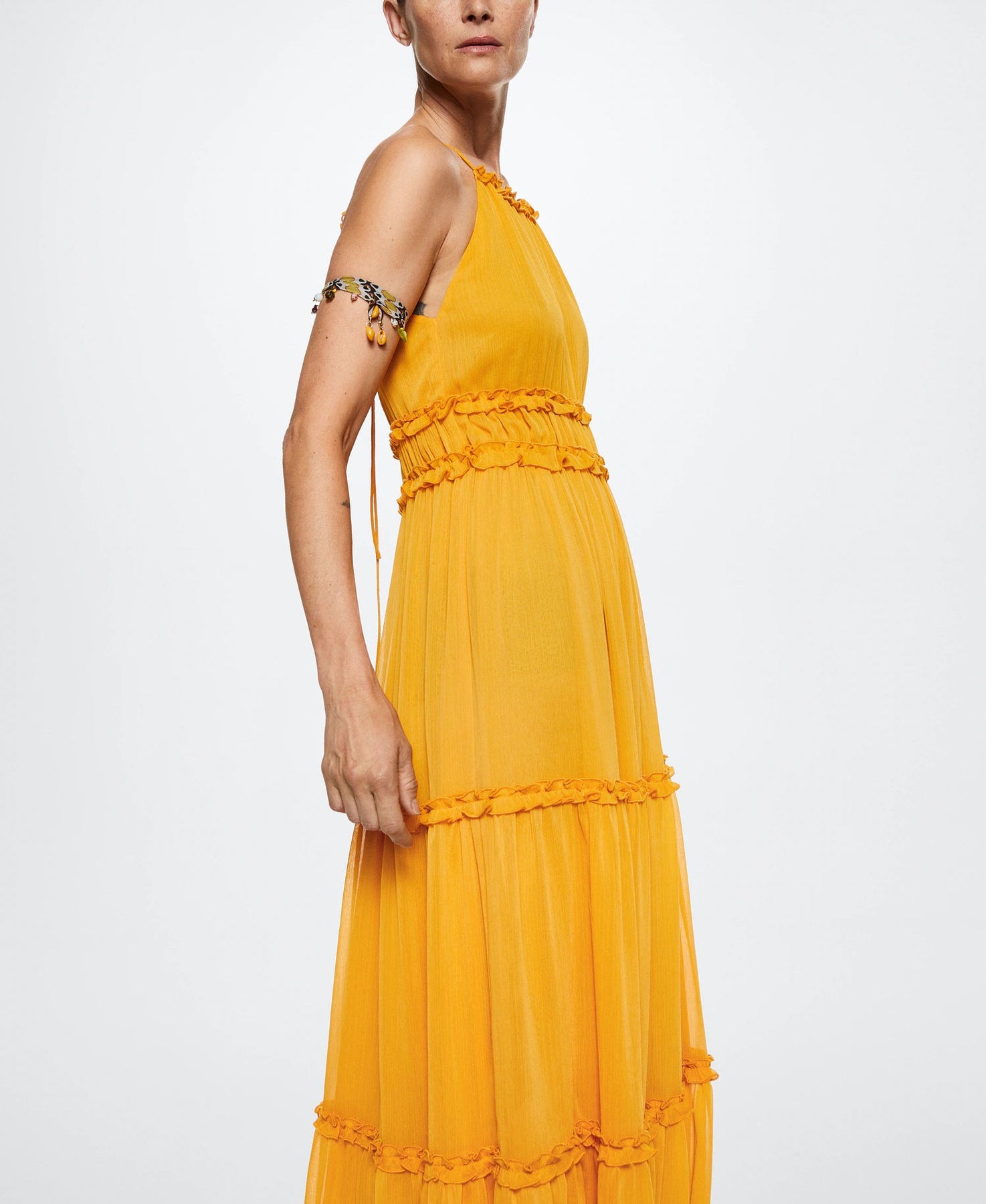 Tejido con textura. Diseño largo. Diseño evasé. Diseño maxi vestido. Estilo boho. Cuello halter. Tirantes finos. Detalle de volantes. Forro interior. Cierre de lazo en el cuello. Colección fiesta y ceremonia.