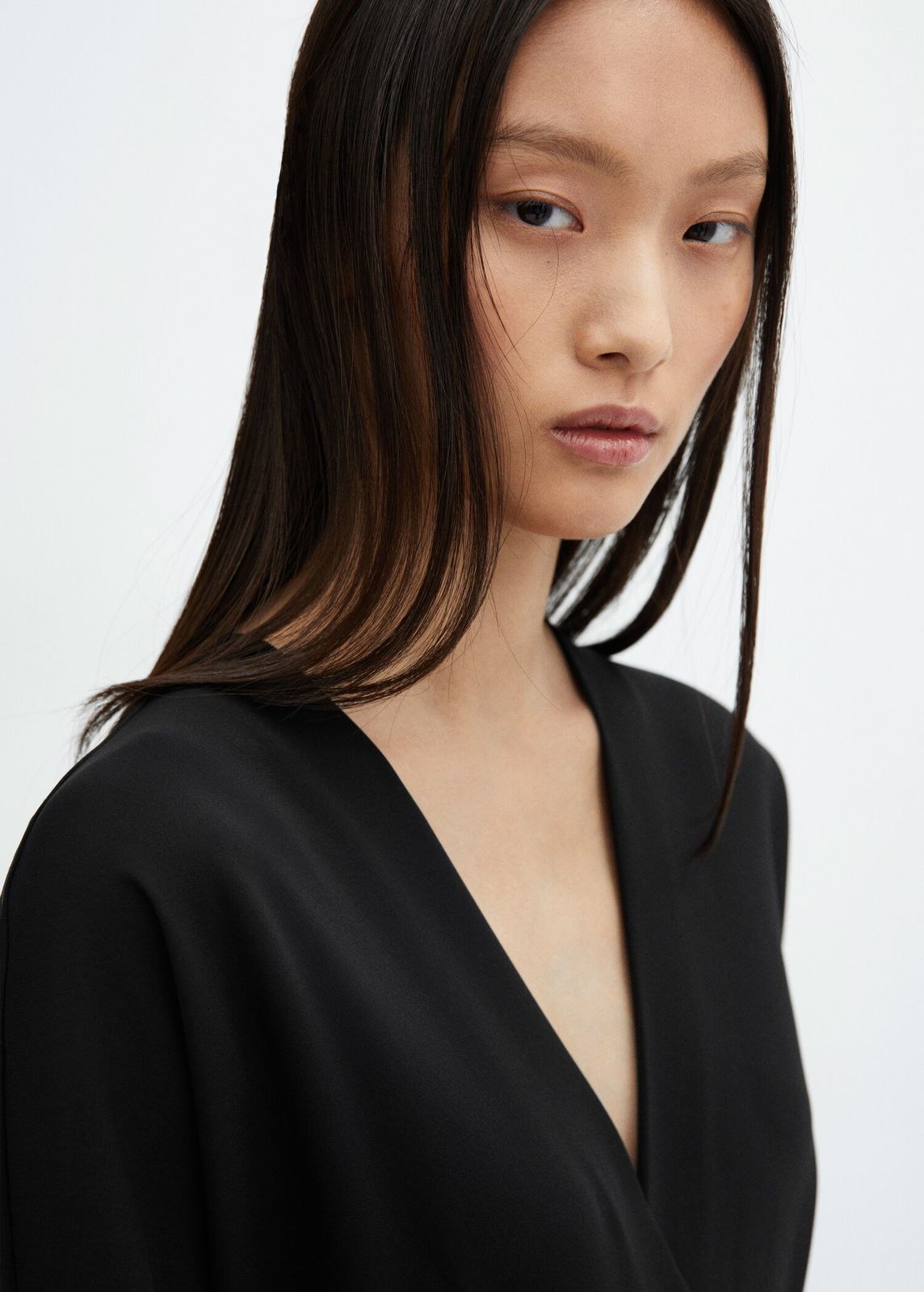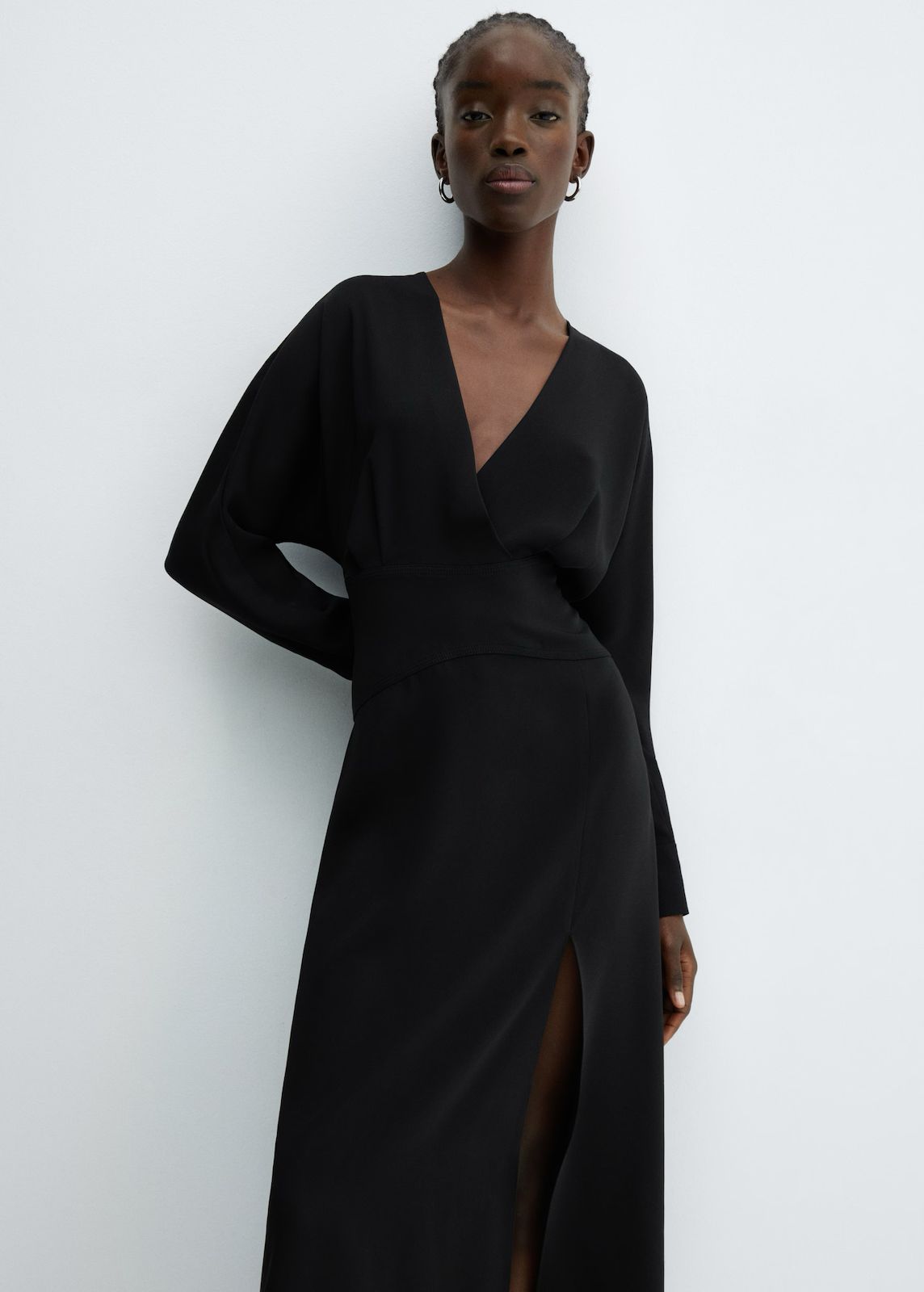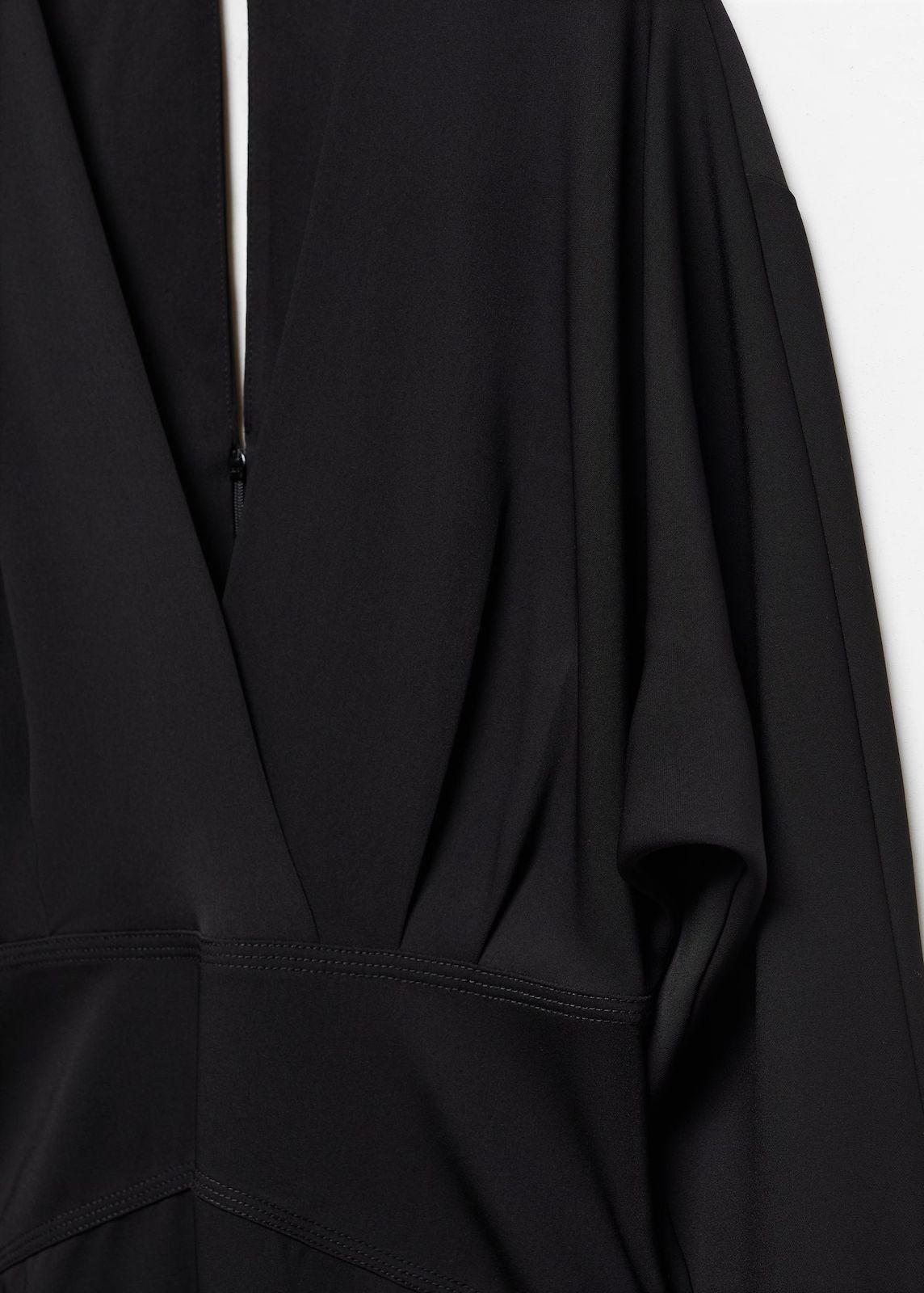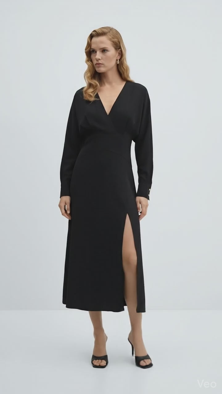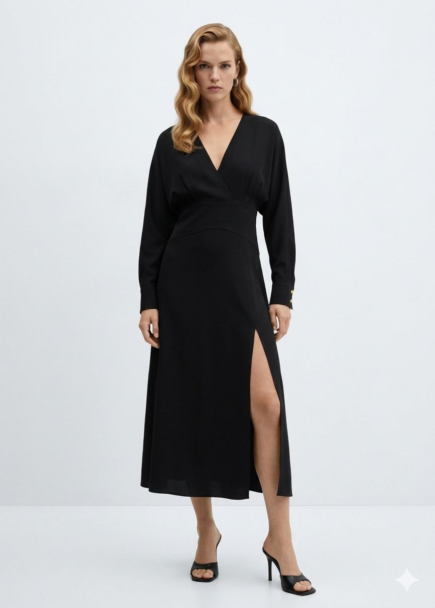 Tejido fluido. Diseño largo. Diseño evasé. Escote de pico cruzado. Manga larga con puños abotonados. Cierre de botón en la parte posterior. Cierre de cremallera invisible en la parte posterior. Abertura lateral. Forro interior.