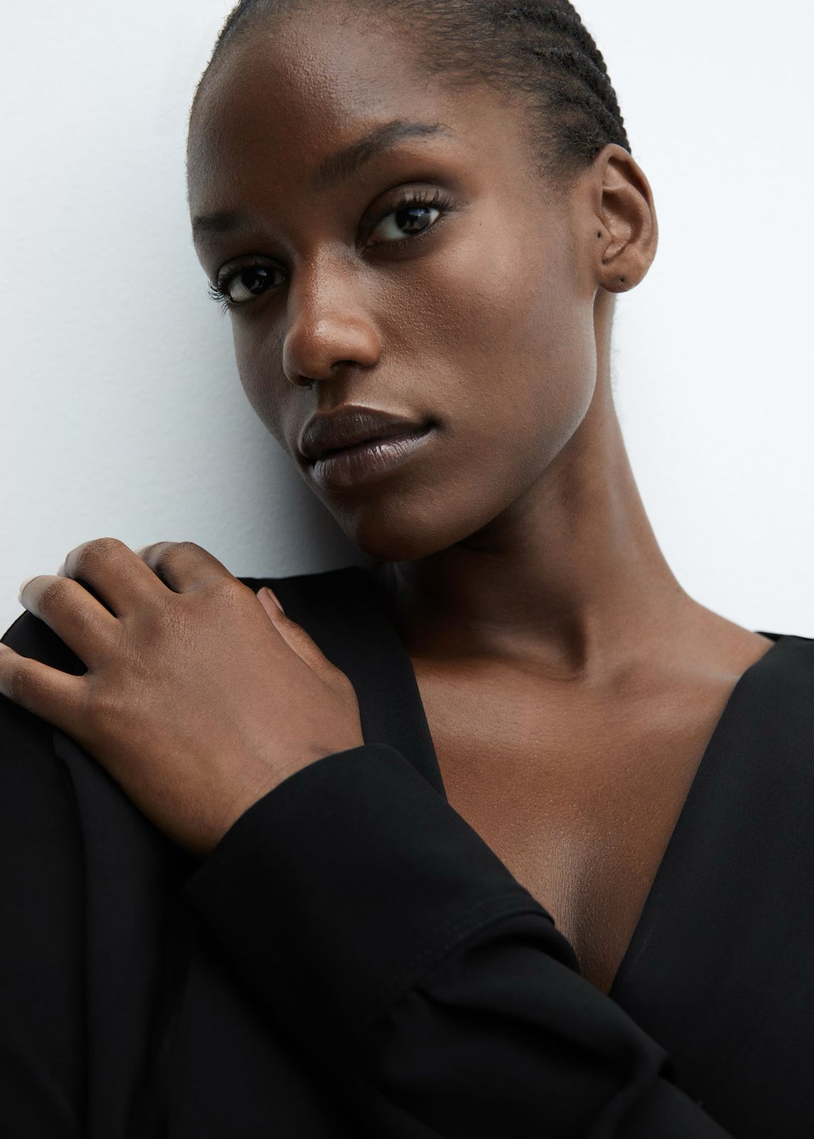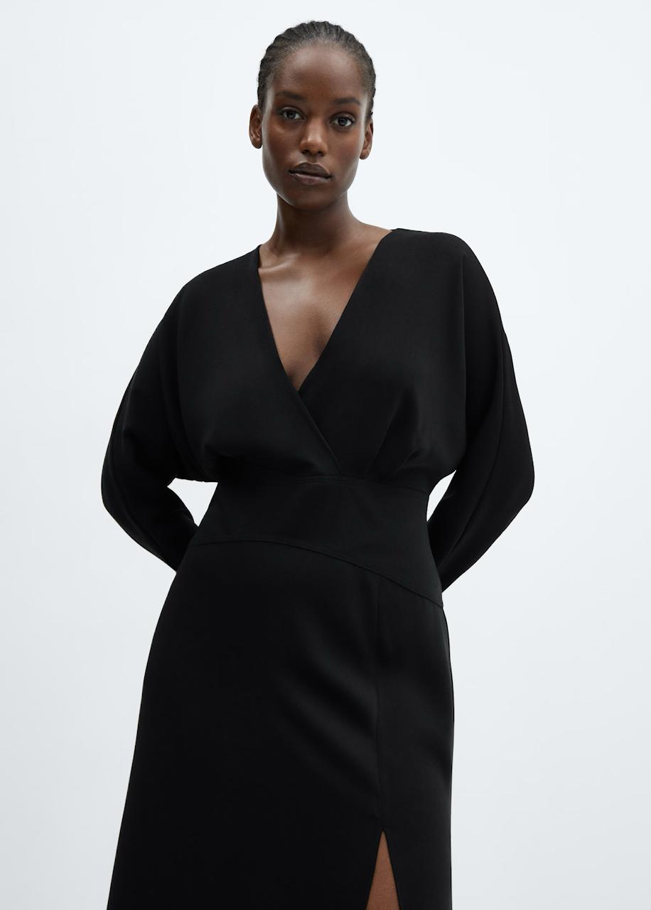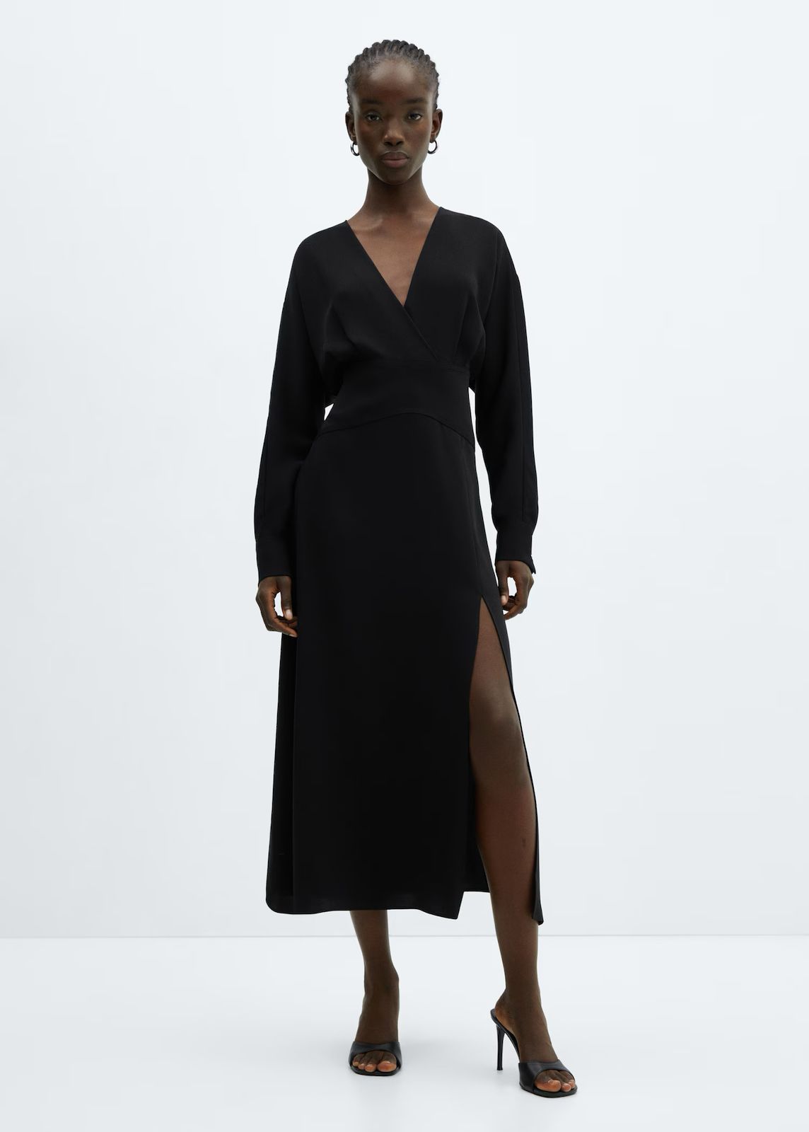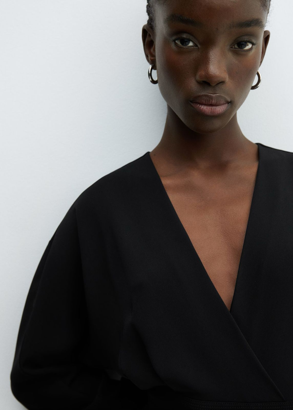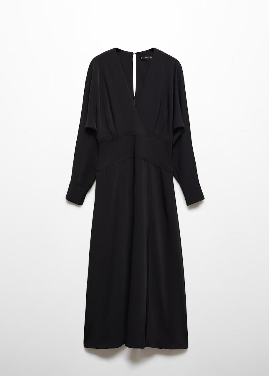 Tejido fluido. Diseño largo. Diseño evasé. Escote de pico cruzado. Manga larga con puños abotonados. Cierre de botón en la parte posterior. Cierre de cremallera invisible en la parte posterior. Abertura lateral. Forro interior.
