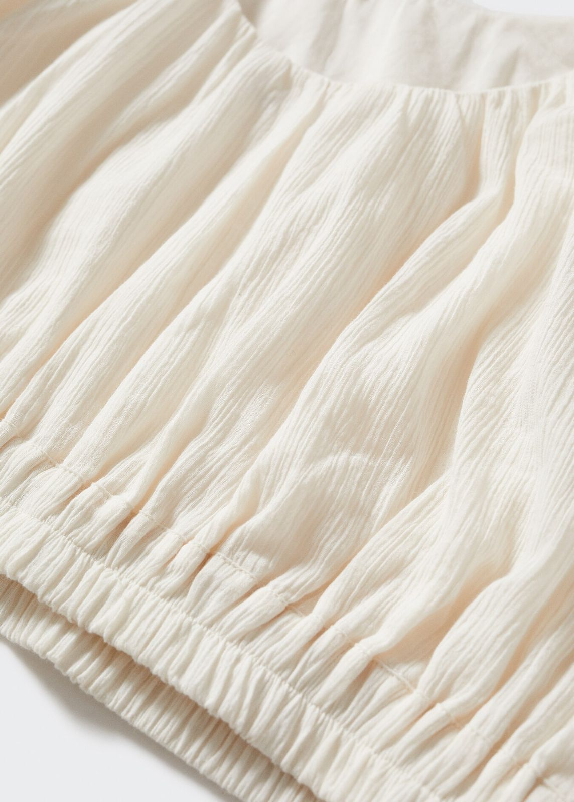 Tejido 100% algodón. Diseño crop. Cuello barco. Detalles elásticos en las mangas. Manga corta abullonada. Bajo elástico.