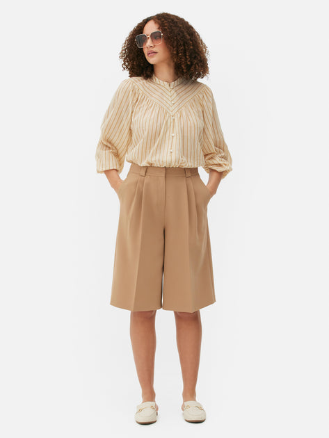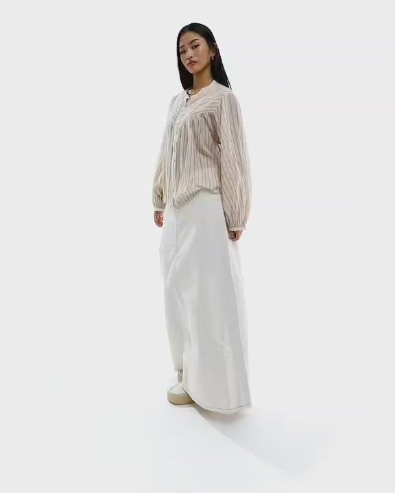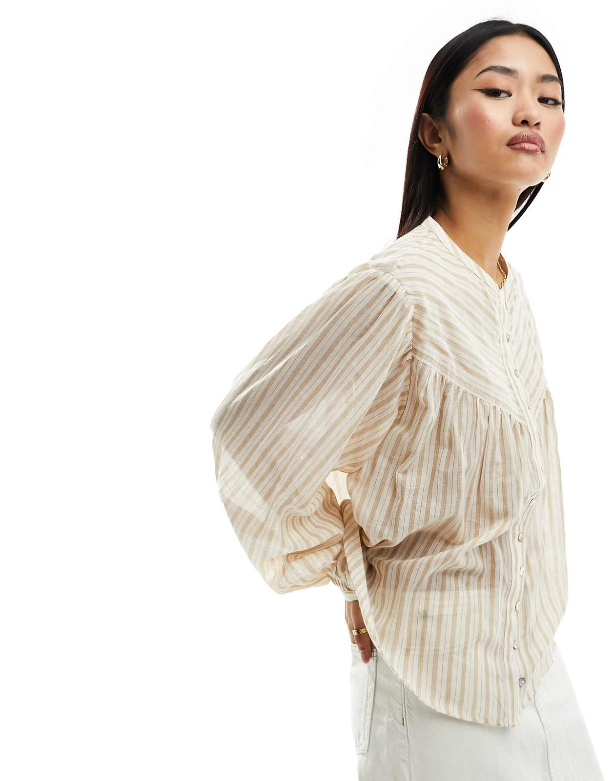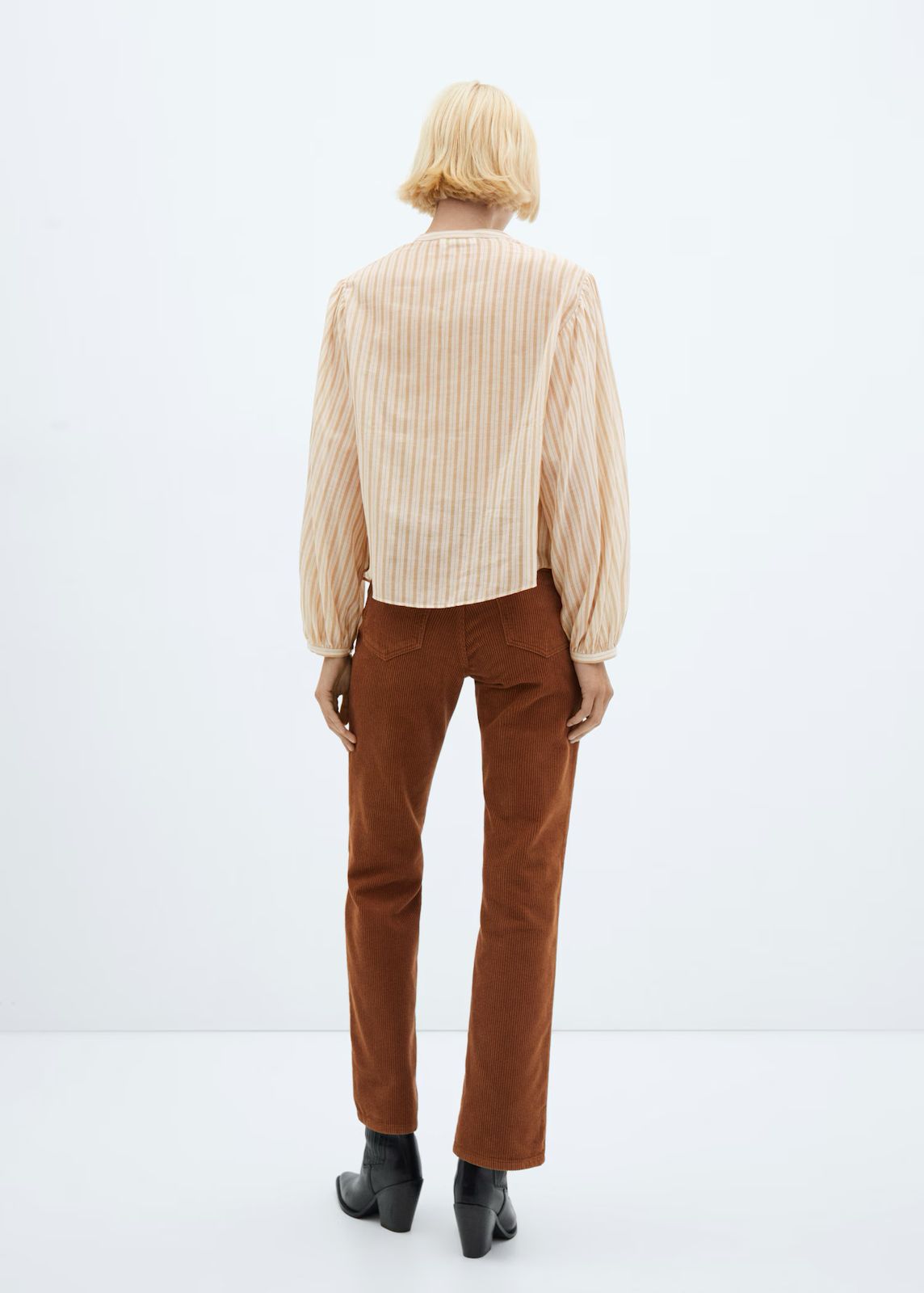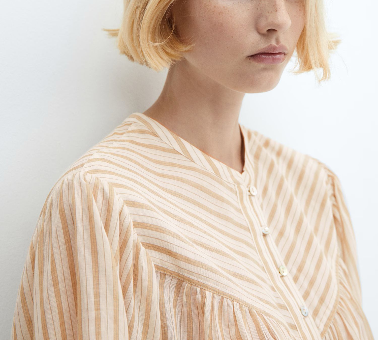 100% algodón. Diseño oversize. Estampado de rayas. Cuello redondo. Manga larga con puños abotonados. Manga abullonada. Cierre delantero con botones.