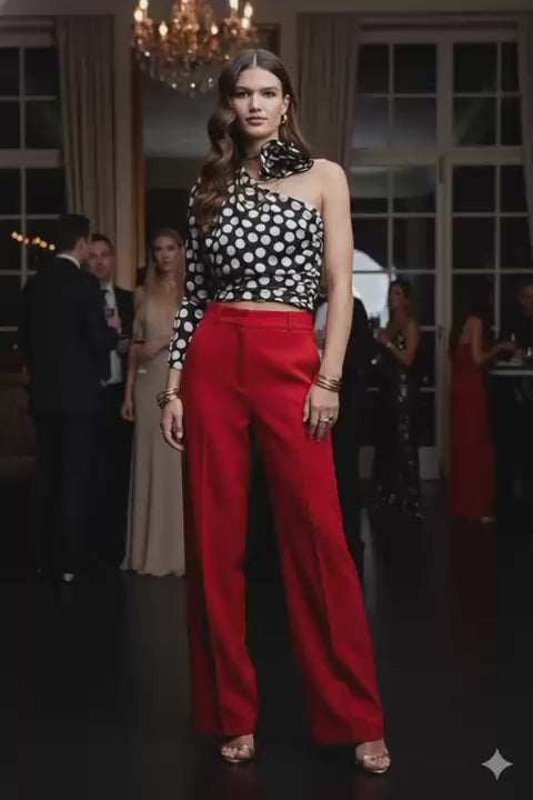 Tejido fluido. Tejido satinado. Estampado de lunares. Diseño crop. Aplique floral. Diseño off-shoulder. Detalle drapeado. Cierre lateral. Manga larga. Colección fiesta y ceremonia.
