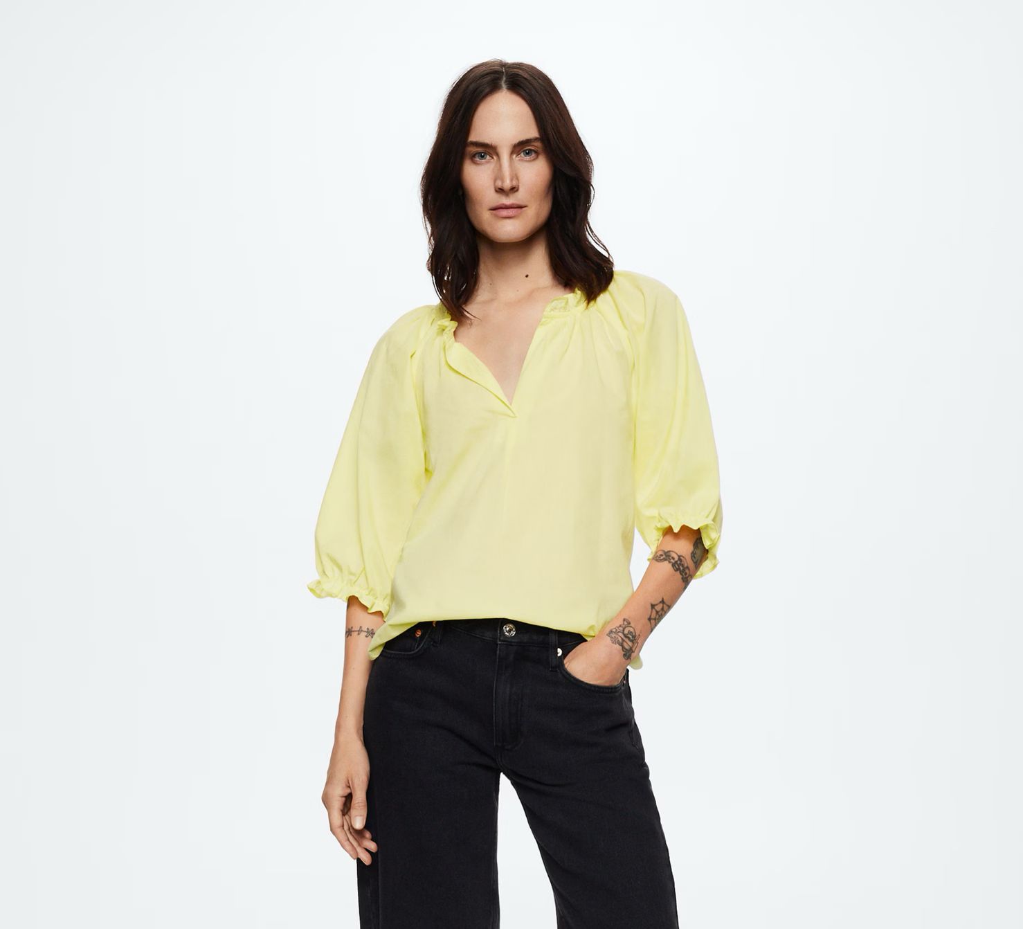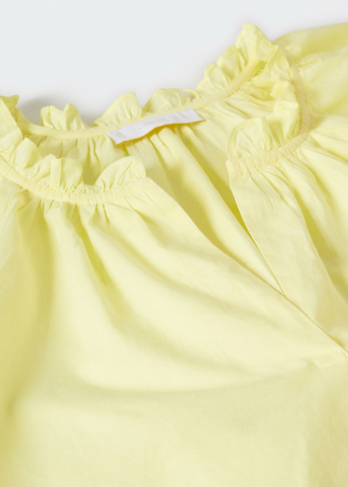 ejido 100% algodón. Tejido popelín de algodón. Cuello pico. Detalle de volantes en el cuello. Manga abullonada con puños elásticos. Manga tres cuartos. Detalle de volante en la manga.