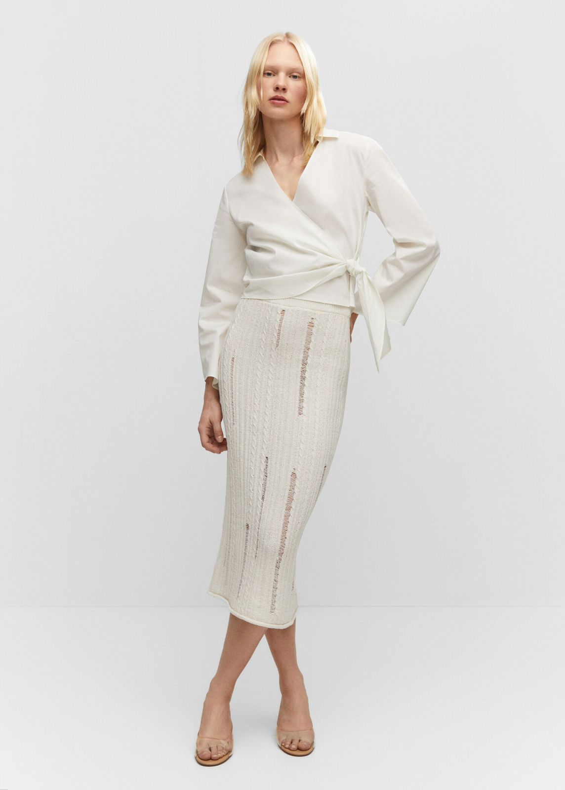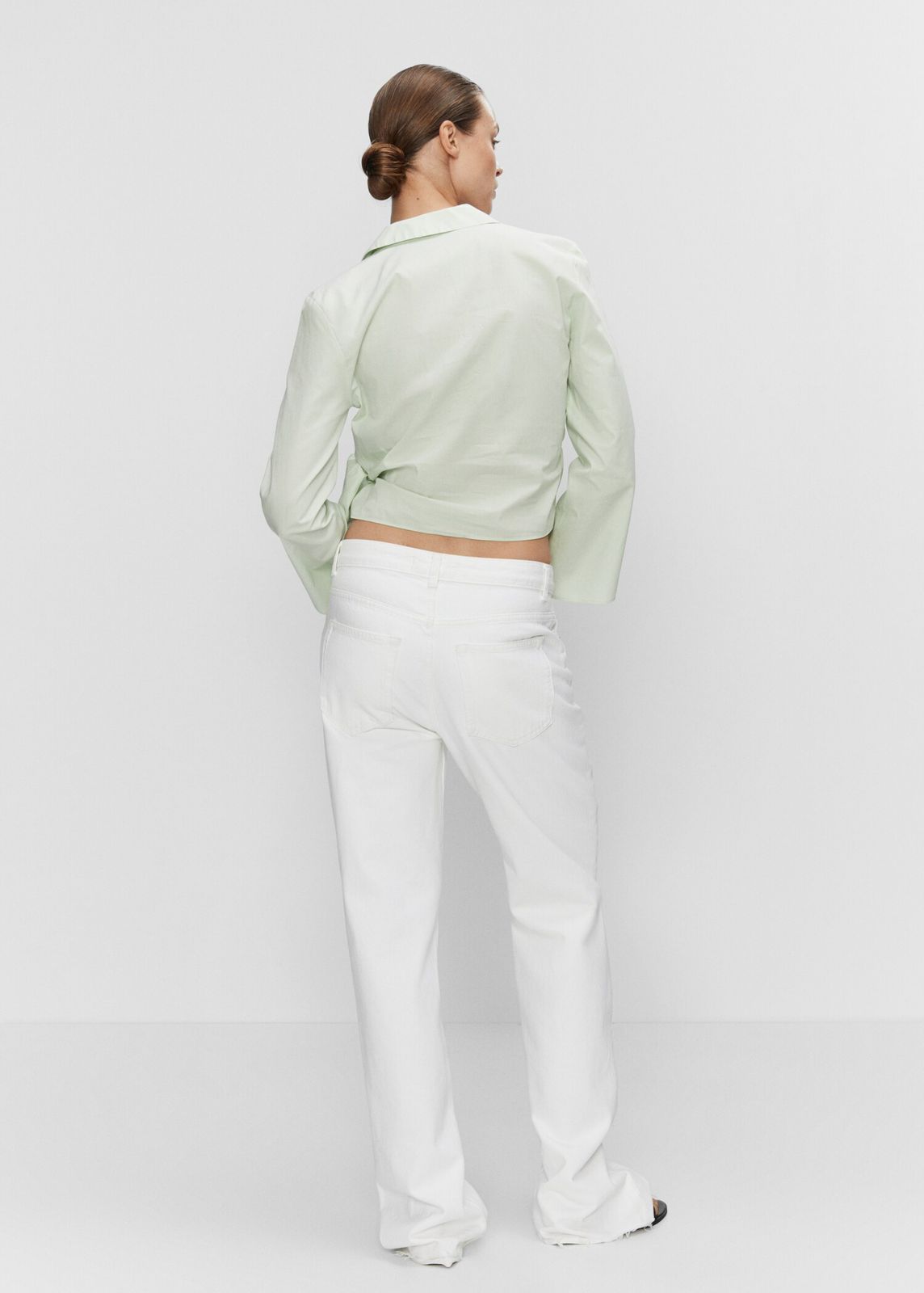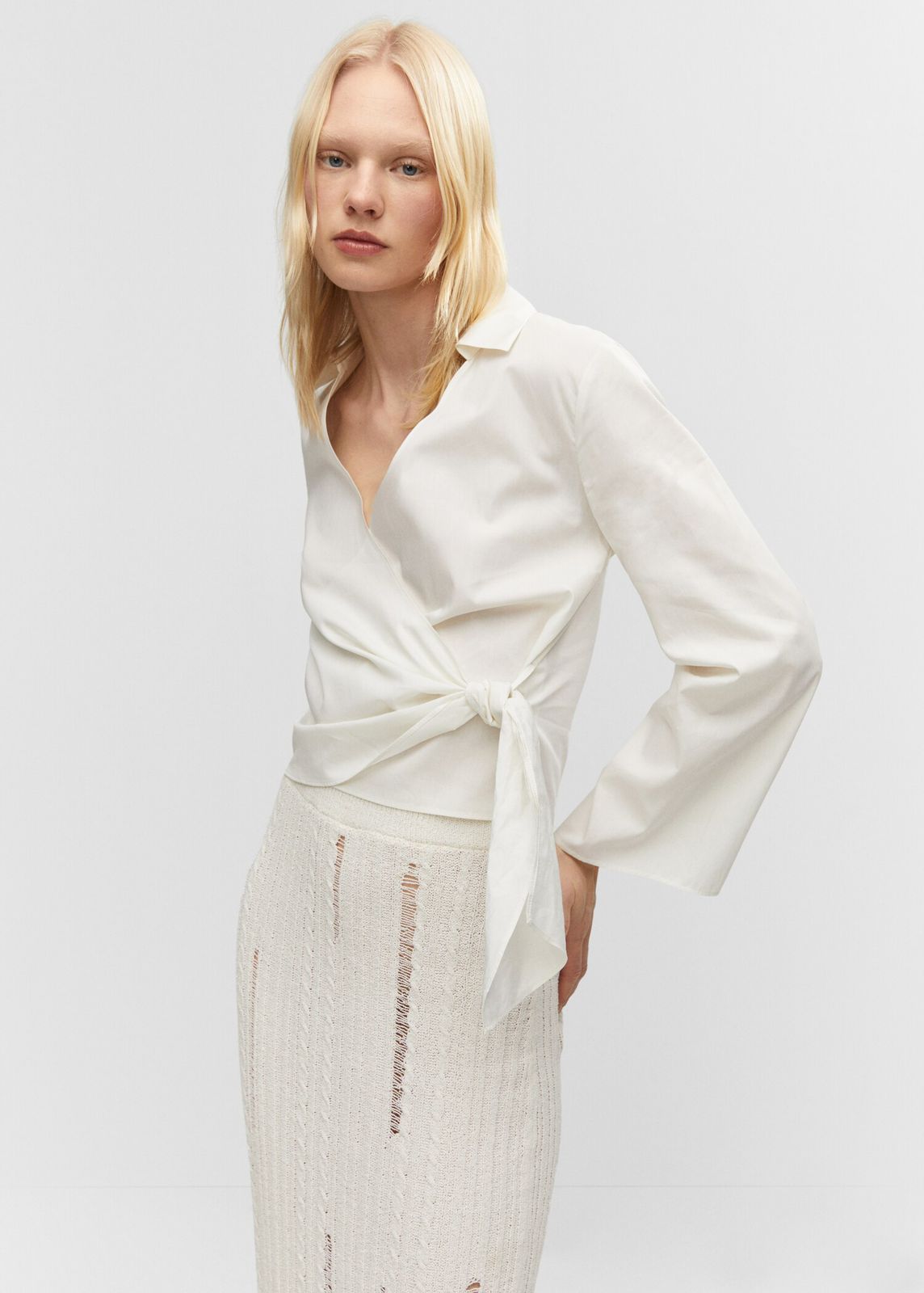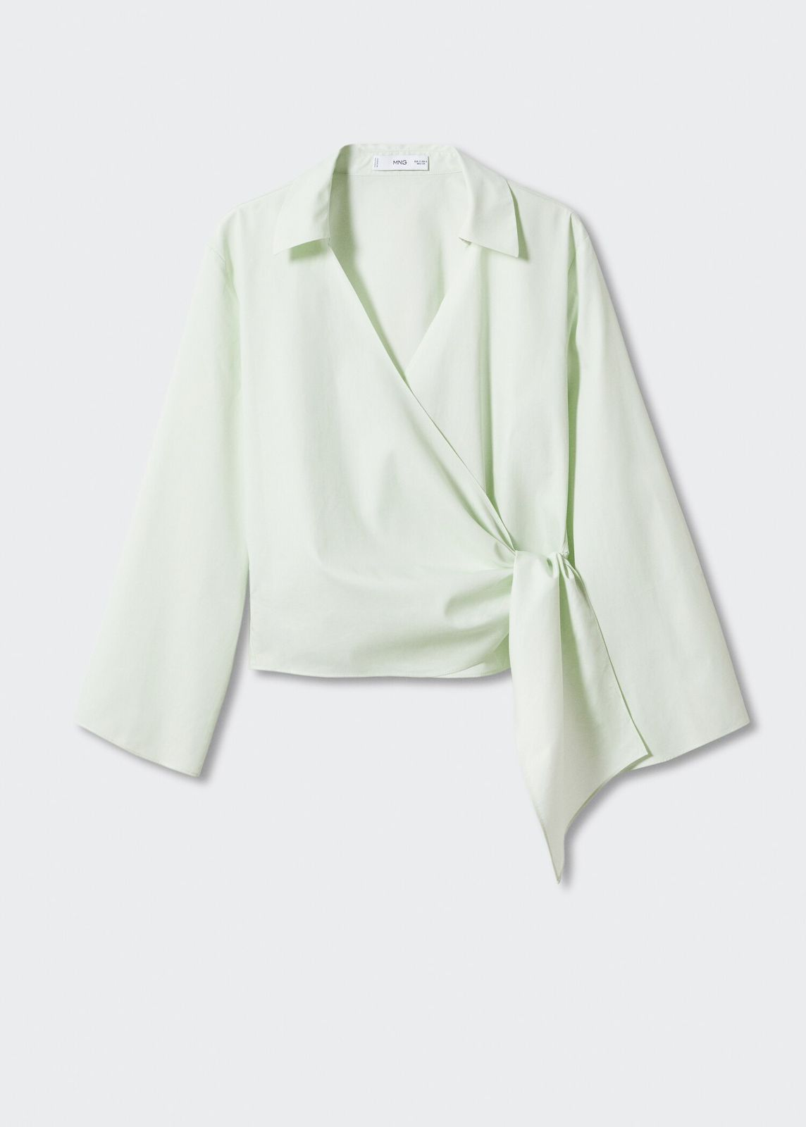 Tejido fluido. Diseño cruzado. Diseño recto. Diseño corto. Cuello camisero. Escote de pico cruzado. Manga larga acampanada. Cierre de nudo. Tejido 100% algodón.