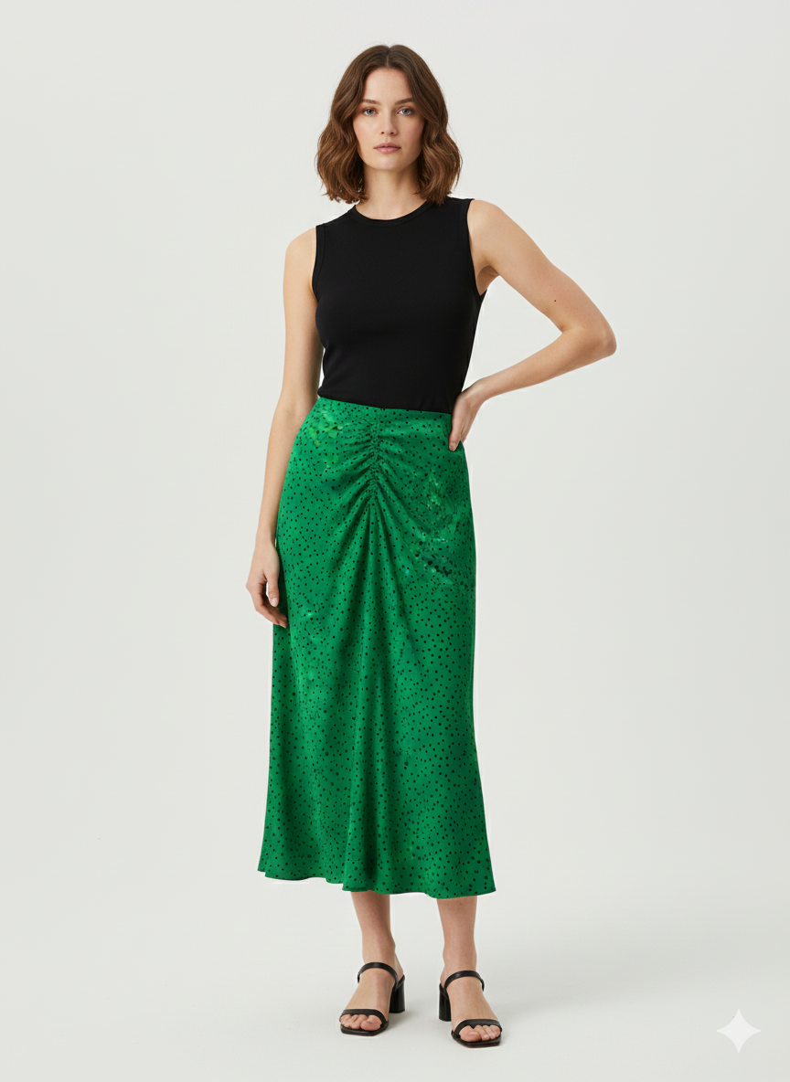 Tejido fluido. Estampado topos. Diseño largo. Tiro medio. Diseño recto. Detalle fruncido en la cintura. Cierre de cremallera en la parte posterior.