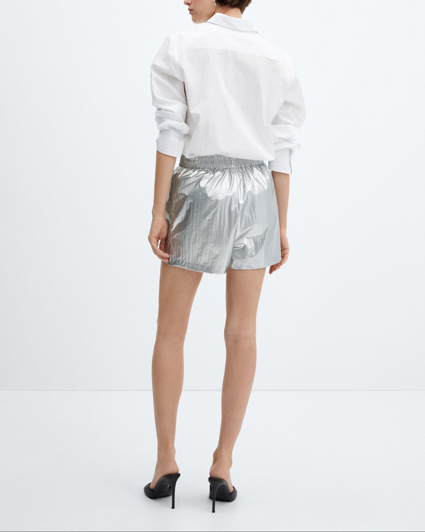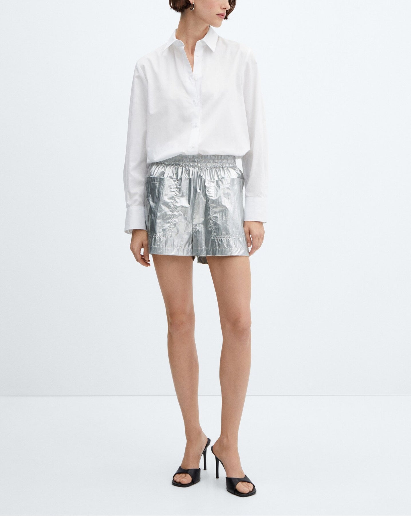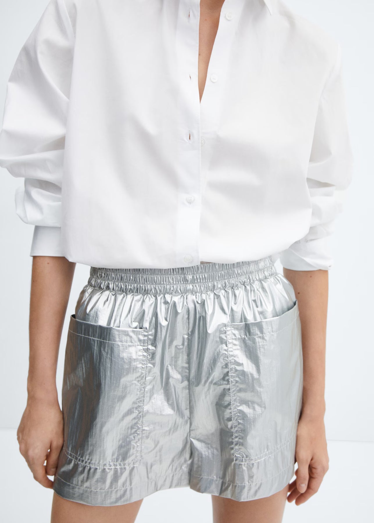 Acabado metalizado. Diseño corto. Diseño recto. Dos bolsillos de parche en la parte delantera. Cintura con goma elástica. Sin cierre.