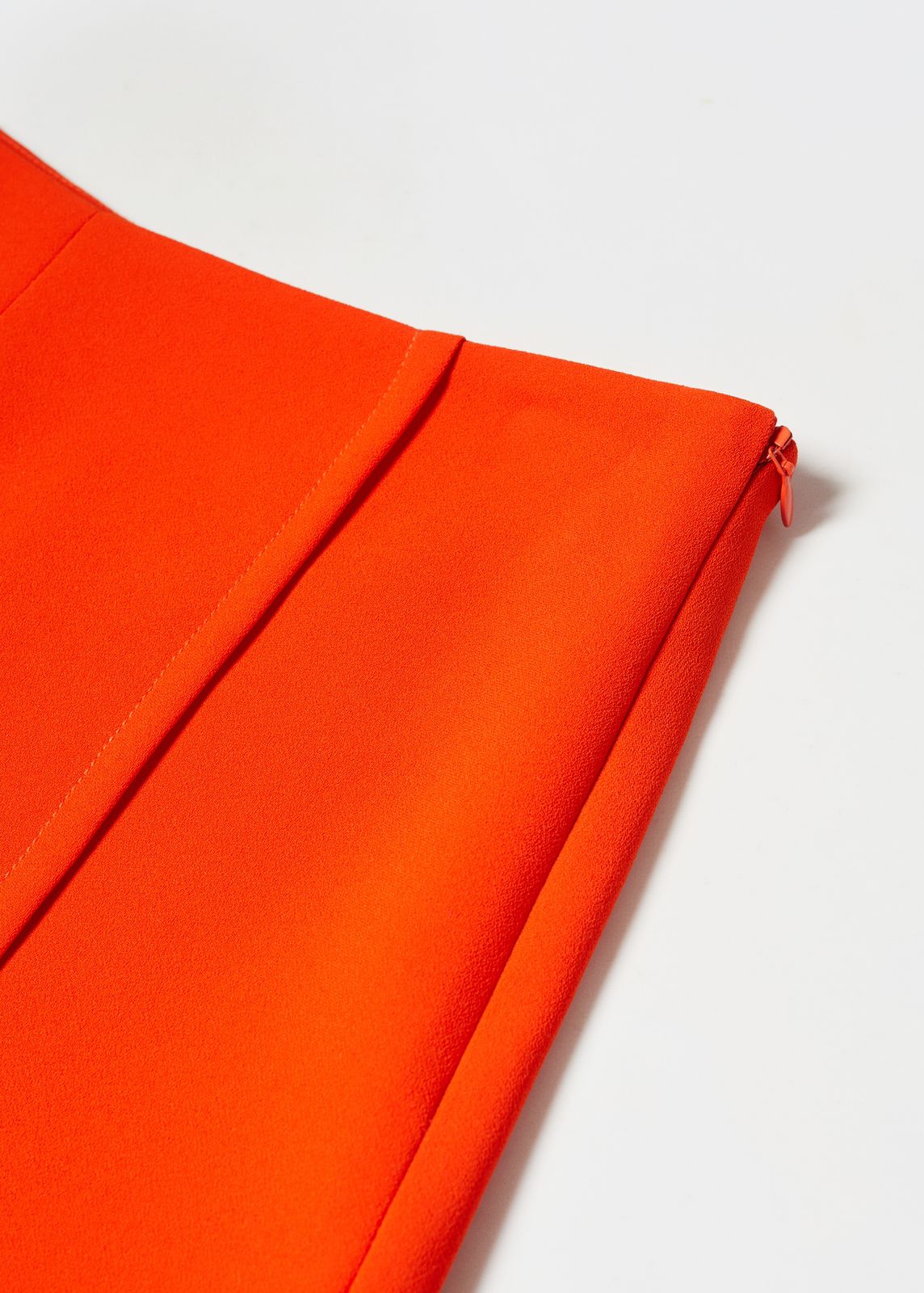 Tejido fluido. Diseño recto. Diseño corto. Tiro alto. Cierre lateral de cremallera. Costuras decorativas. Forro interior.