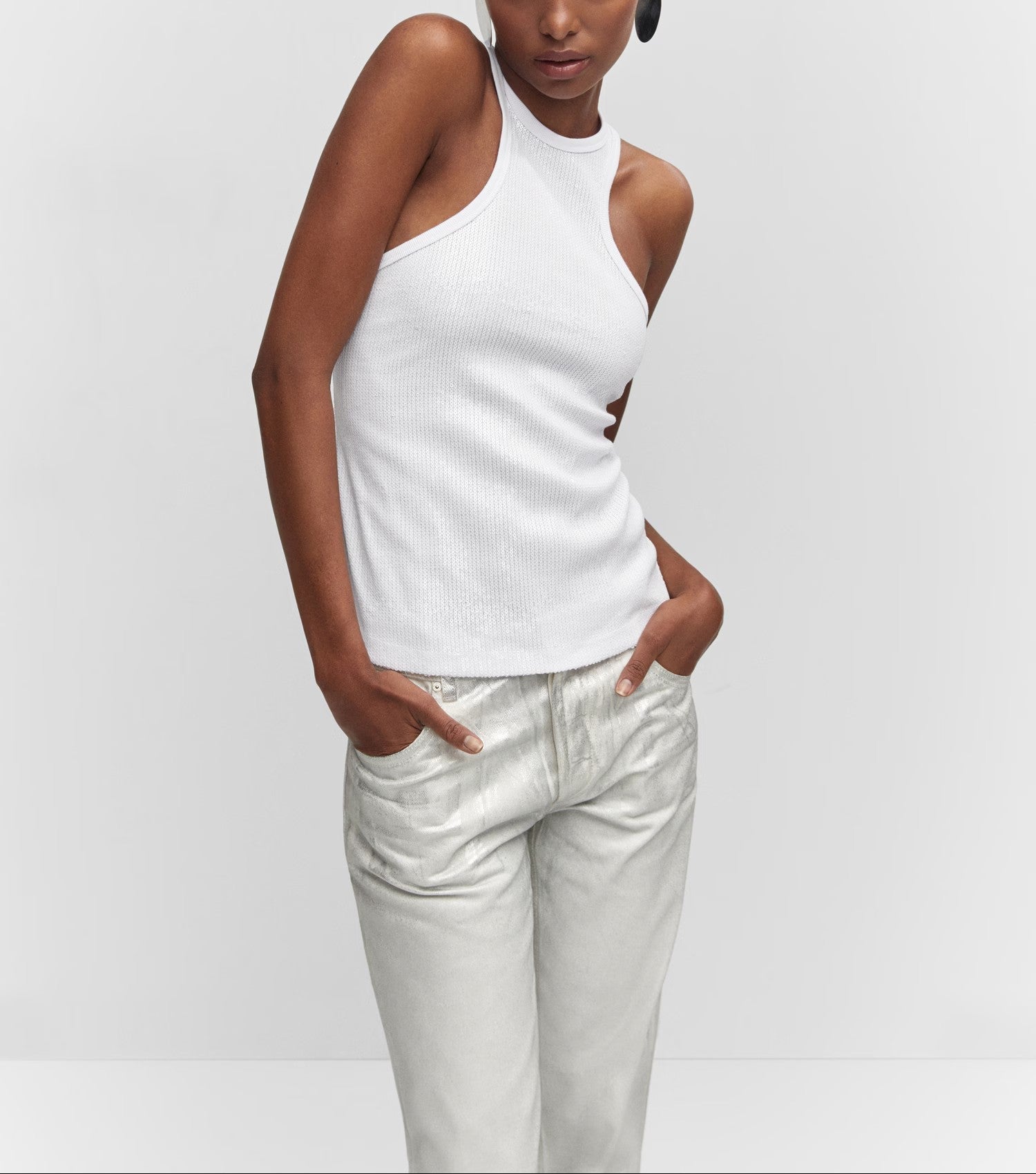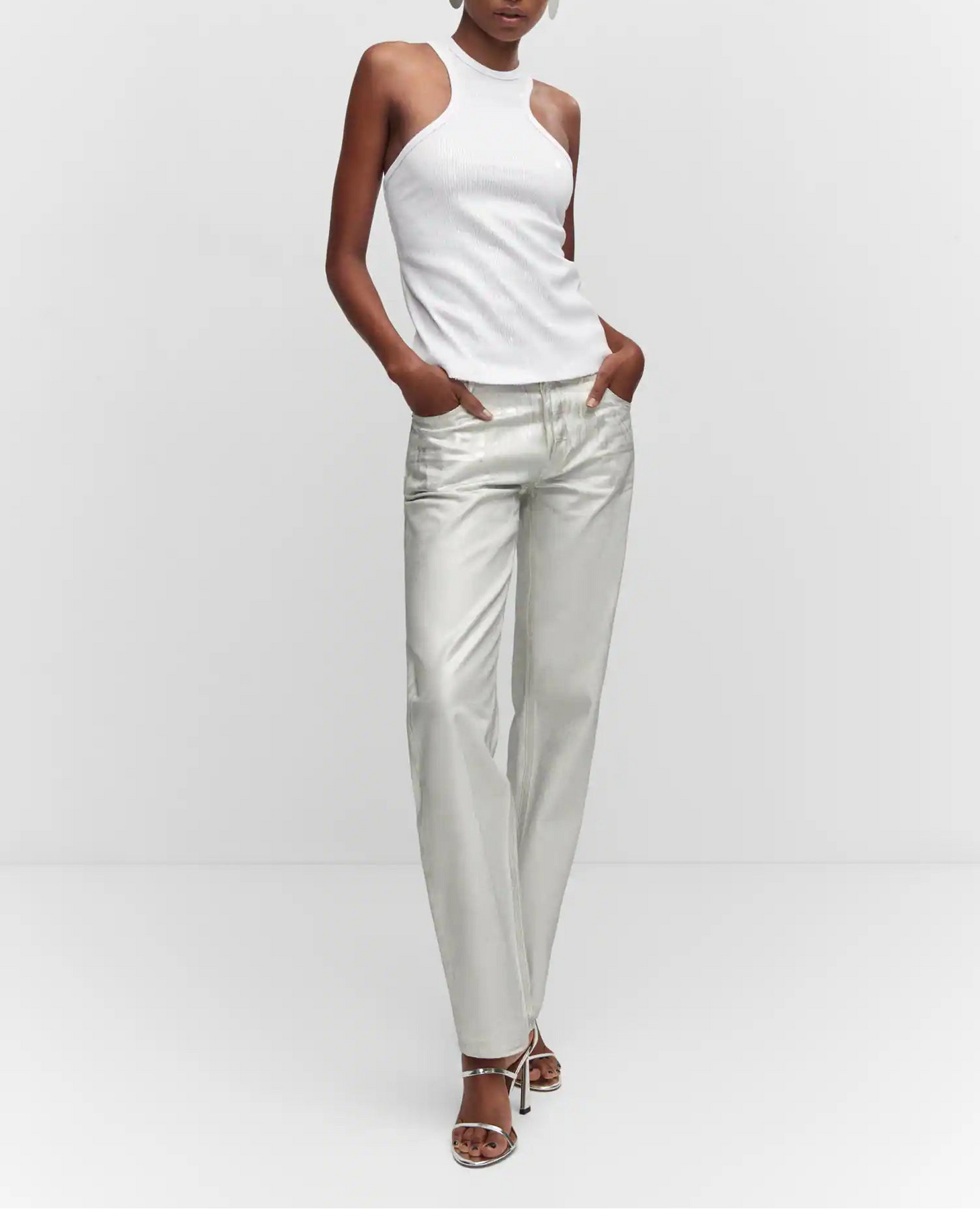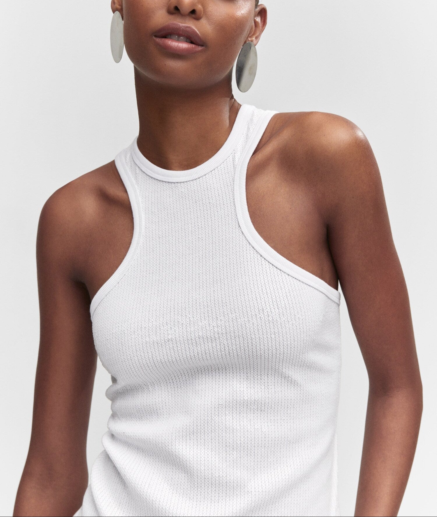 Tejido con lentejuelas. Cuello halter. Tirantes anchos. Sin cierre. Festival Season. Colección fiesta y ceremonia. Diseño entallado.