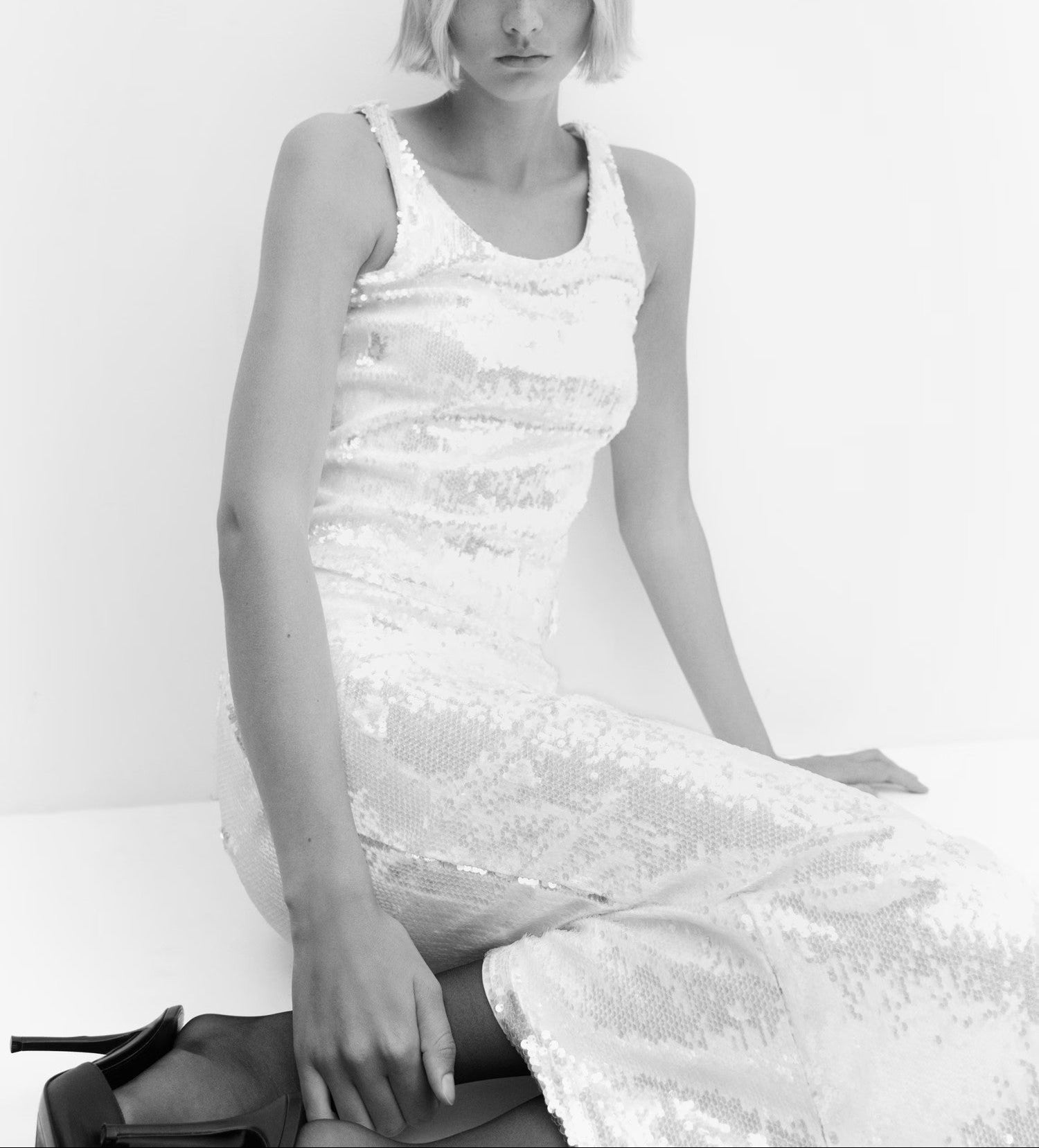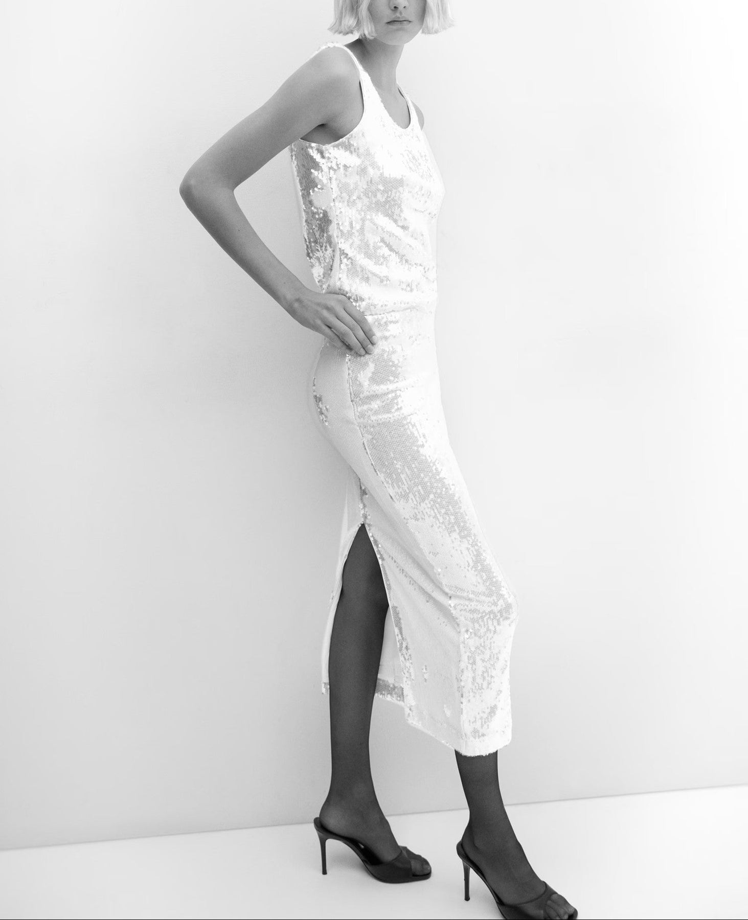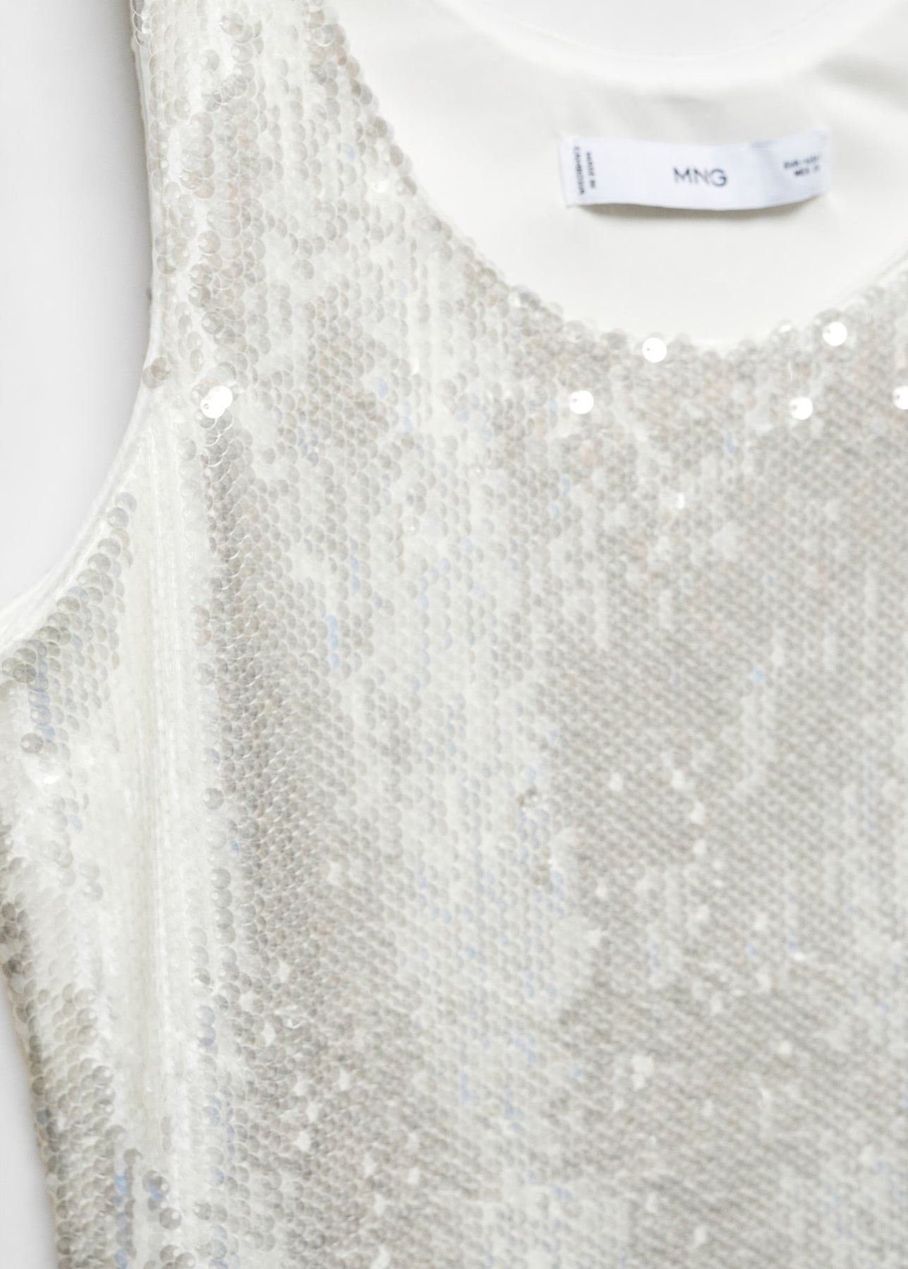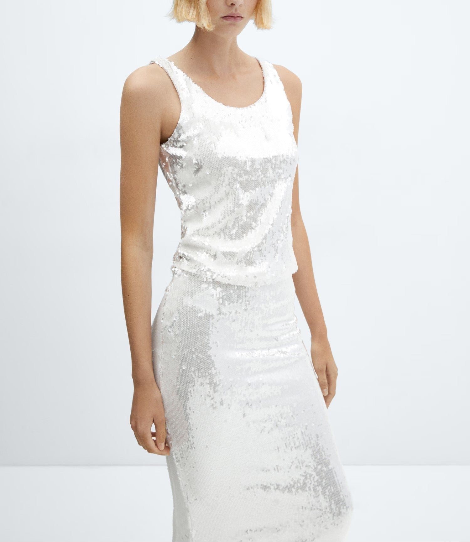 Tejido de lentejuelas. Diseño recto. Cuello redondo. Sin mangas. Tirantes anchos. Sin cierre. Forro interior. Total look. Colección fiesta y ceremonia.