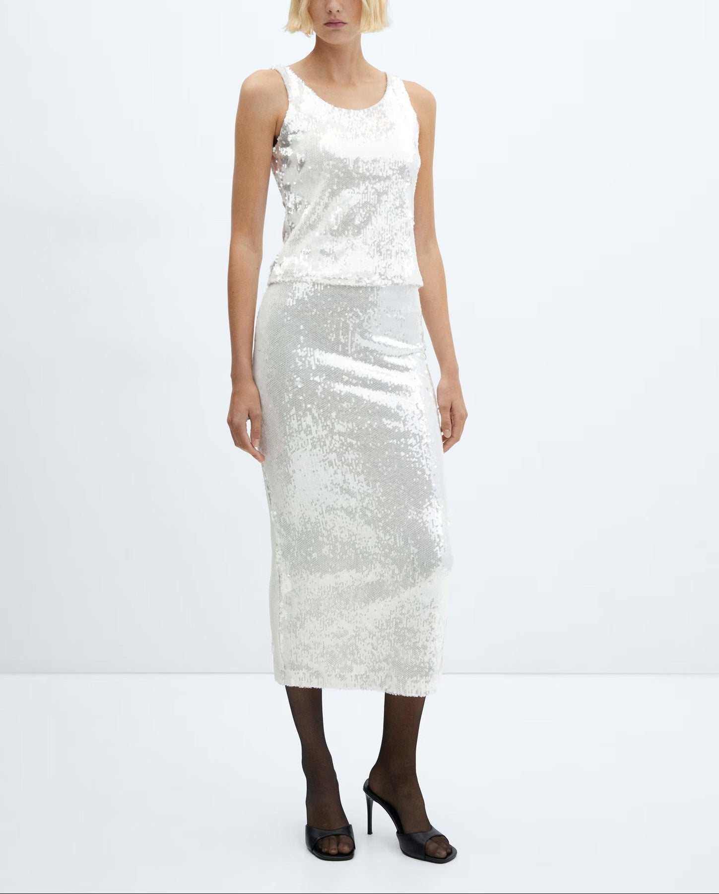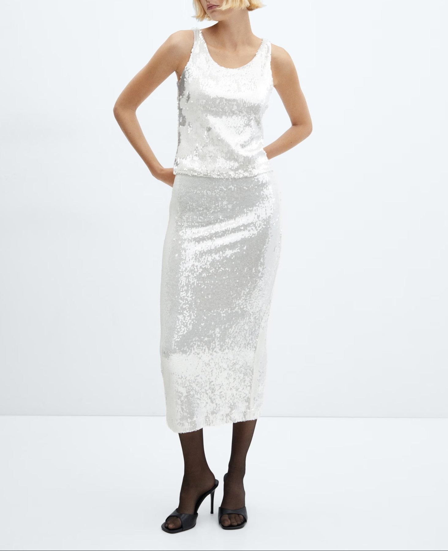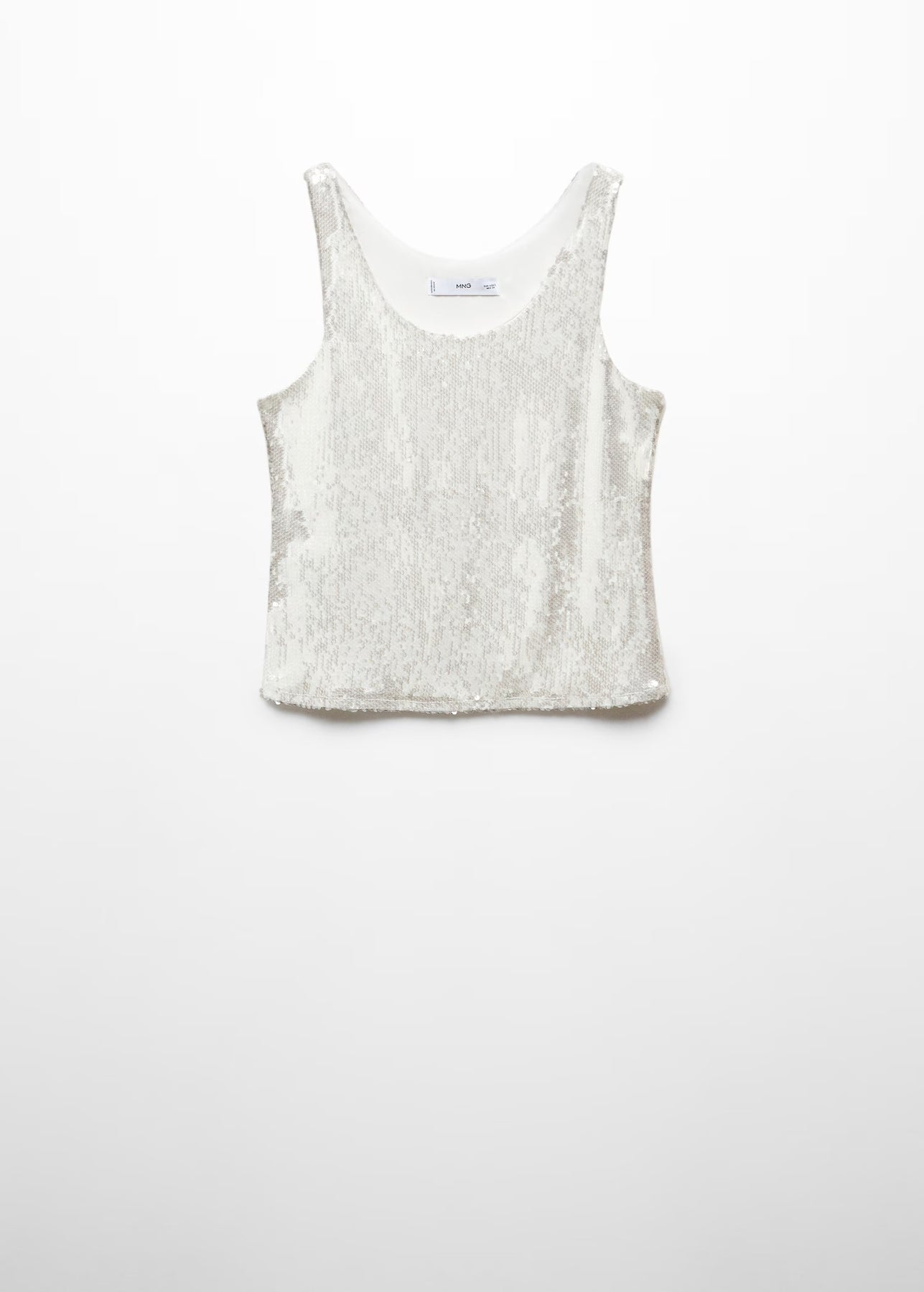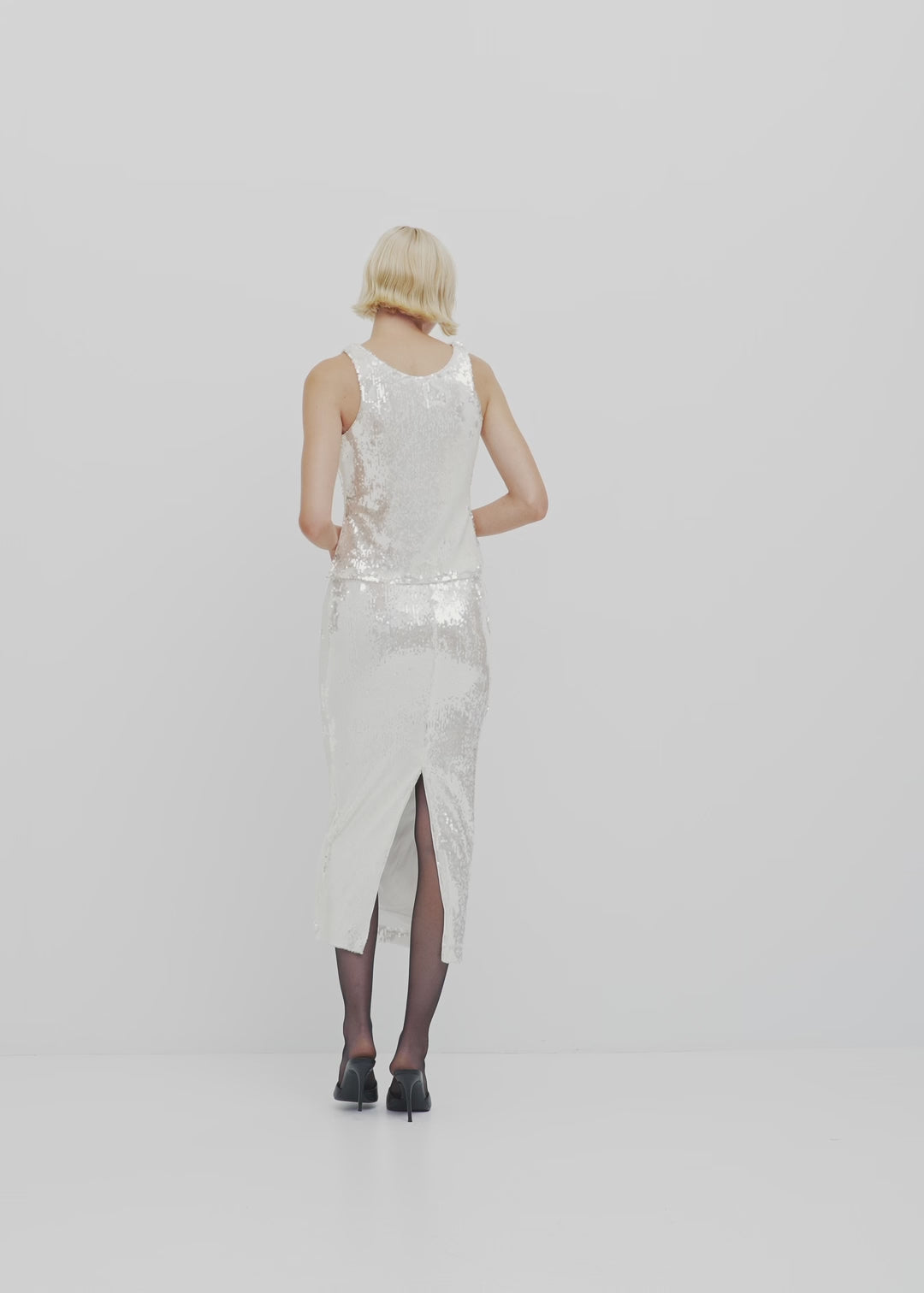 Tejido de lentejuelas. Diseño recto. Cuello redondo. Sin mangas. Tirantes anchos. Sin cierre. Forro interior. Total look. Colección fiesta y ceremonia.