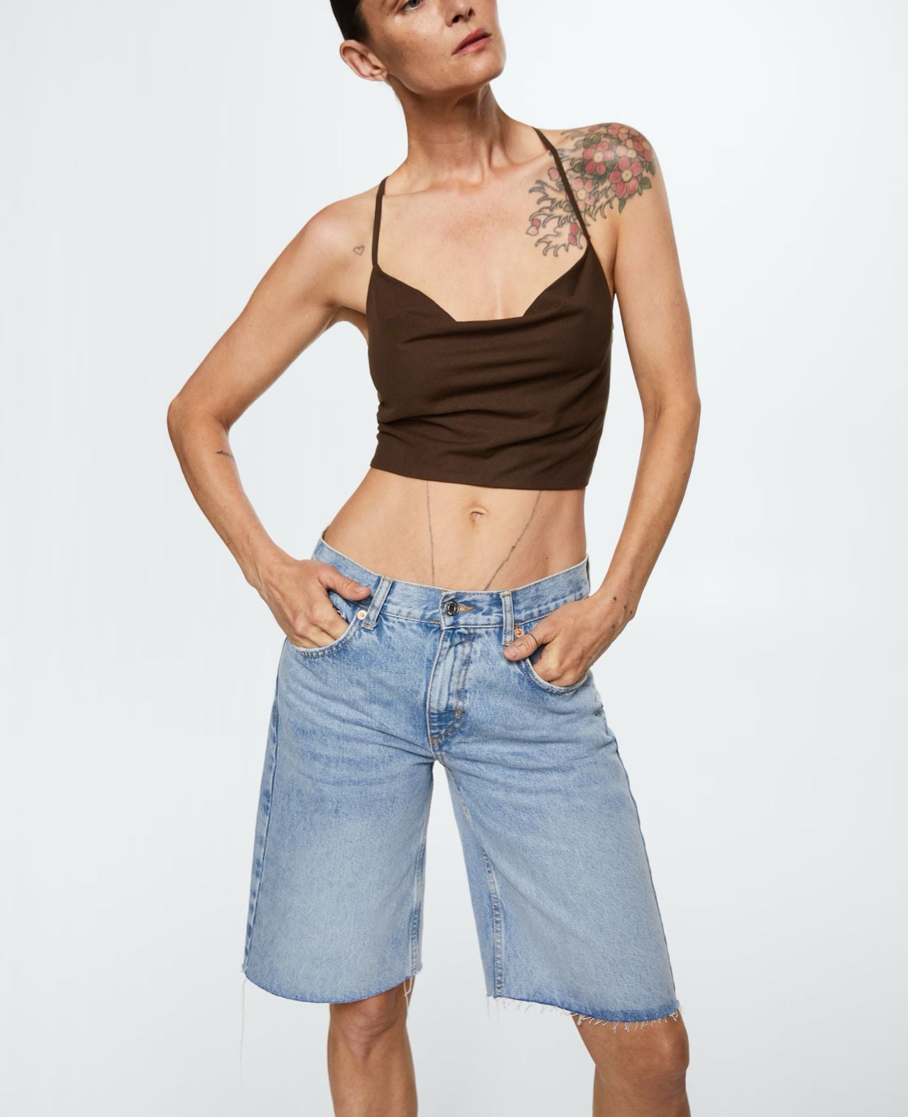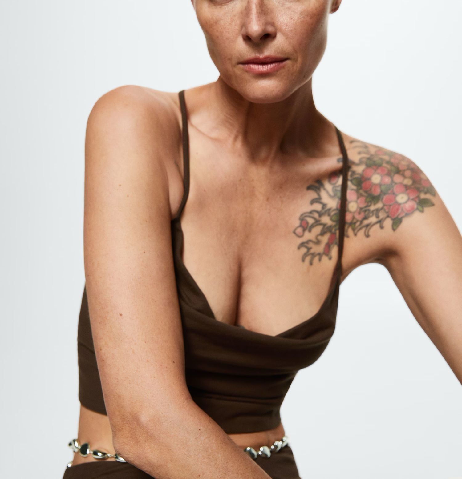 Tejido fluido. Diseño crop. Diseño entallado. Cuello escotado. Escote drapeado. Tirantes finos. Espalda abierta. Tirantes cruzados en la espalda. Tirantes ajustables. Cierre de lazo en la espalda. Total look. Colección fiesta y ceremonia.