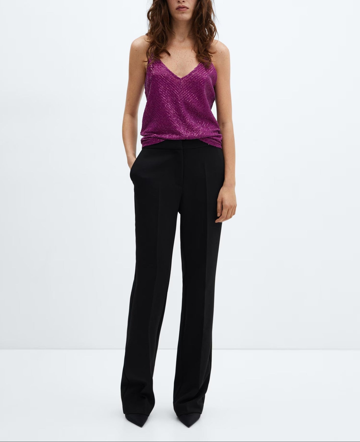 Tejido de lentejuelas. Estilo lencero. Diseño recto. Cuello pico. Sin mangas. Tirantes finos. Forro interior. Colección fiesta y ceremonia.