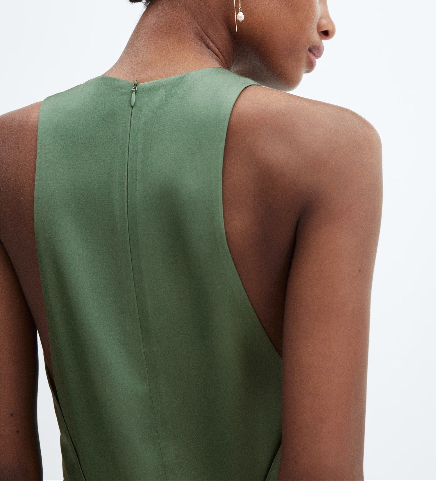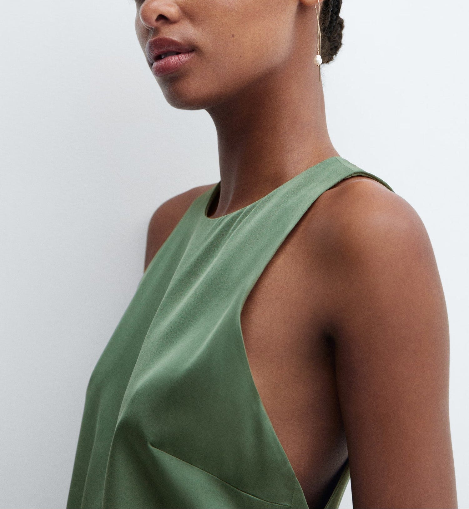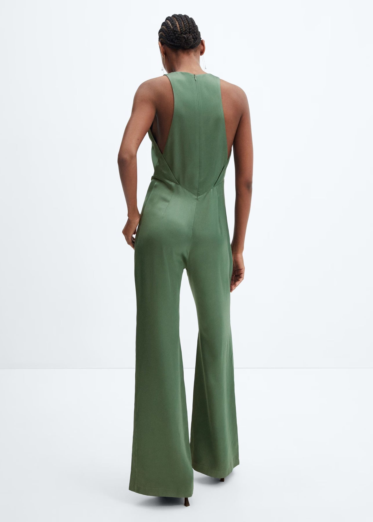 Tejido fluido. Diseño largo. Diseño wideleg. Efecto satinado. Sin mangas. Cuello halter. Cierre de cremallera en la parte posterior. Forro interior.