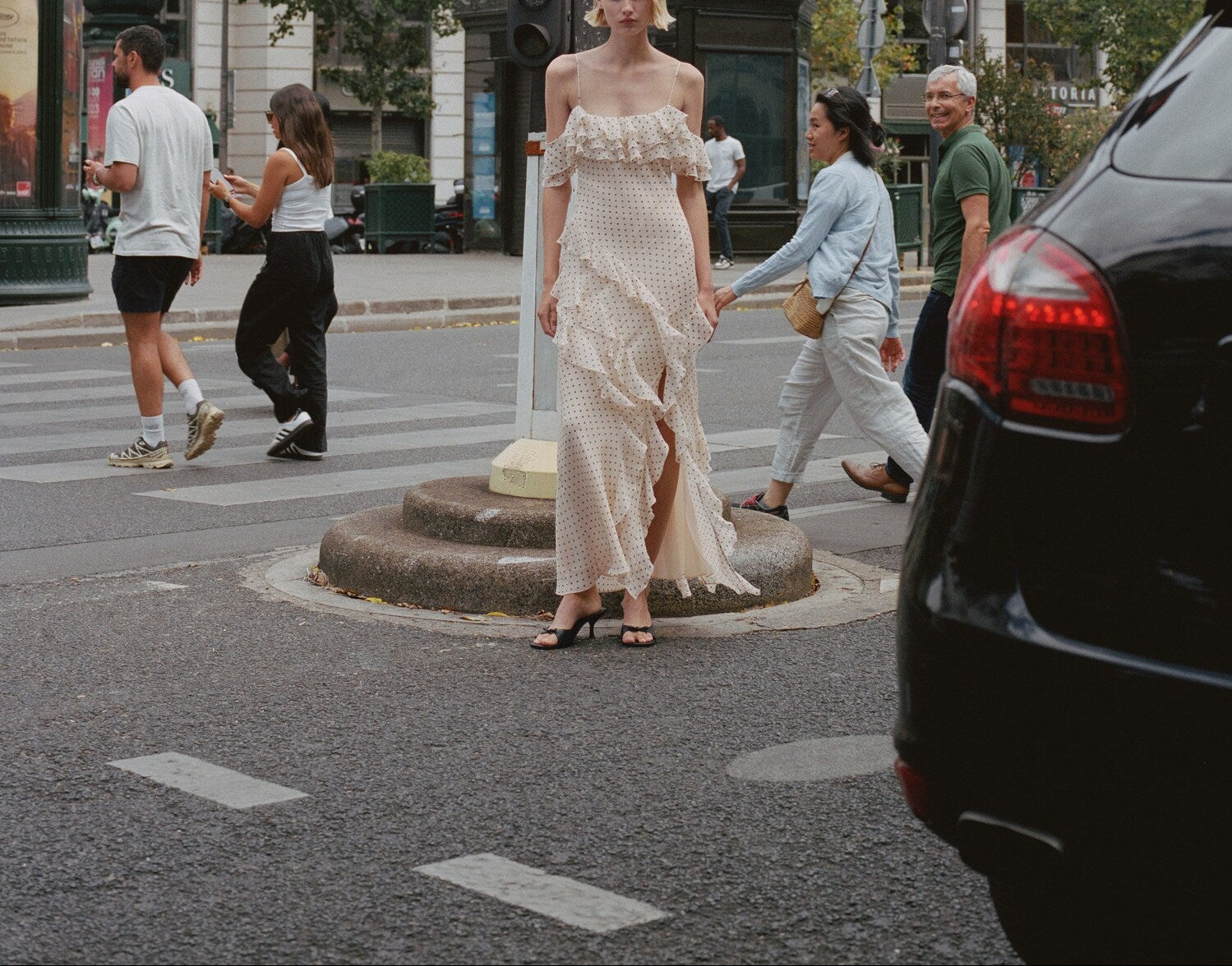 Tejido de gasa. Tejido fluido. Estampado de lunares. Diseño largo. Escote barco. Manga corta. Tirantes finos. Espalda con escote. Detalle de volantes. Cierre cremallera invisible en el lateral. Abertura en el bajo parte delantera. Forro interior. Colección fiesta y ceremonia. Diseño entallado.