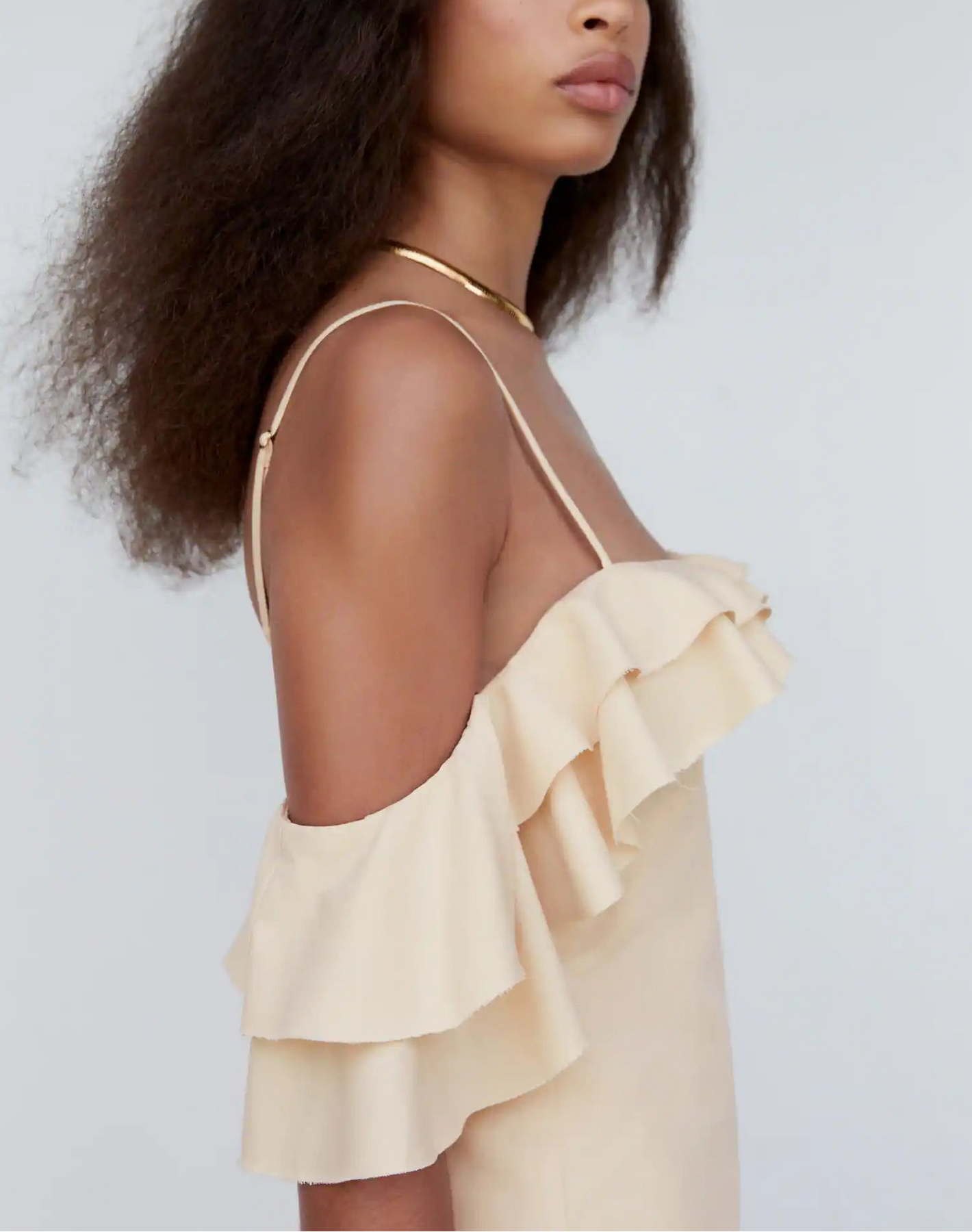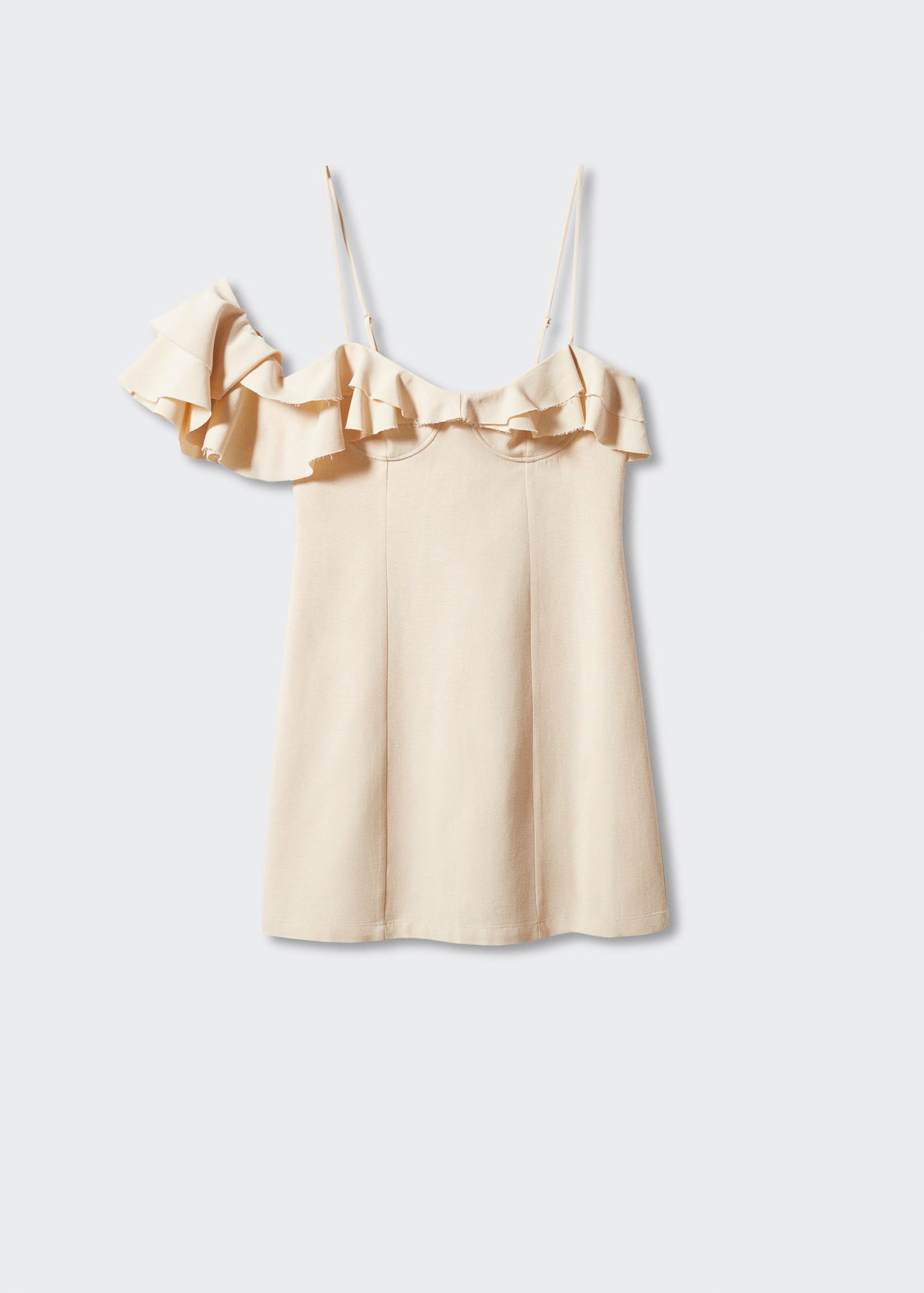 Tejido fluido. Diseño asimétrico. Diseño entallado. Diseño corto. Cuello escotado. Tirantes finos ajustables. Detalle de volantes en los hombros. Abertura en la espalda. Cierre de cremallera en la parte posterior. Colección fiesta y ceremonia.