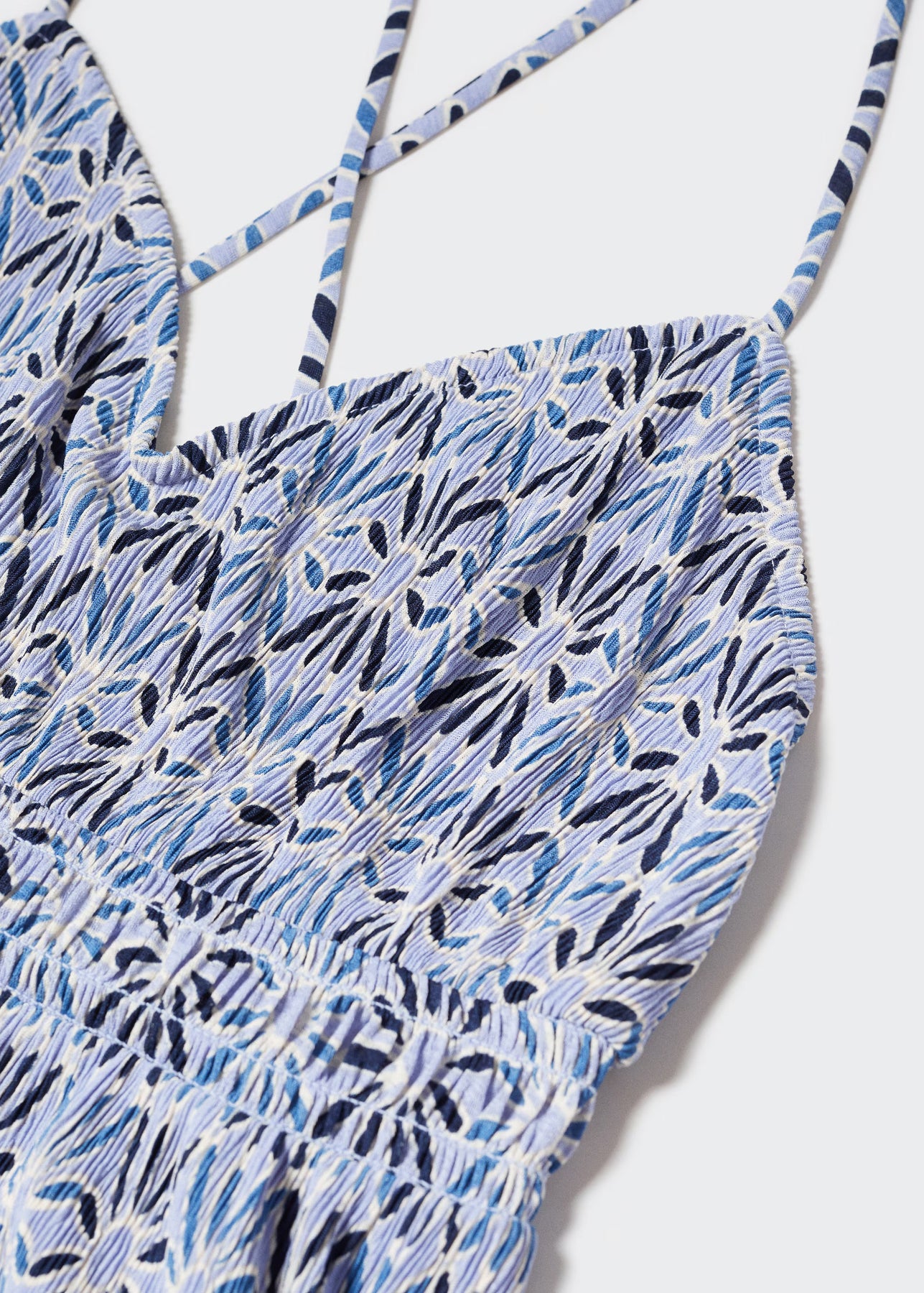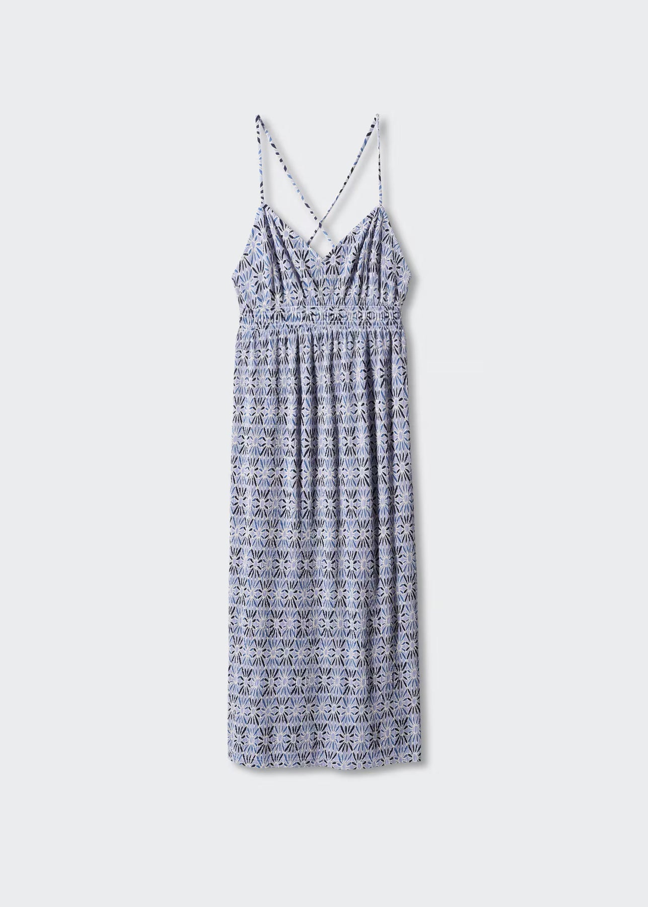 Tejido fluido. Tejido con textura. Diseño recto. Diseño midi. Diseño estampado. Cuello escotado. Tirantes finos. Tirantes cruzados en la espalda. Espalda con escote. Cintura con goma elástica. Sin cierre.