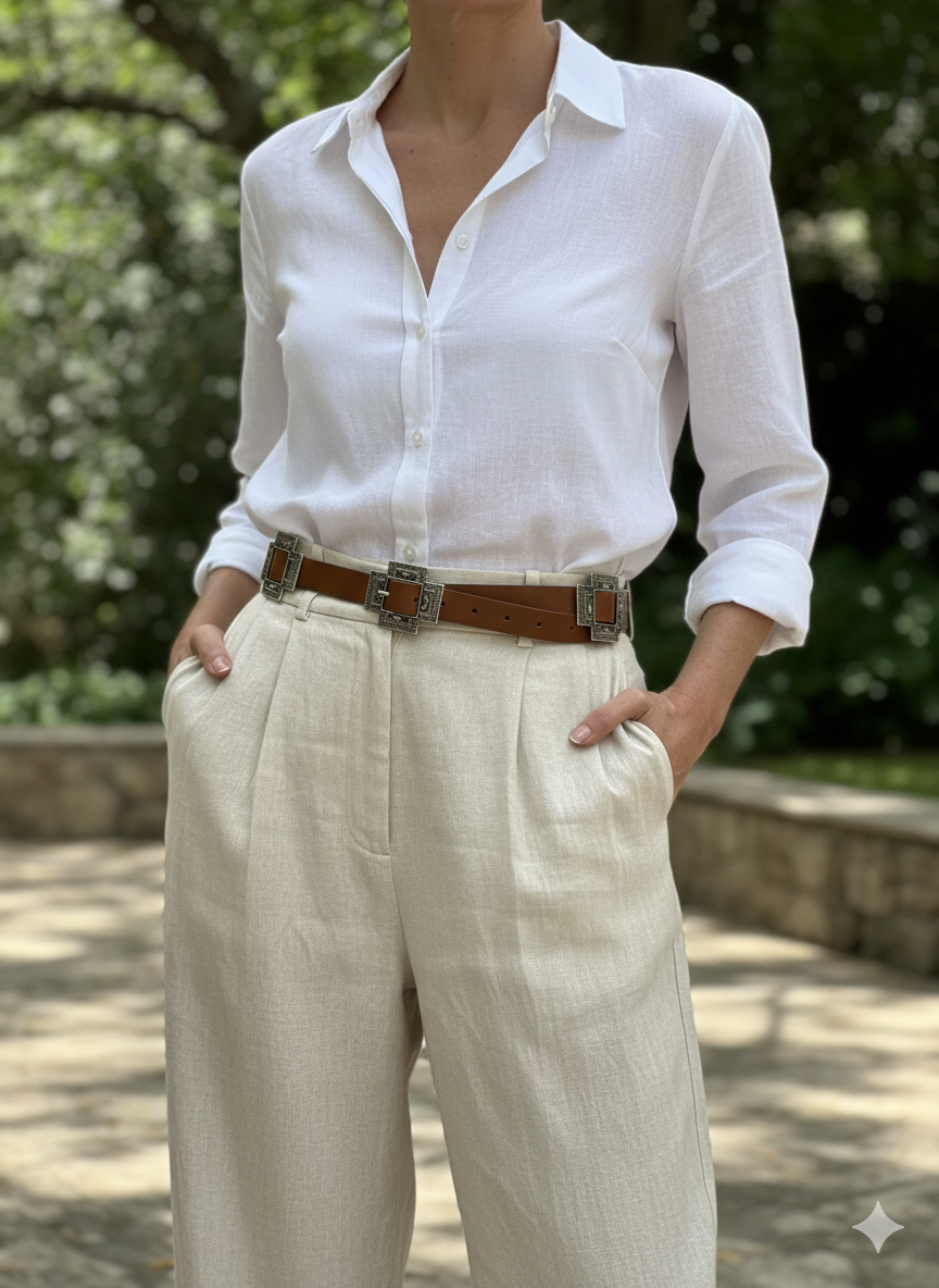 Este cinturón de 2.5 cm de ancho, elaborado en ecocuero, destaca por sus seis hebillas metálicas en forma de cruz con acabado plata envejecida. Diseñado para complementar faldas, vestidos y pantalones, aporta un aire sofisticado y elegante que realza cualquier conjunto con un detalle único y versátil.