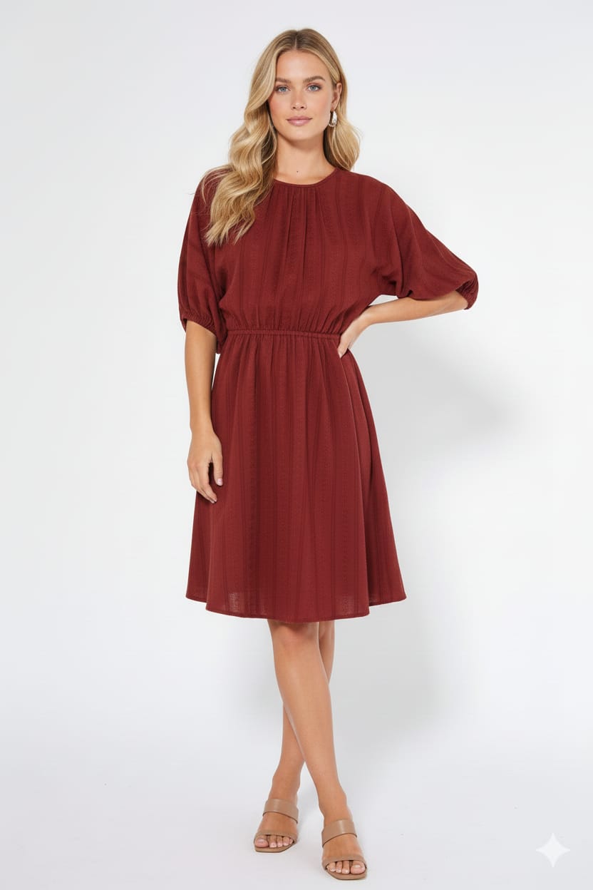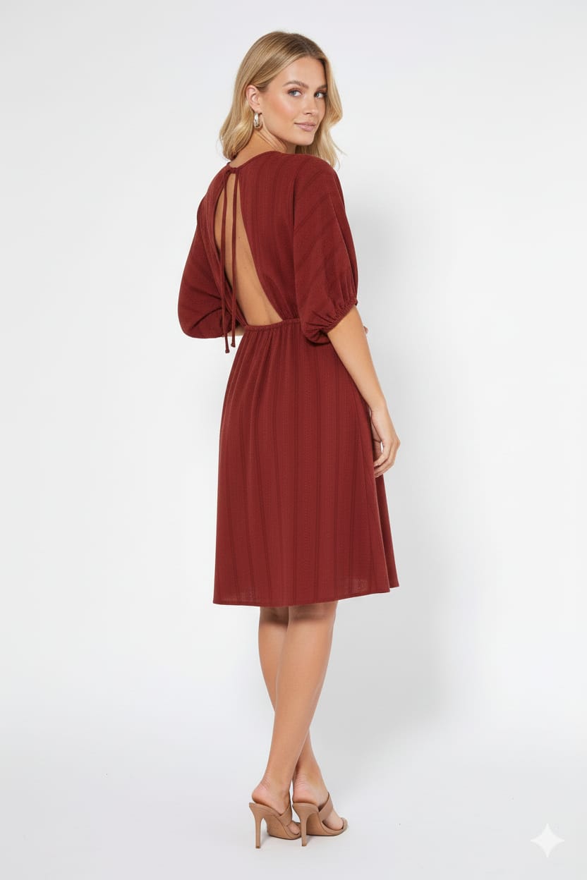 Vestido de manga 3/4s con volumen, con escote redondo, con abertura en la espalda, con goma en la cintura y con falda con vuelo.