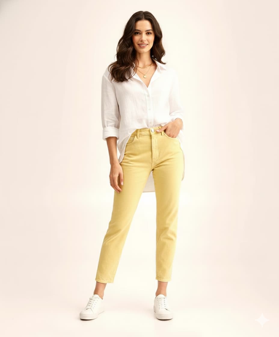 Tejido de algodón estilo tejano vaquero. Mom-fit. Tiro alto. Ankle brace. Trabillas. Cinco bolsillos. Cierre de cremallera y botón.