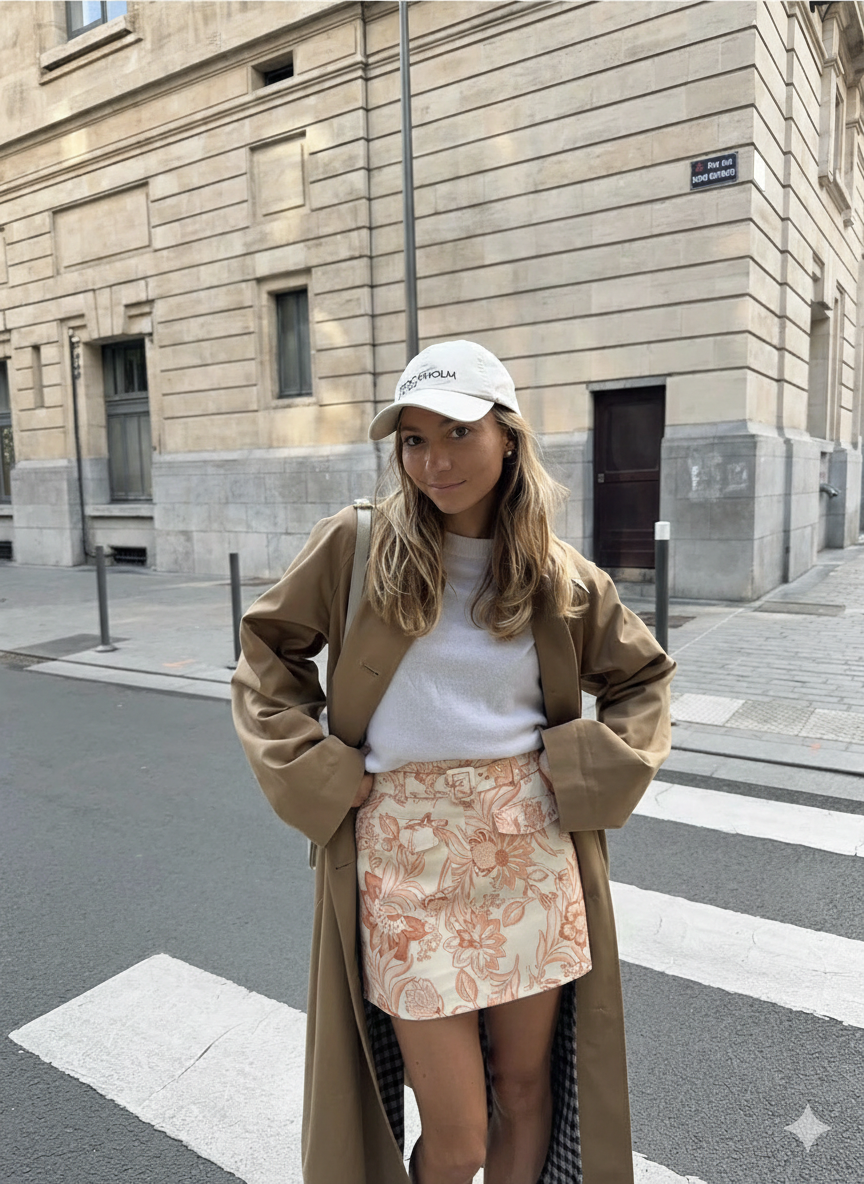 100% Algodón. Estampado floral. Diseño recto. Diseño corto. Tiro alto. Dos bolsillos de solapa en la parte frontal. Trabillas. Cinturón decorativo. Cierre de hebilla cuadrada. Cierre lateral de cremallera.