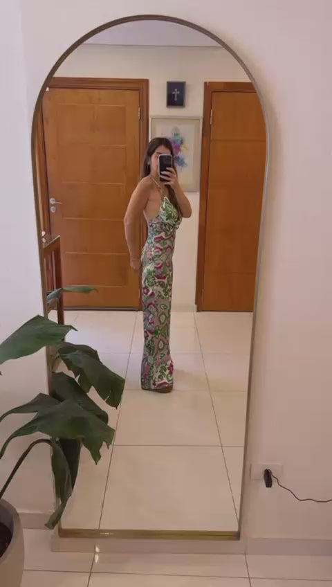 Tejido satinado. Tejido fluido. Diseño cruzado. Diseño recto. Diseño largo. Cuello cruzado. Tirantes finos triples. Tirantes cruzados en la espalda. Espalda abierta. Cierre lateral de cremallera.