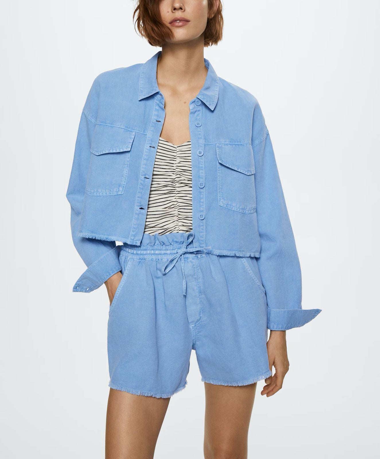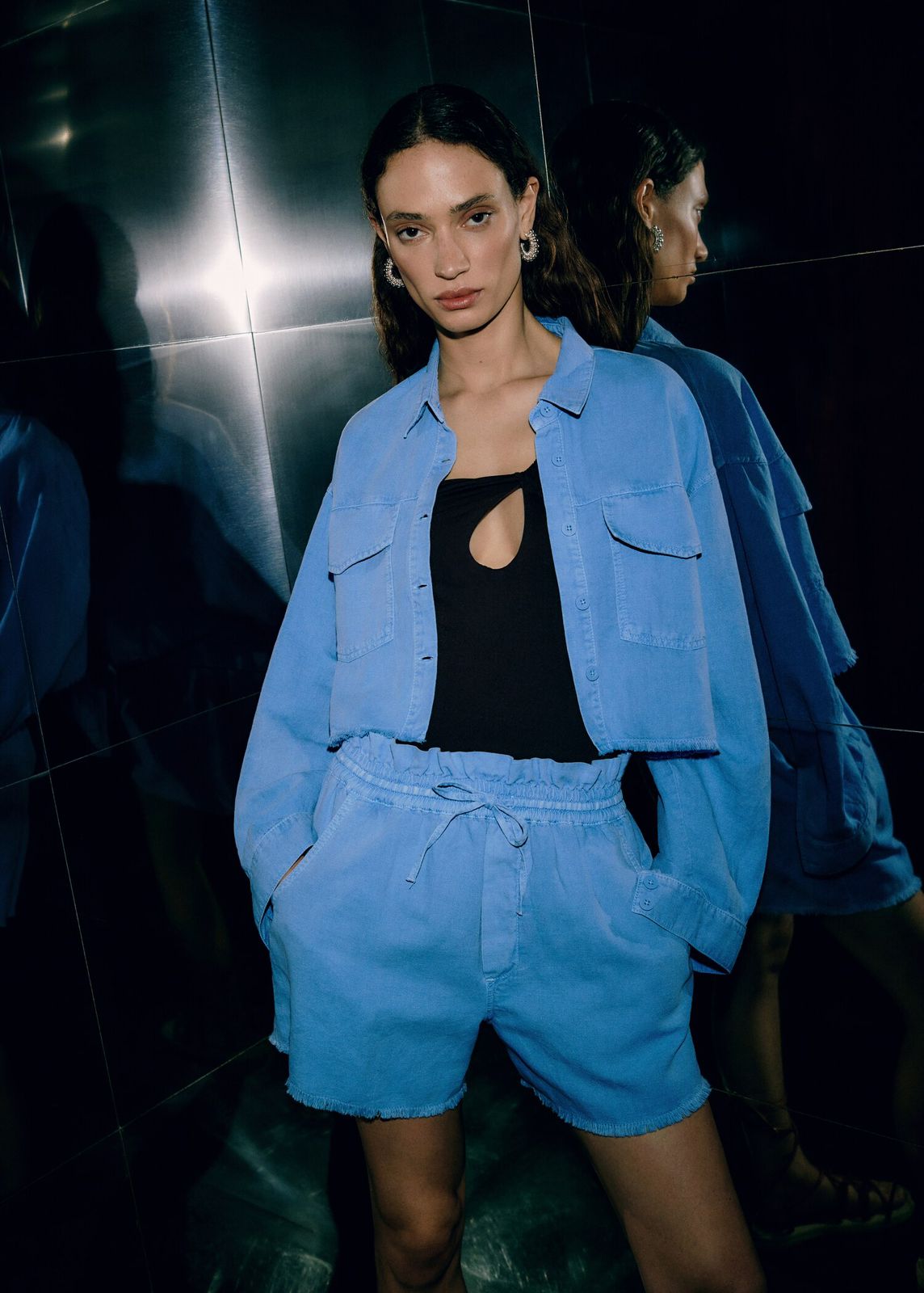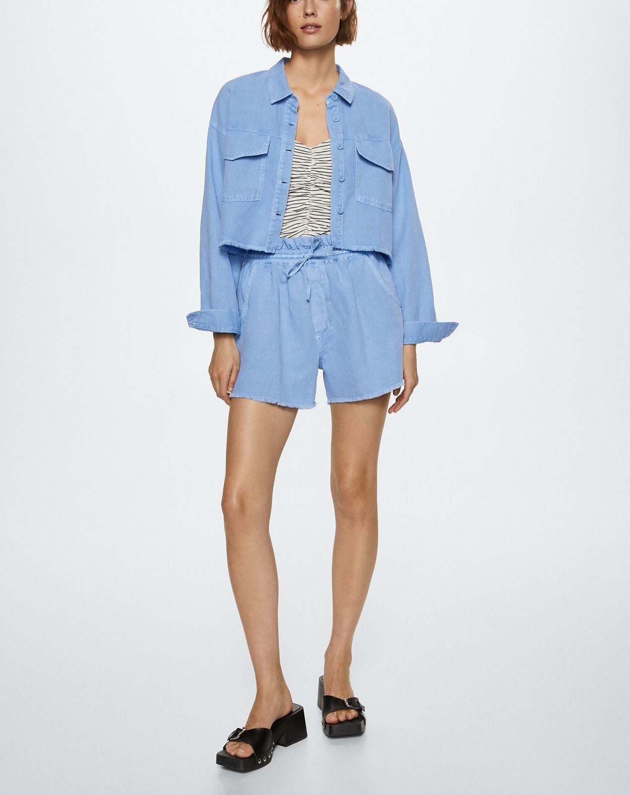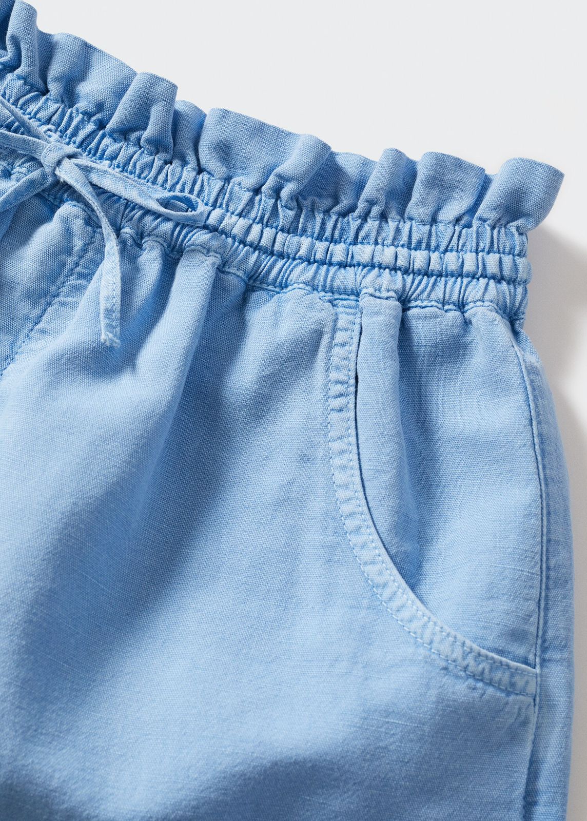 Tejido de lino. Diseño corto. Diseño recto. Paperbag. Tiro alto. Dos bolsillos laterales. Bolsillo de parche en la parte posterior. Terminaciones deshilachadas. Cintura elástica con cierre de lazo. Total look.