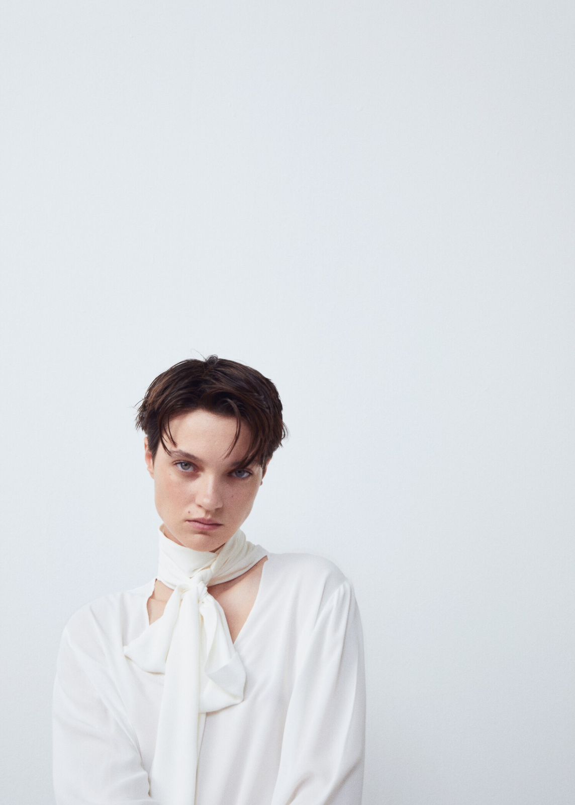 Tejido fluido. Diseño recto. Cuello pico. Lazo ajustable. Manga larga abotonada. Sin cierre. Bajo con aberturas laterales.