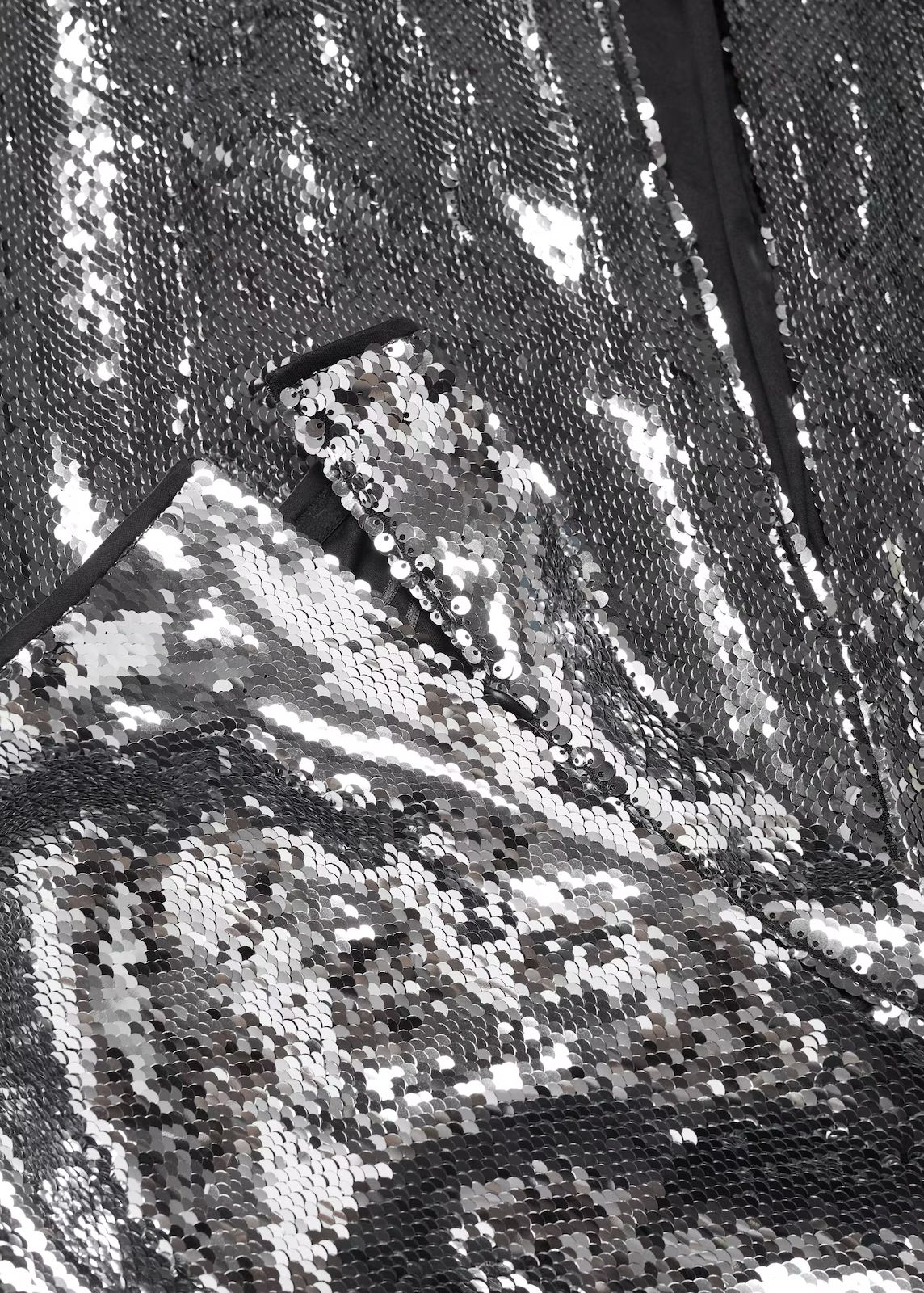 Tejido de lentejuelas, Diseño midi, Diseño entallado, Sin tirantes, Sin mangas, Cierre de cremallera lateral invisible, Bajo con abertura en la espalda, Forro interior, Colección para fiestas y eventos.